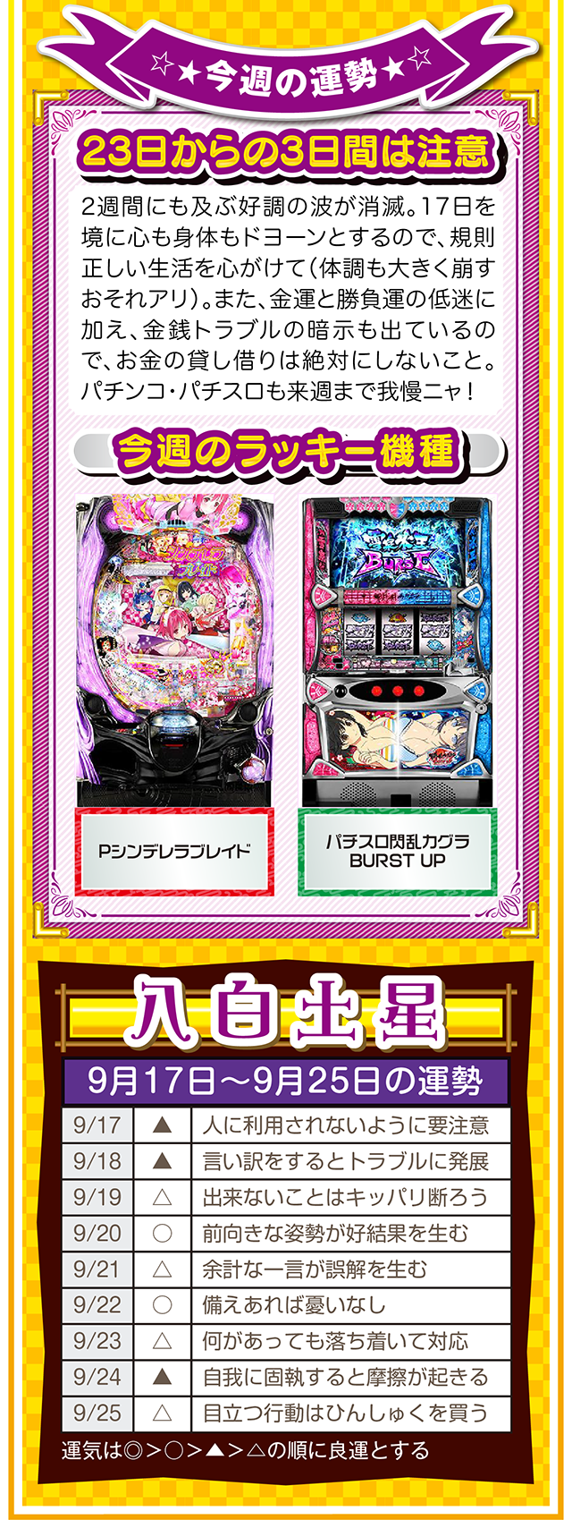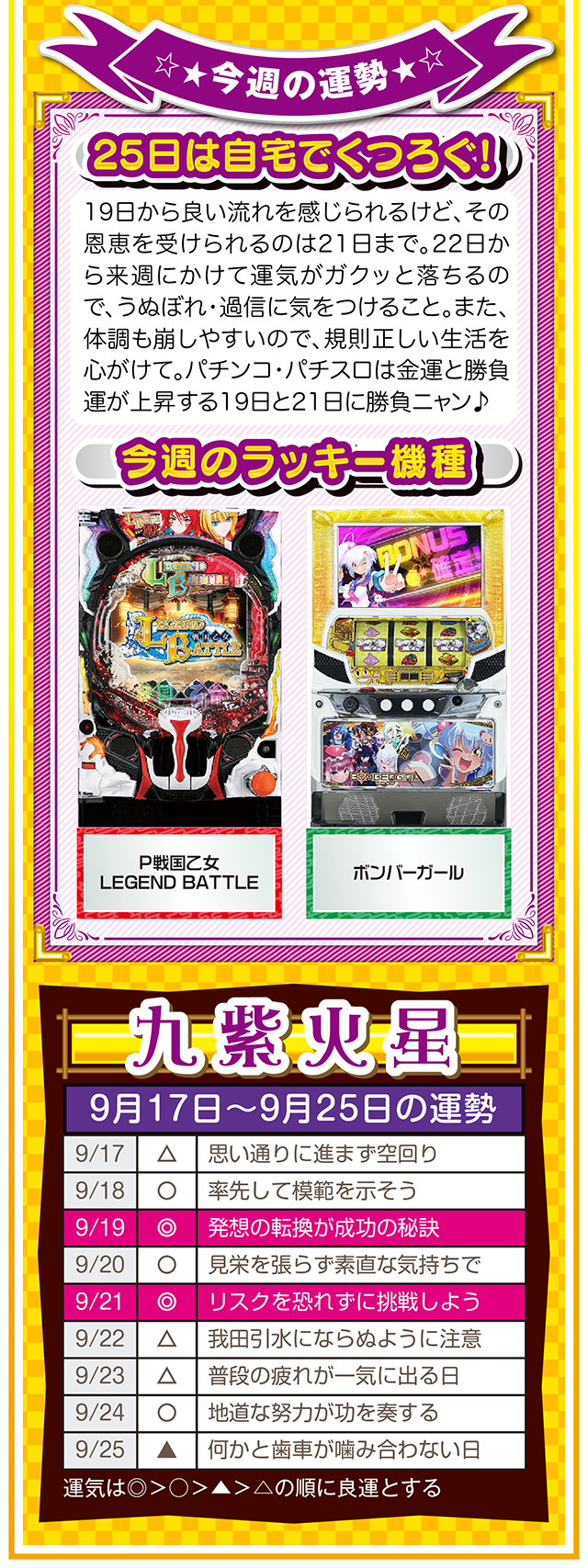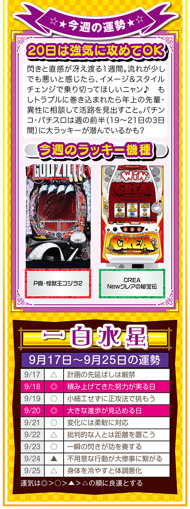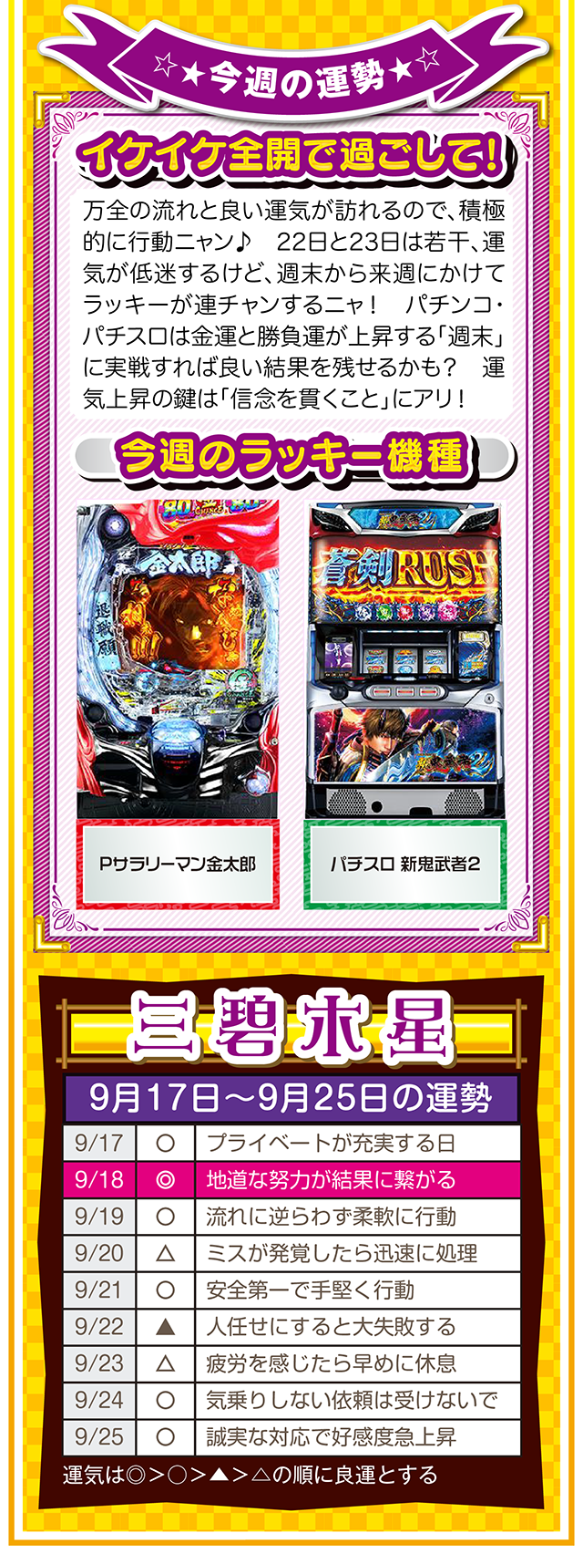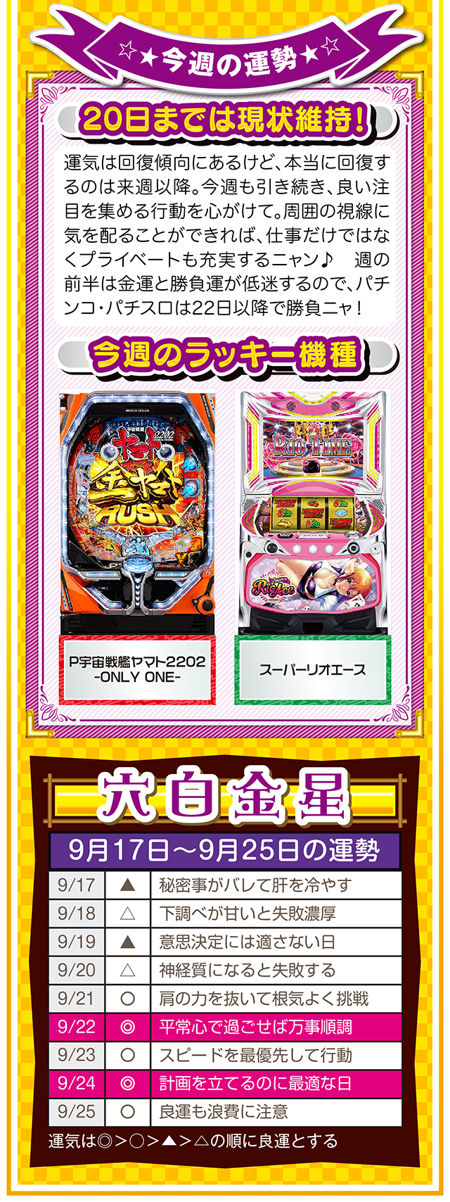 上手く進まない状況を楽しみつつ、不平不満と愚痴を未来への希望に繋げる。本当に頑張っている人に、運とかツキが味方することも覚えておいてほしいニャン。というわけで早速、9月19日から25日の1週間を鑑定ニャ(それでもマッチングアプリに登録する勇気がないフォー・チュンチュンが、今週もオマケとして17日と18日の運勢も鑑定したニャン♡)!