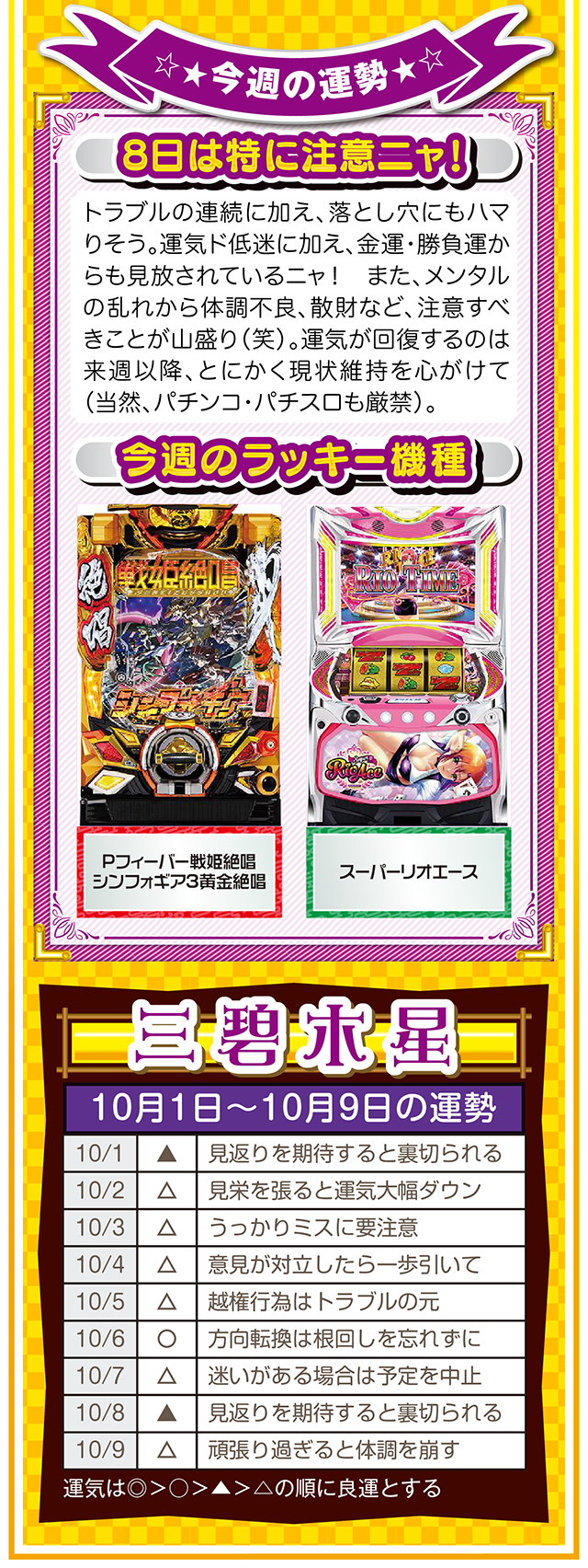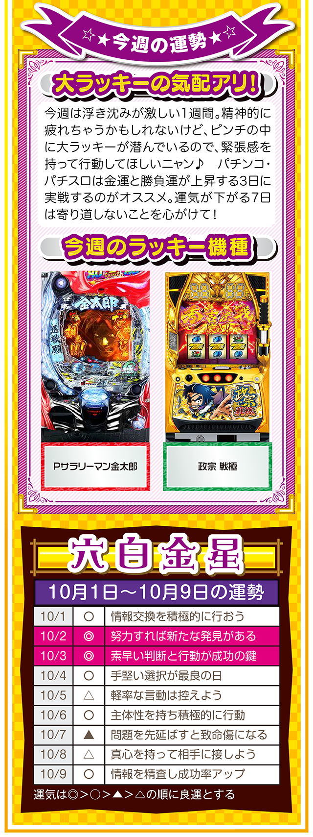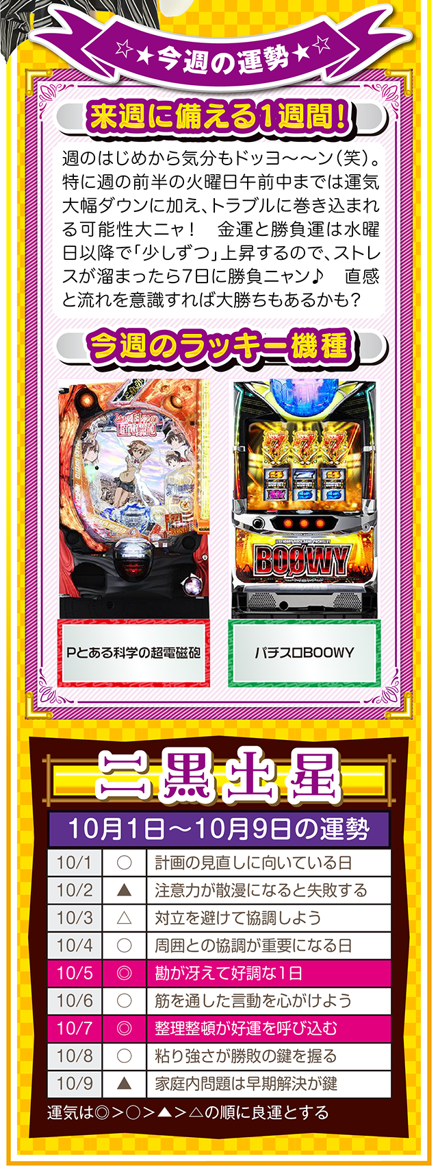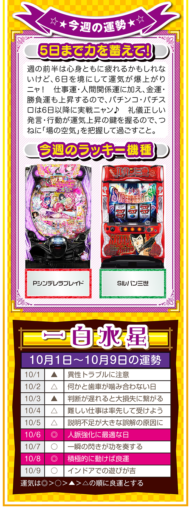 この文章を携帯で見ているアナタ…今すぐ友達に電話して遊びに出掛けてほしいニャン♪ というわけで早速、10月3日から9日の1週間を鑑定ニャ(恋愛に関しては兵法をキッチリと参考にするフォー・チュンチュンが、今週もオマケとして1日と2日の運勢も鑑定したニャン♡)!