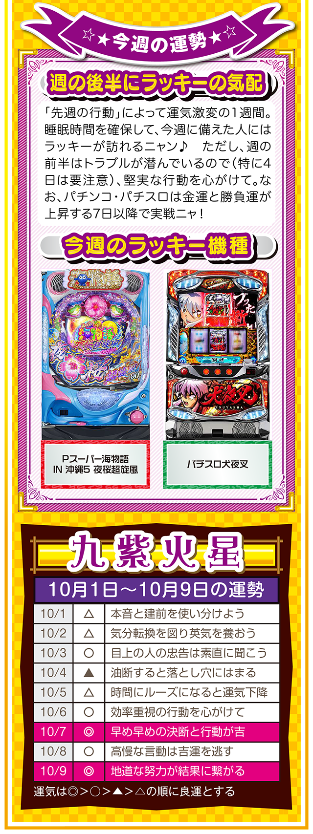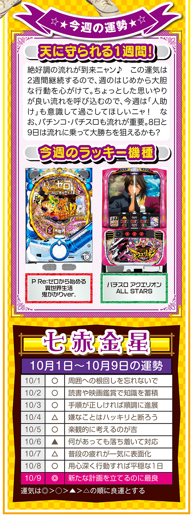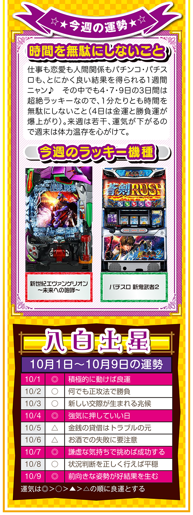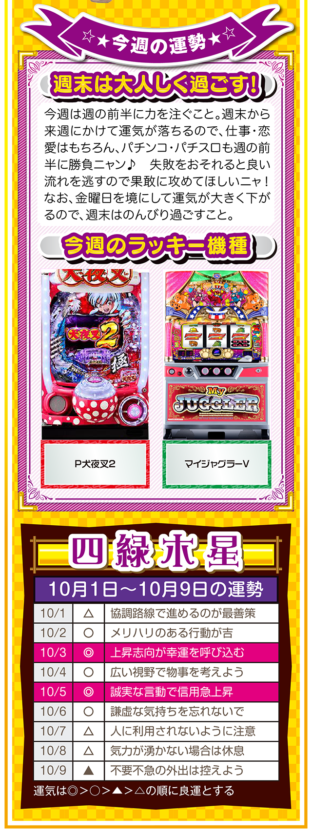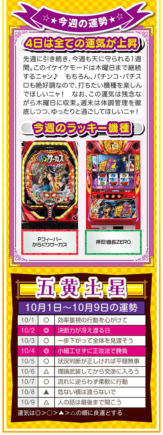 この文章を携帯で見ているアナタ…今すぐ友達に電話して遊びに出掛けてほしいニャン♪ というわけで早速、10月3日から9日の1週間を鑑定ニャ(恋愛に関しては兵法をキッチリと参考にするフォー・チュンチュンが、今週もオマケとして1日と2日の運勢も鑑定したニャン♡)!