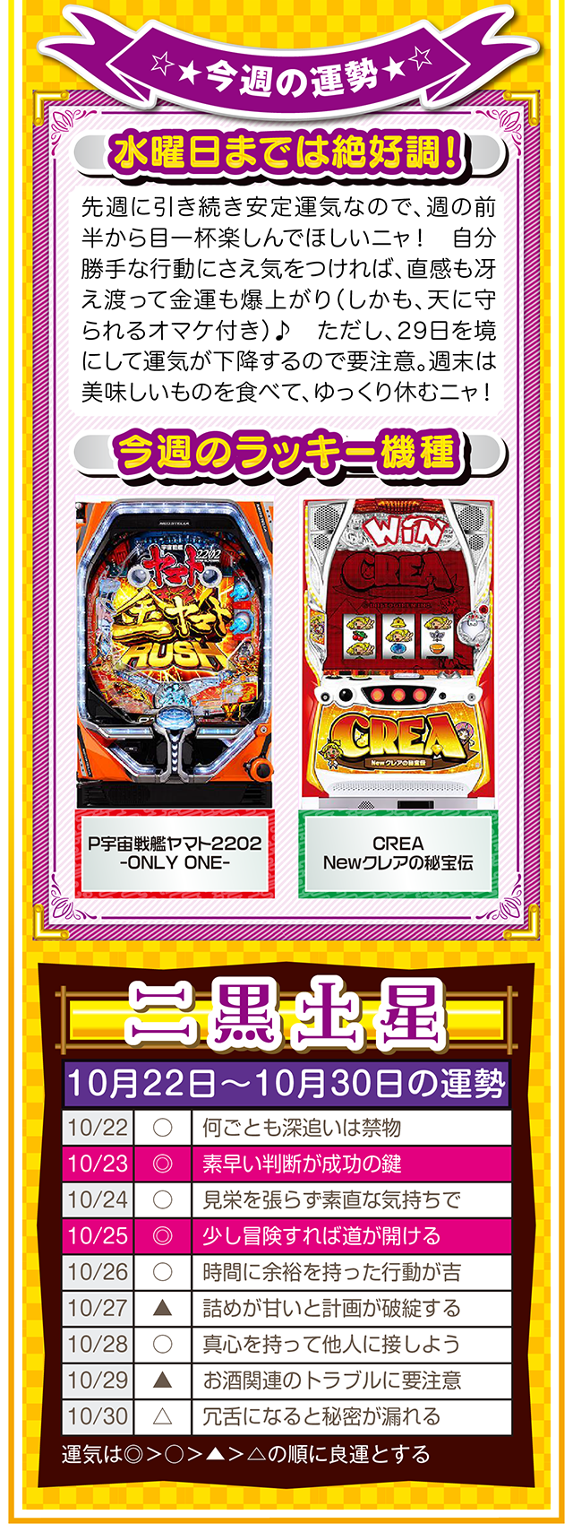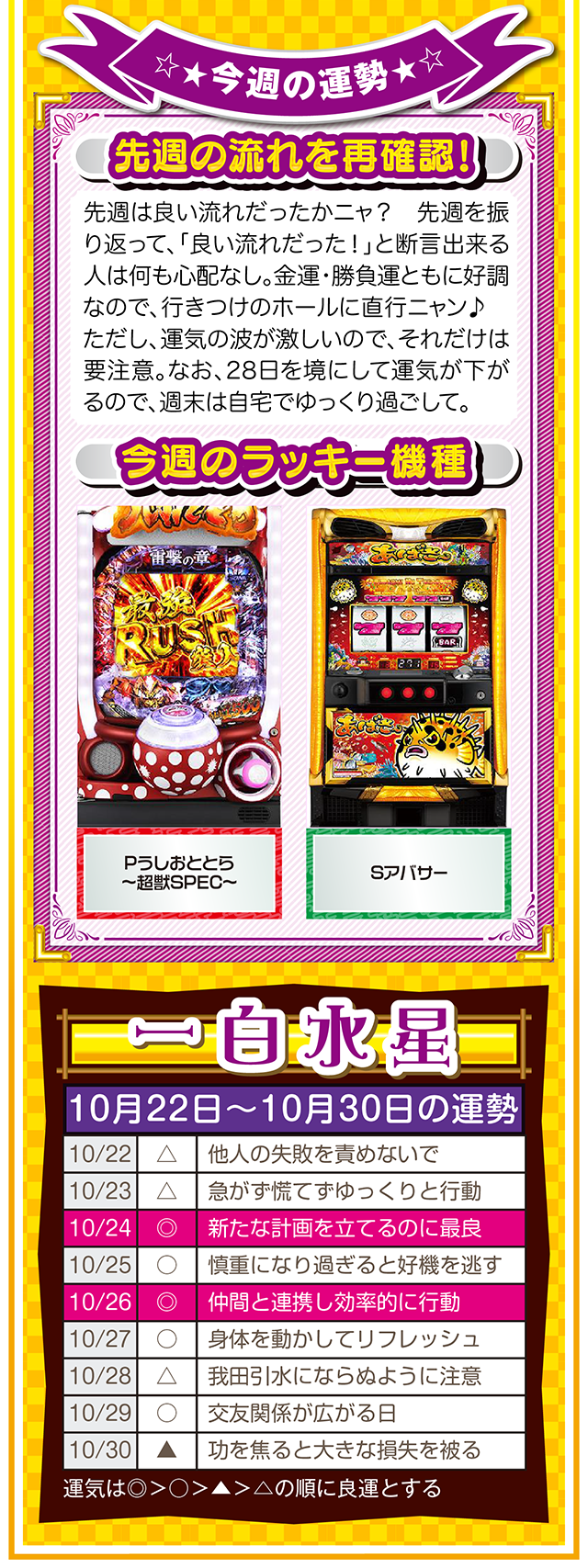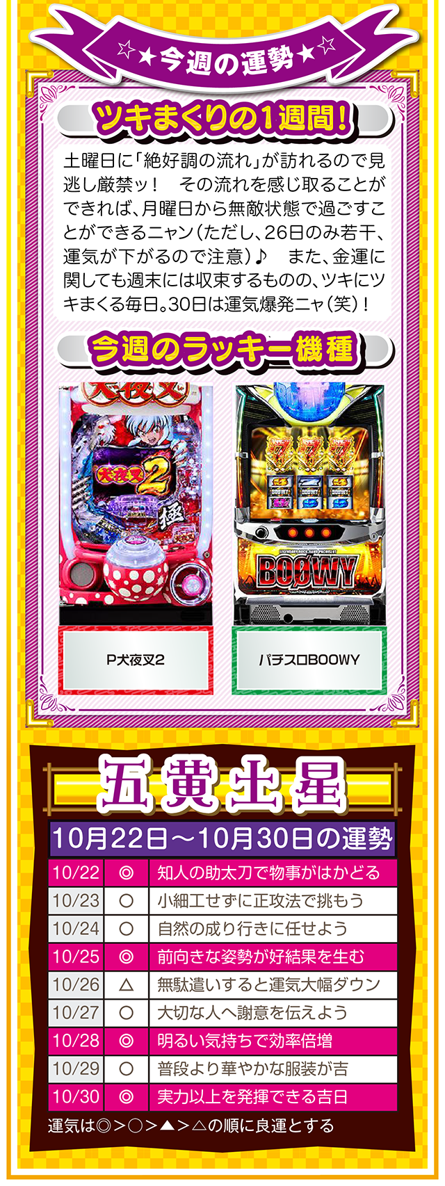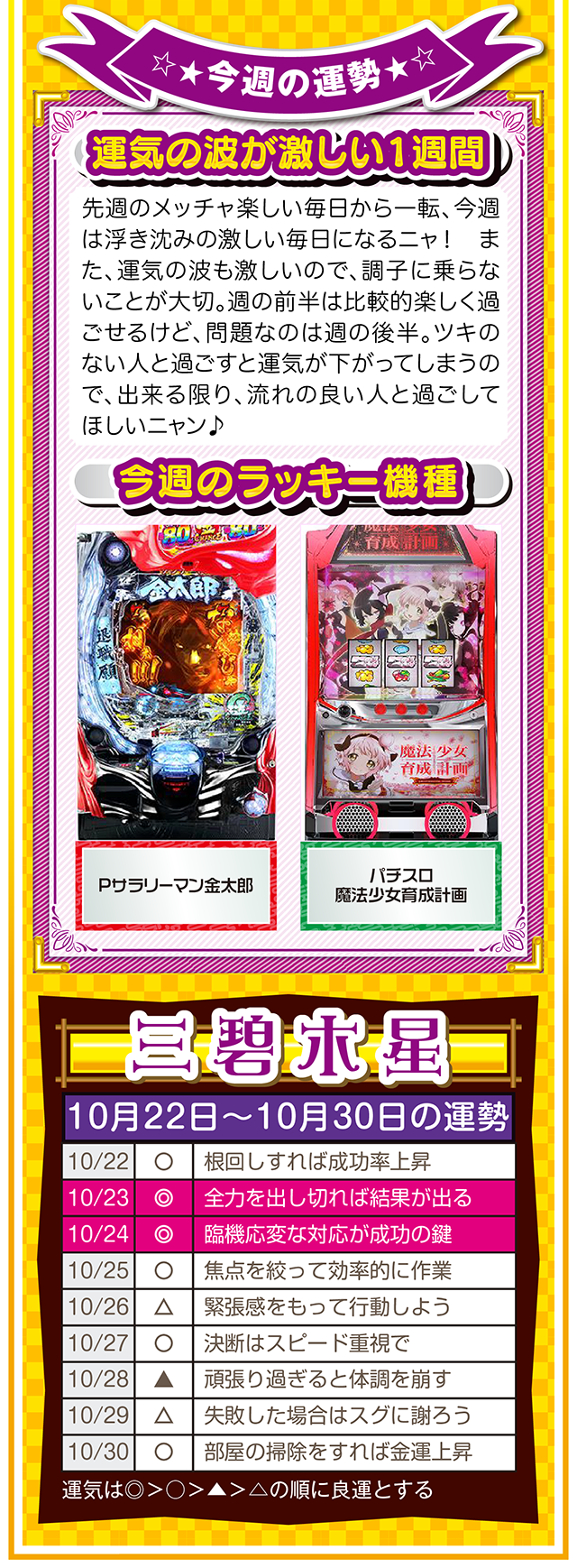 ただ確実に言えることは、この瞬間も私たちは命の時間を削っている。だから恐れることなく、前へ前へと一歩踏み出すニャン♪ というわけで早速、10月24日から30日の1週間を鑑定ニャ(気付けばとっくにアラフォーで自分の時間ばかりが増え続けるフォー・チュンチュンが、今週もオマケとして22日と23日の運勢も鑑定したニャン♡)!