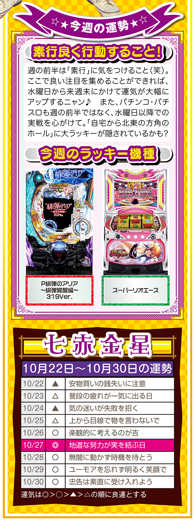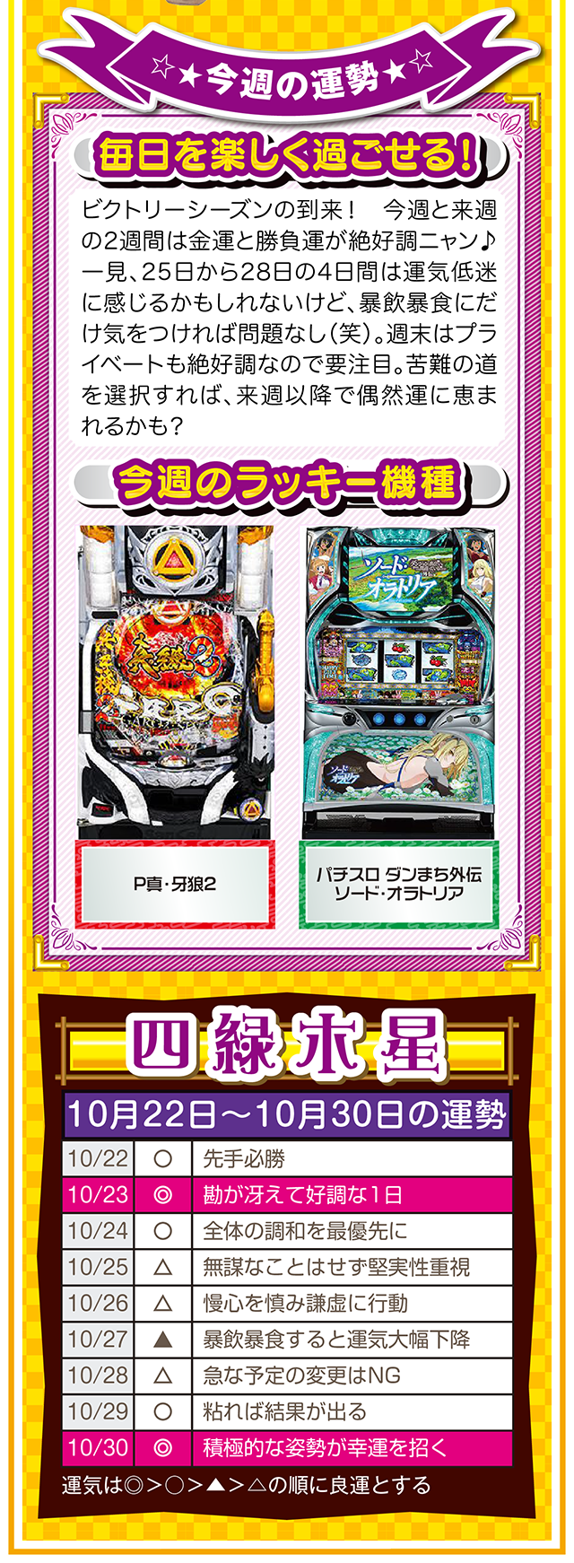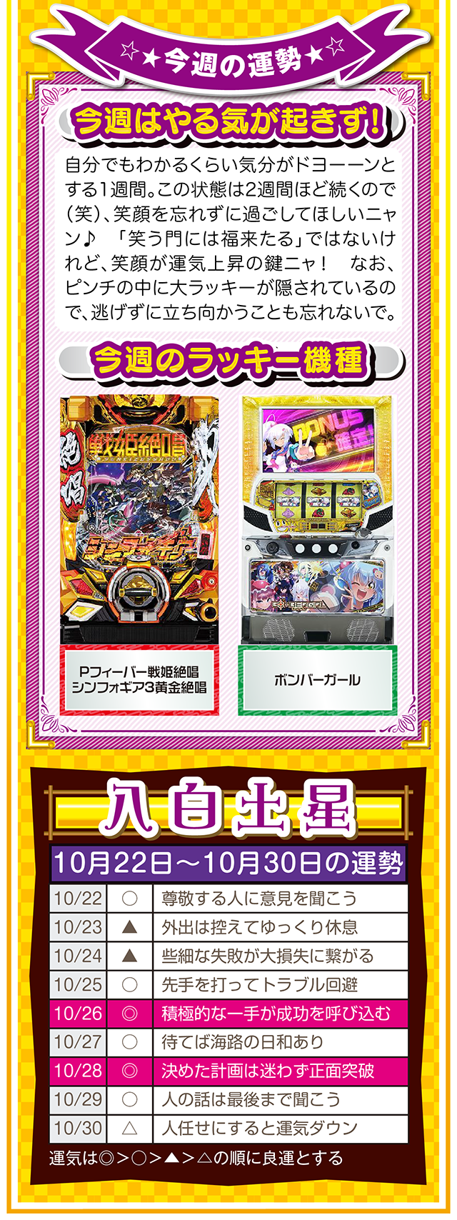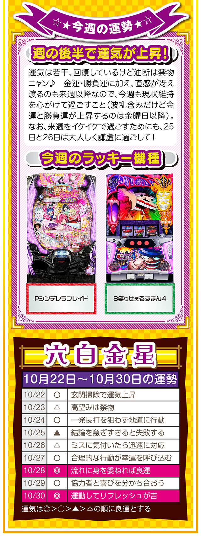 ただ確実に言えることは、この瞬間も私たちは命の時間を削っている。だから恐れることなく、前へ前へと一歩踏み出すニャン♪ というわけで早速、10月24日から30日の1週間を鑑定ニャ(気付けばとっくにアラフォーで自分の時間ばかりが増え続けるフォー・チュンチュンが、今週もオマケとして22日と23日の運勢も鑑定したニャン♡)!