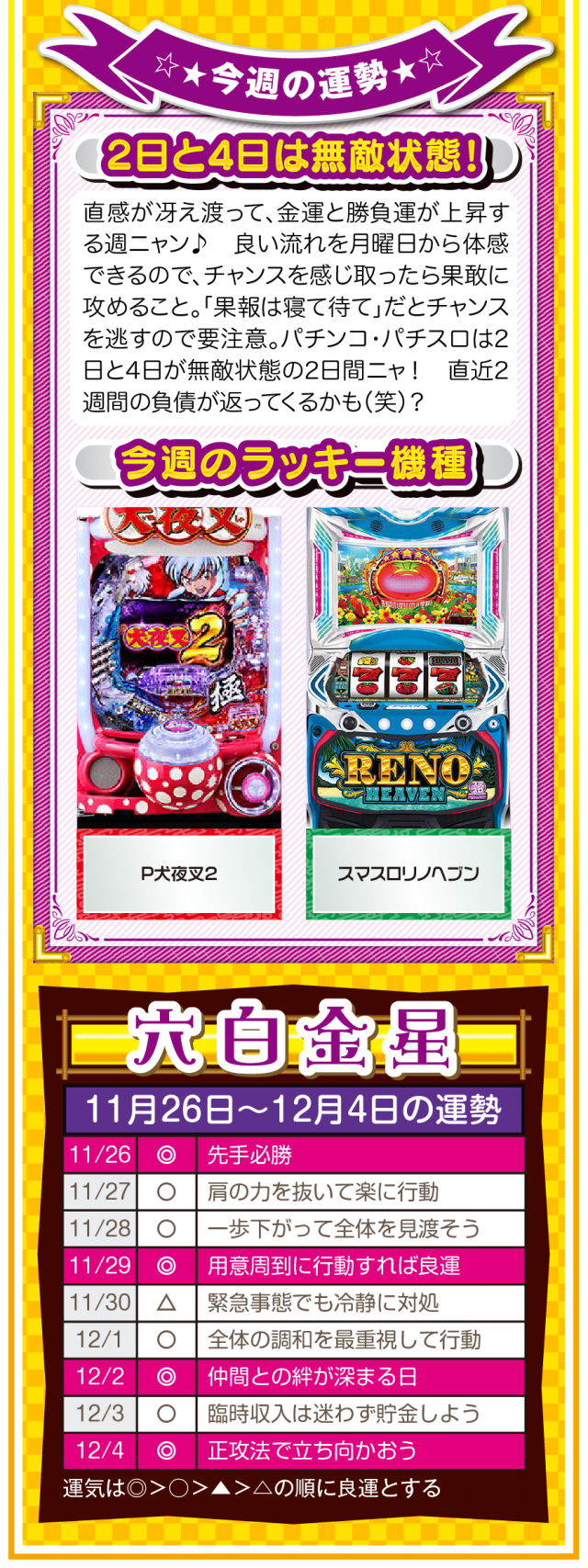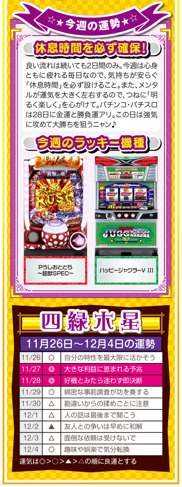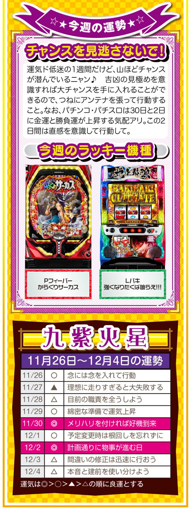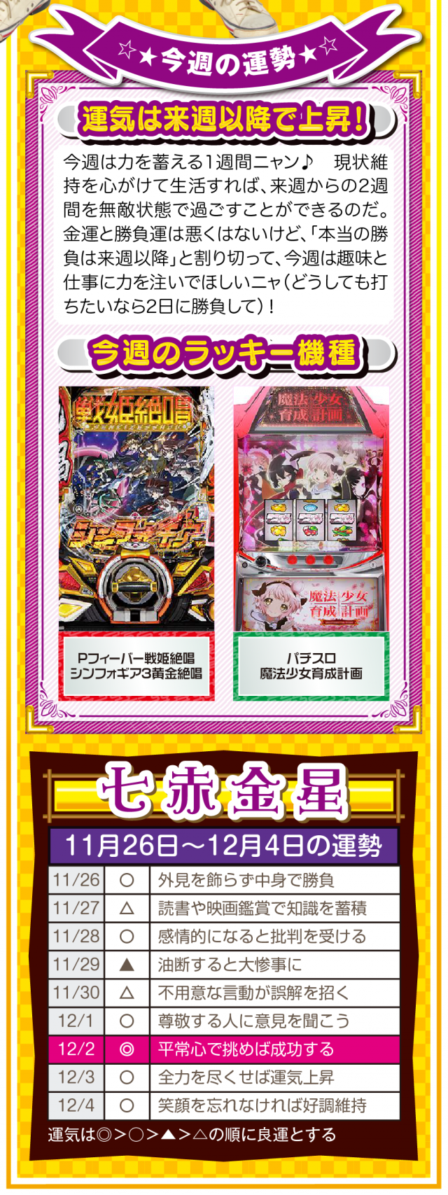 変えられるものを変えて、自分自身を肯定する。運とかツキに愛される人は、「自分自身を肯定できる人」ということを覚えておいてほしいニャン♪ というわけで早速、11月28日から12月4日の1週間を鑑定ニャ(料理は得意だし彼氏にも尽くすのにザ・独身のフォー・チュンチュンが、オマケとして11月26日と27日の運勢も鑑定したニャン♡)!