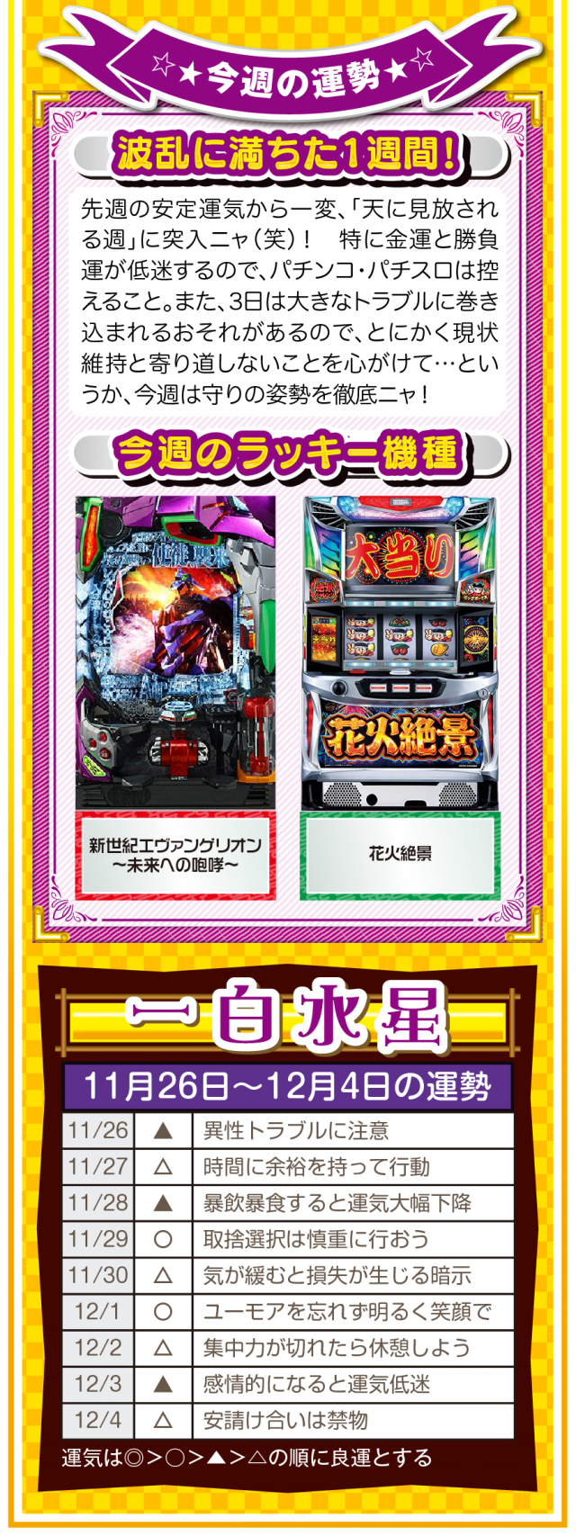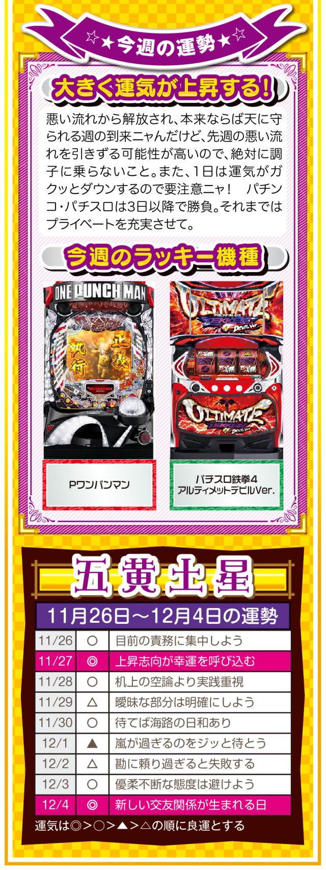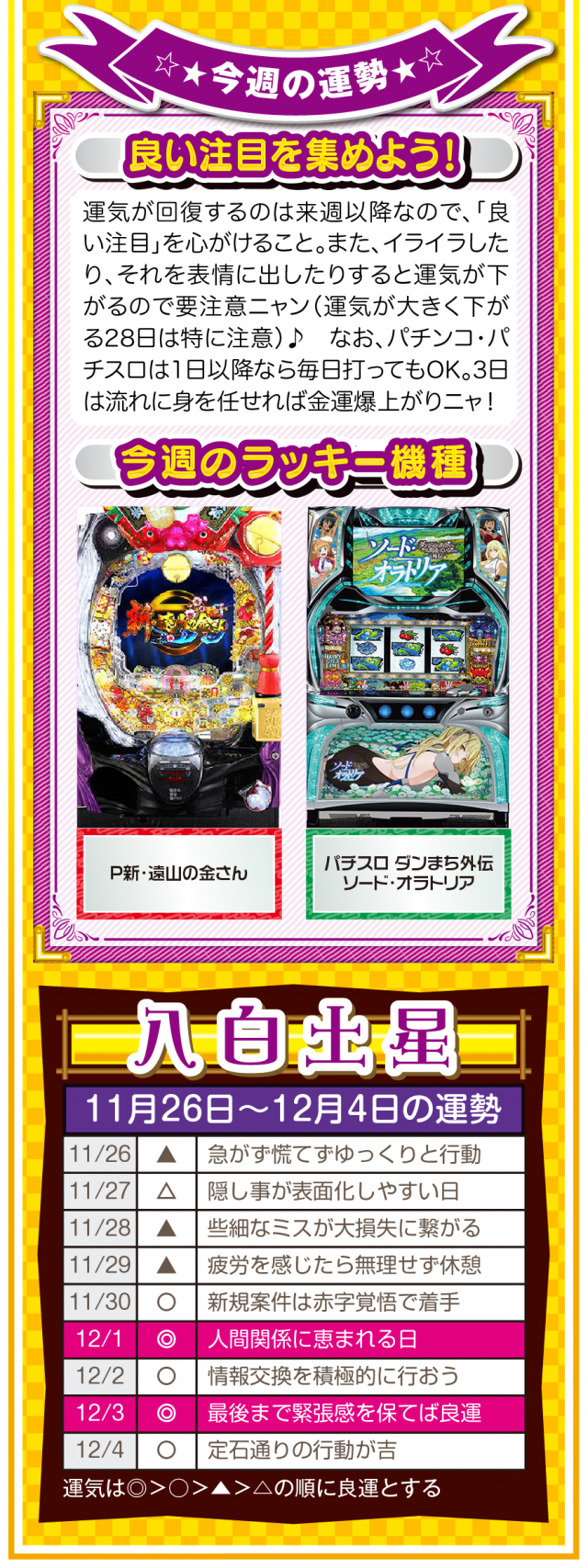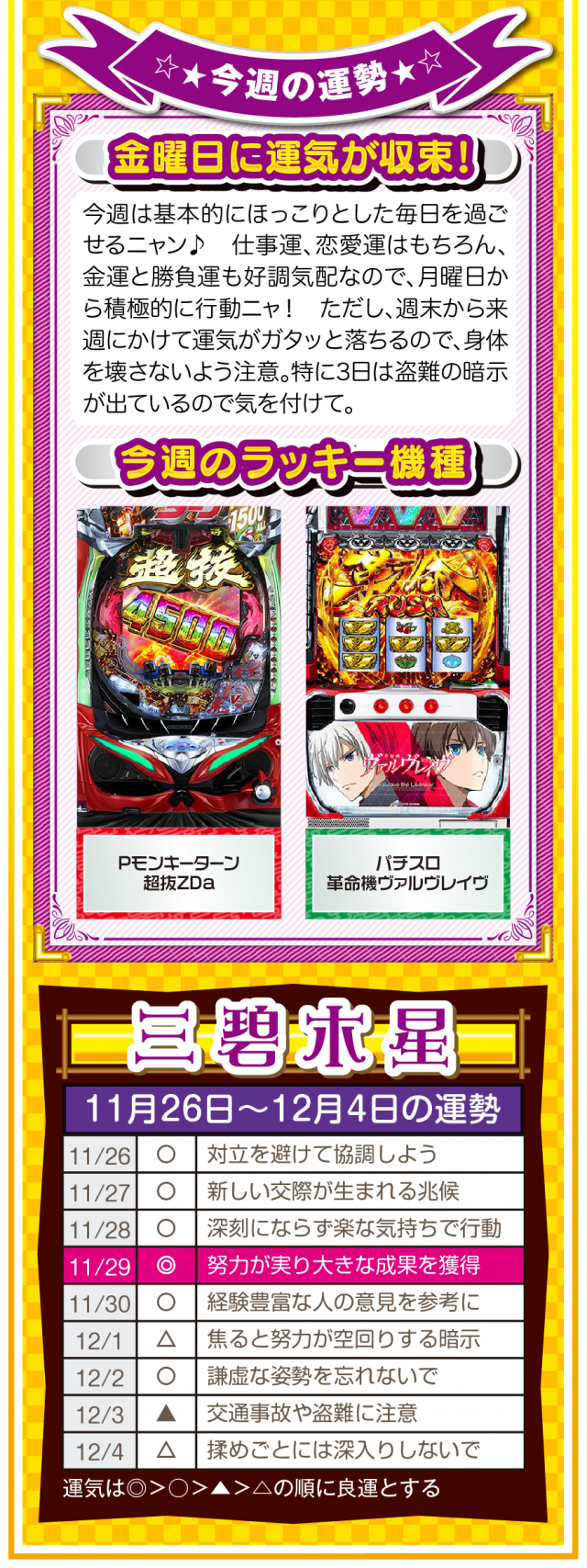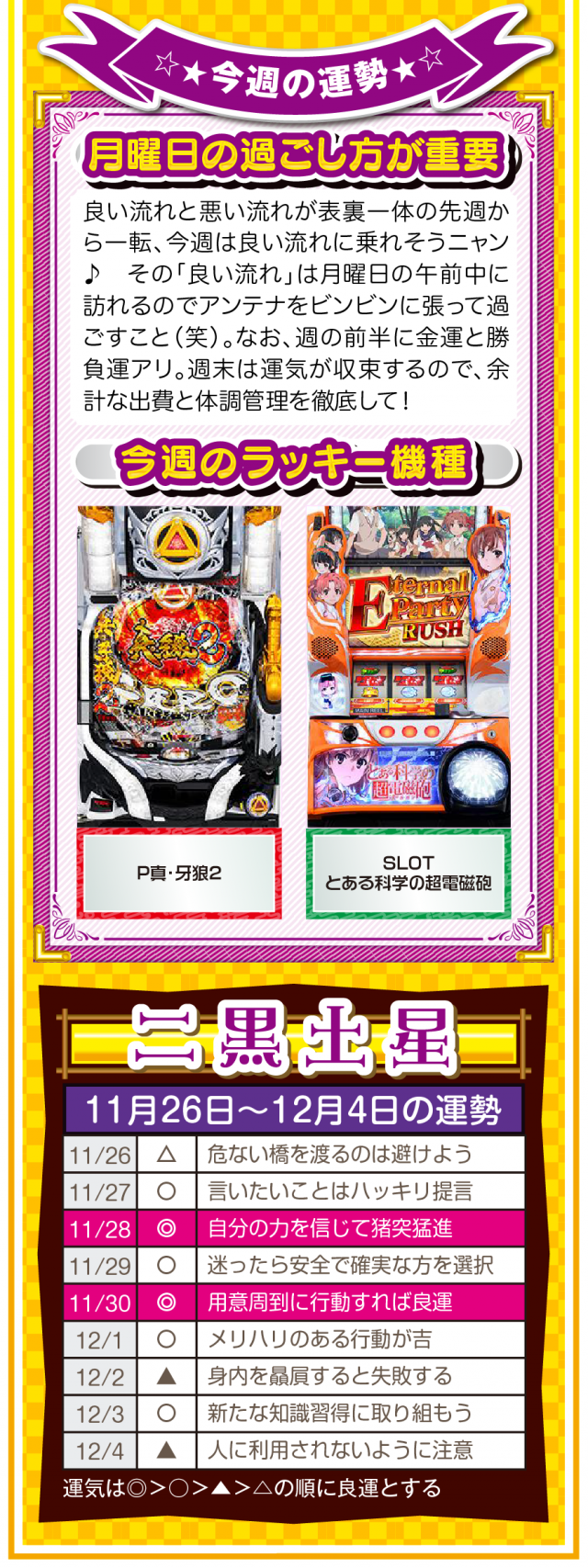 変えられるものを変えて、自分自身を肯定する。運とかツキに愛される人は、「自分自身を肯定できる人」ということを覚えておいてほしいニャン♪ というわけで早速、11月28日から12月4日の1週間を鑑定ニャ(料理は得意だし彼氏にも尽くすのにザ・独身のフォー・チュンチュンが、オマケとして11月26日と27日の運勢も鑑定したニャン♡)!