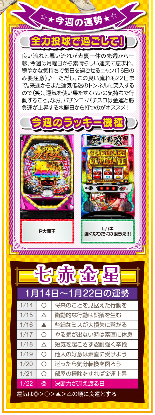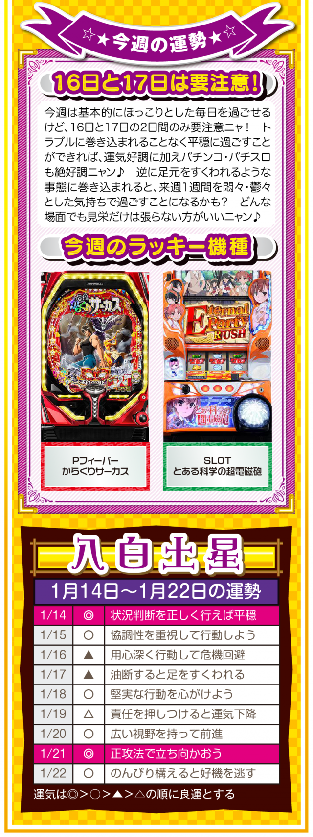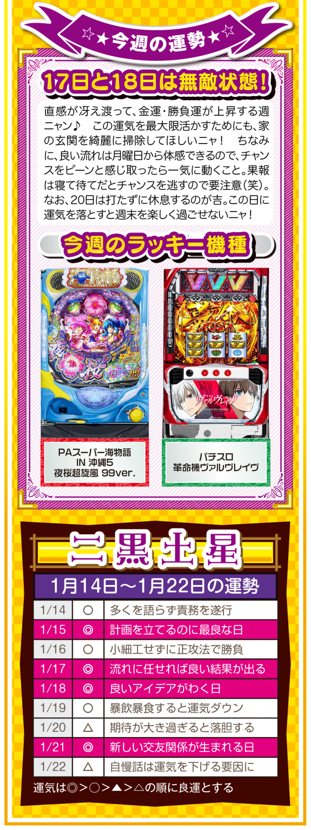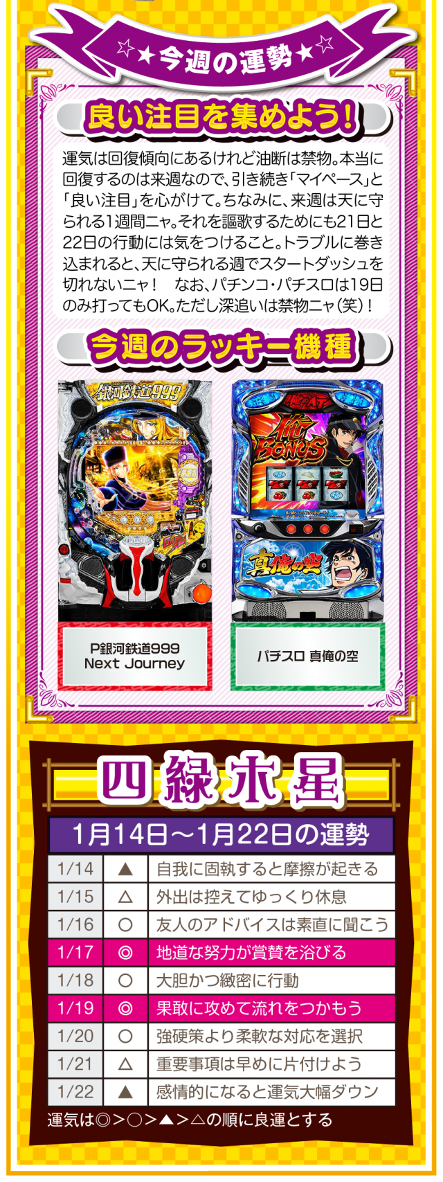 下に書かれているのは今週のラッキーアイテム。そのラッキーアイテムに対して何を考え、どんな意味があるのかを考えれば、ツキとか流れをつかみやすくなるニャン♪