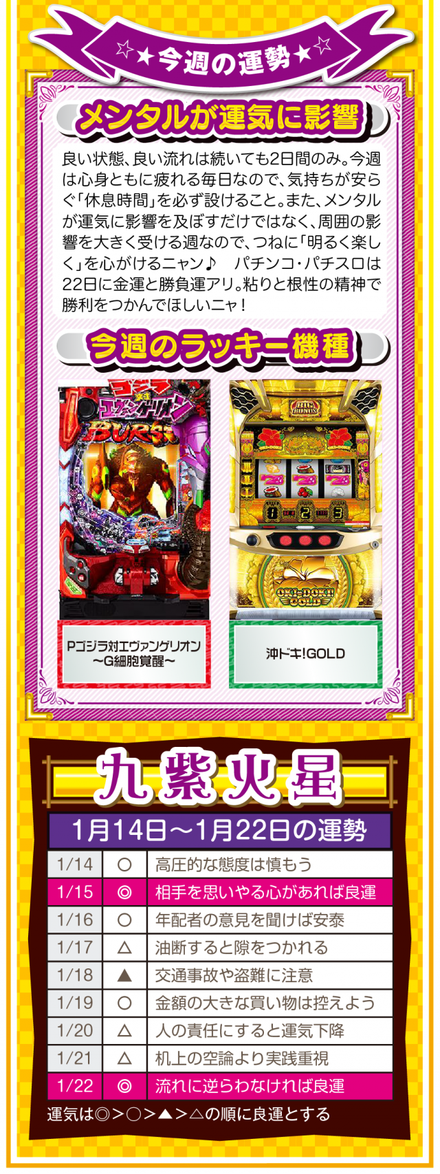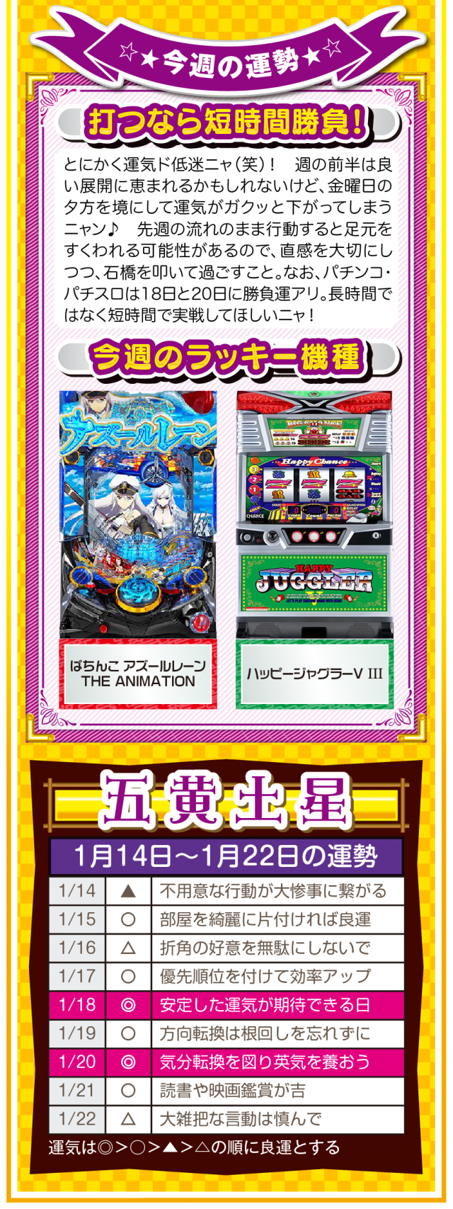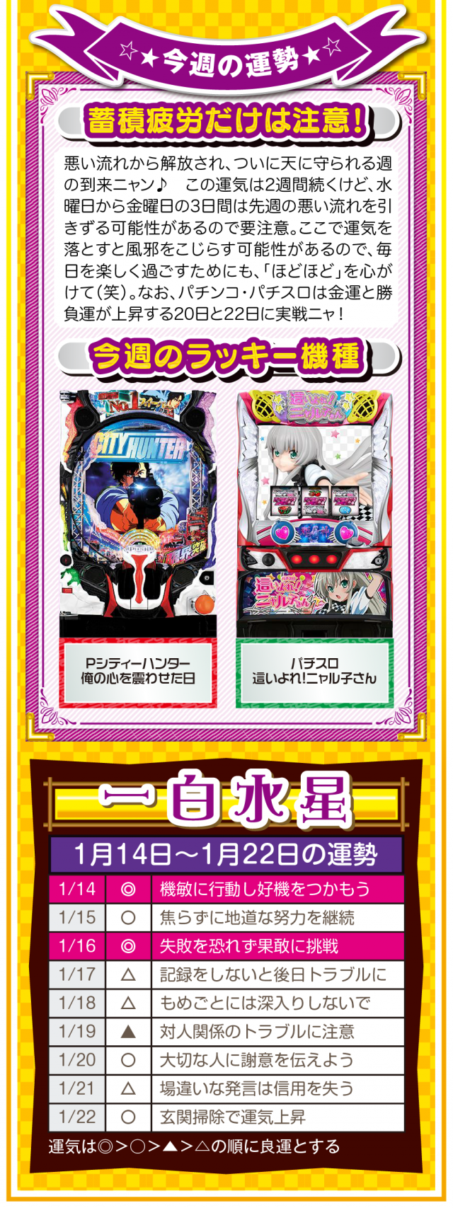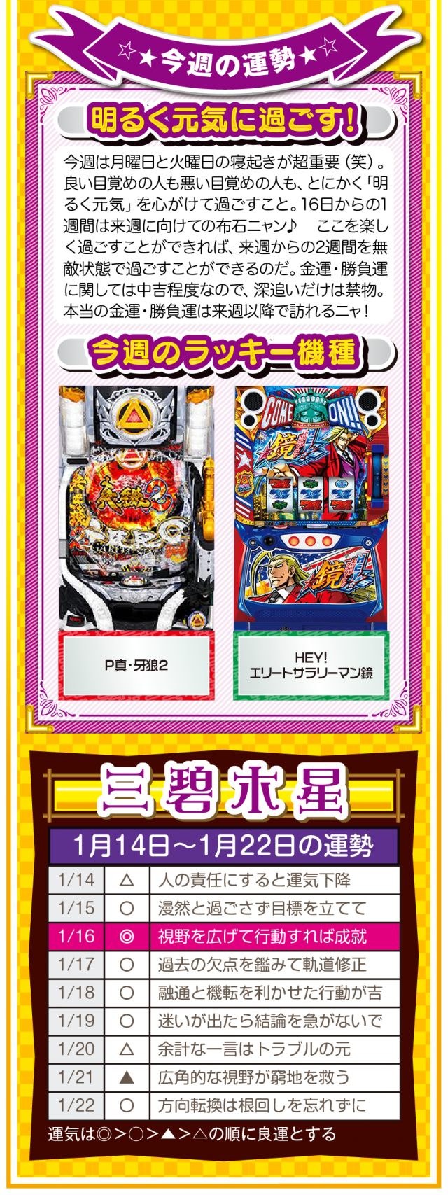下に書かれているのは今週のラッキーアイテム。そのラッキーアイテムに対して何を考え、どんな意味があるのかを考えれば、ツキとか流れをつかみやすくなるニャン♪