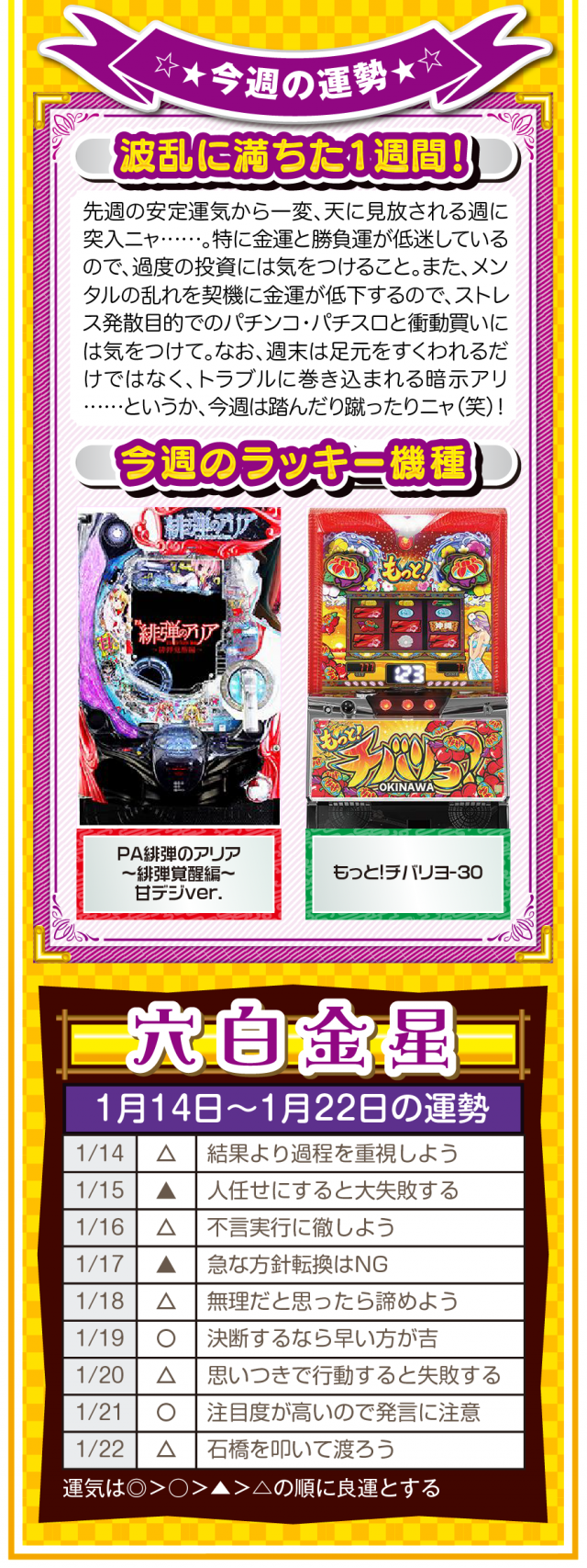 単に「ラッキーアイテムを身につければ運気が上がる」ではなく、「ちょっとだけ深く考える」ことが重要。せっかくのラッキーアイテムを無駄にせず、良い運気をつかむ努力を忘れないでほしいニャン♪ というわけで早速、1月16日から22日の1週間を鑑定ニャ(星占いのラッキーアイテムだけは全否定したいフォー・チュンチュンが、オマケとして14日と15日の運勢も鑑定したニャン♡)!