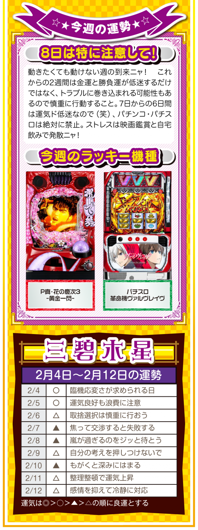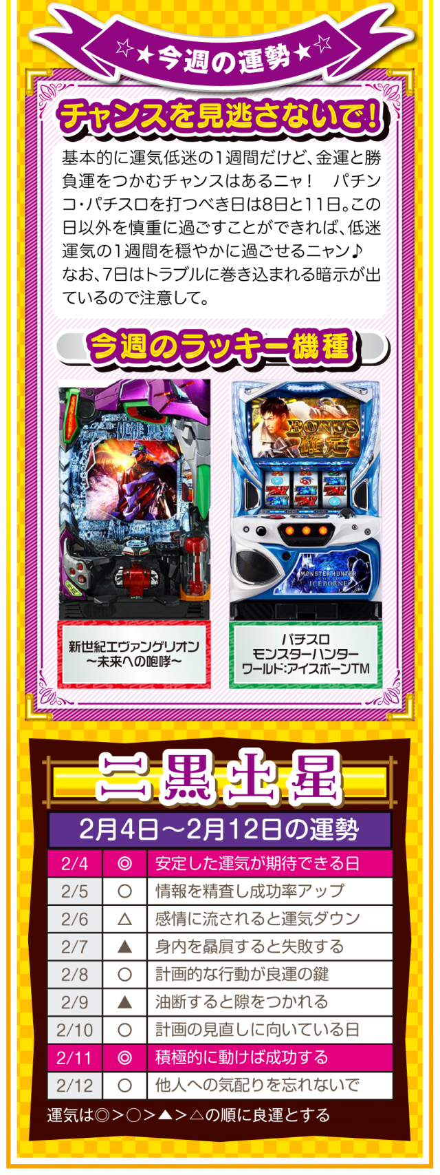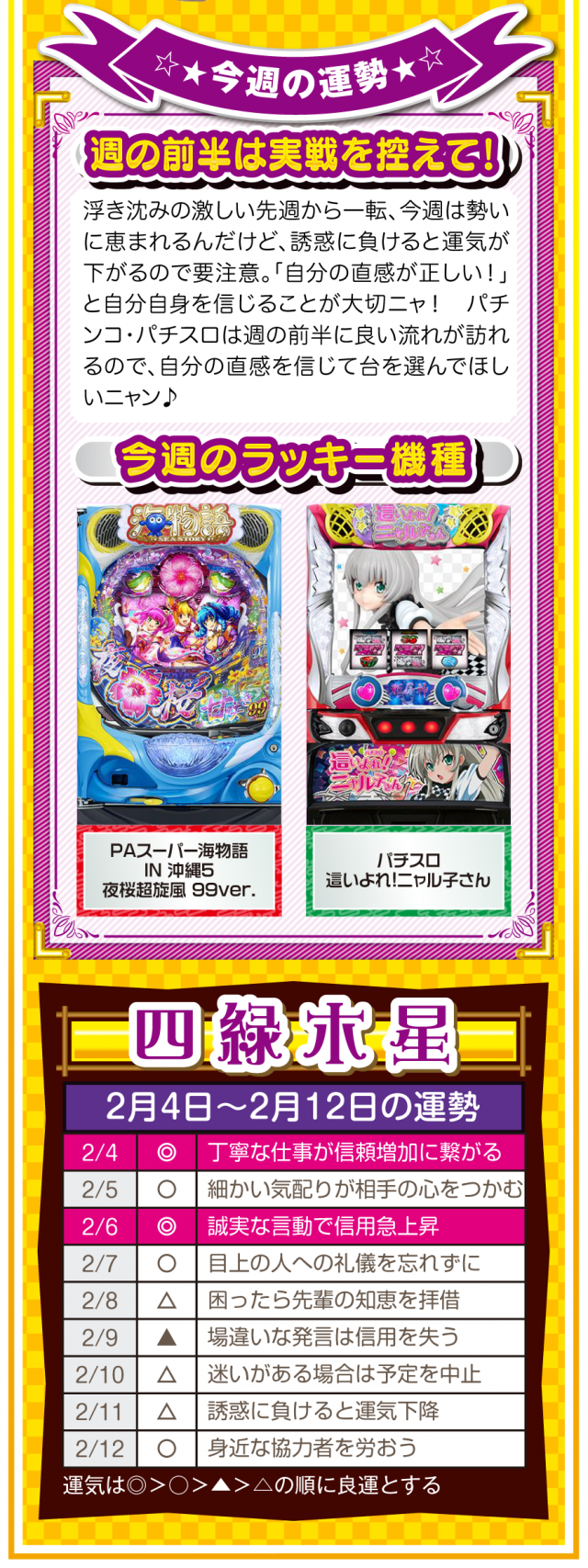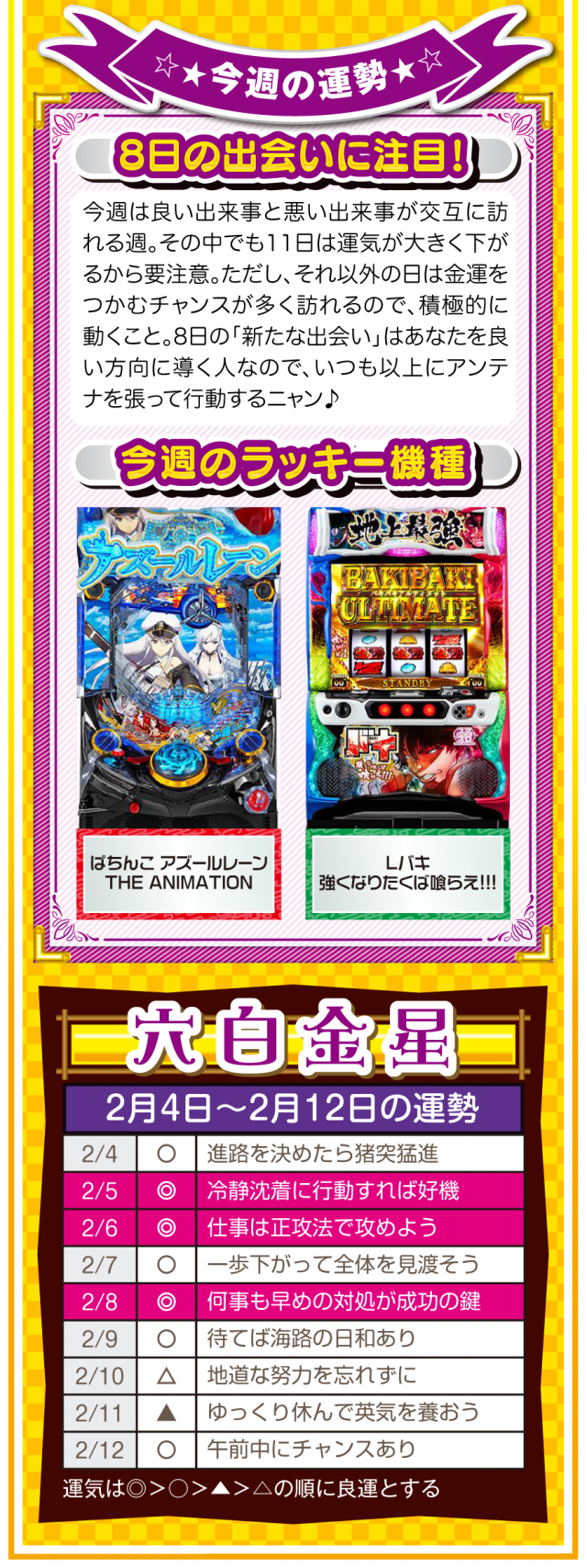 ちょっとしたプレゼントを渡すでも、ご飯をご馳走するでもIい。自分の行動が相手にどう思われるかを考えて、「気が利く人」を目指してほしいニャン♪ というわけで早速、2月6日から12日の1週間を鑑定ニャ(そろそろバレンタインに対して無関心になりつつあるフォー・チュンチュンが、オマケとして4日と5日の運勢も鑑定したニャン♡)!