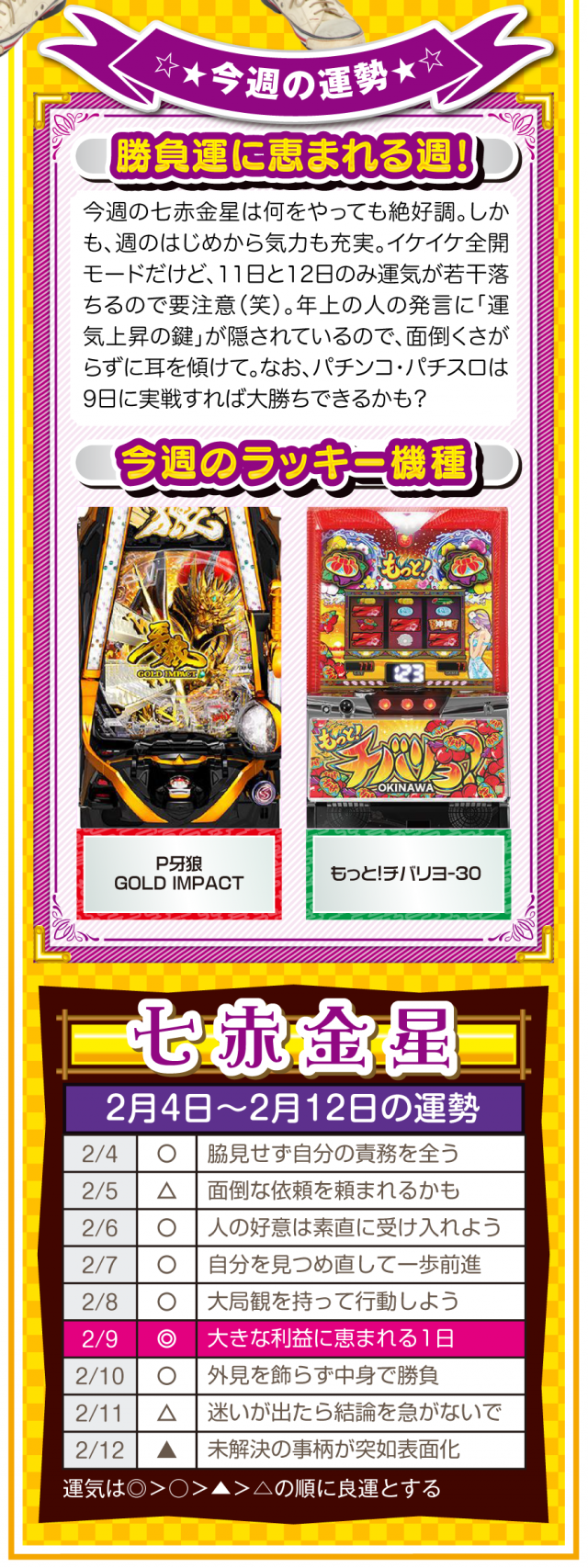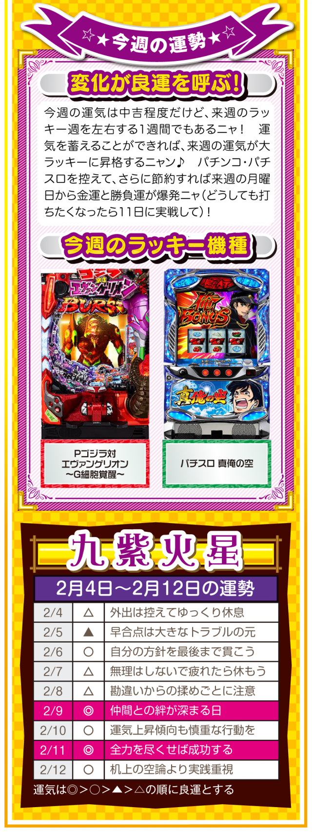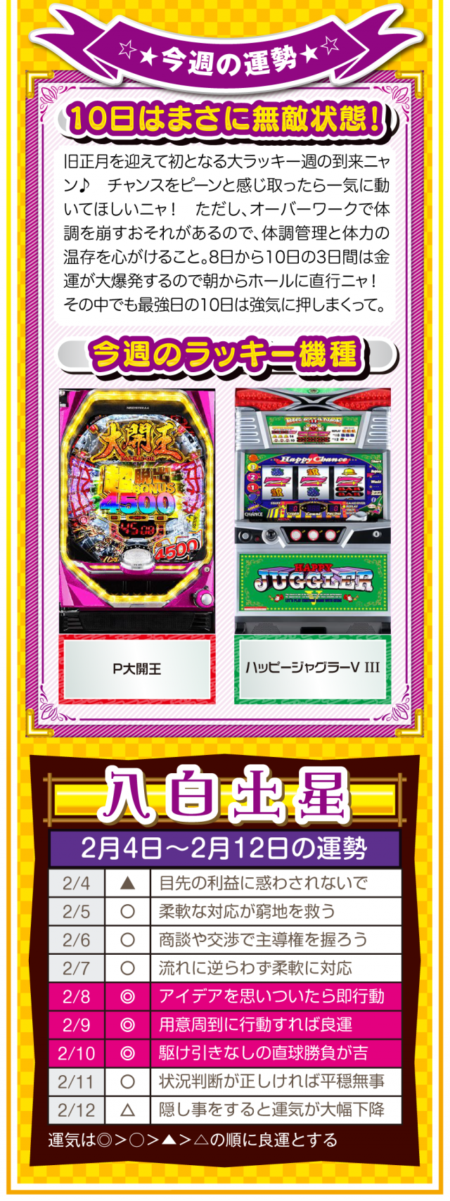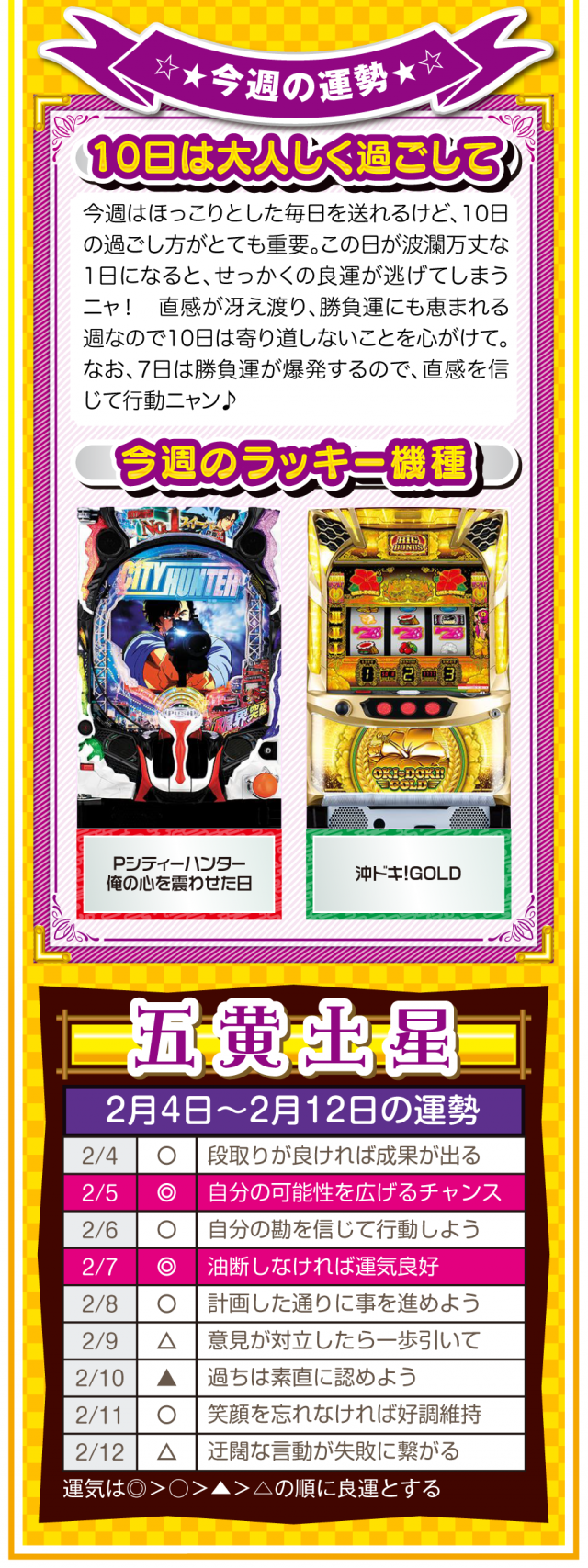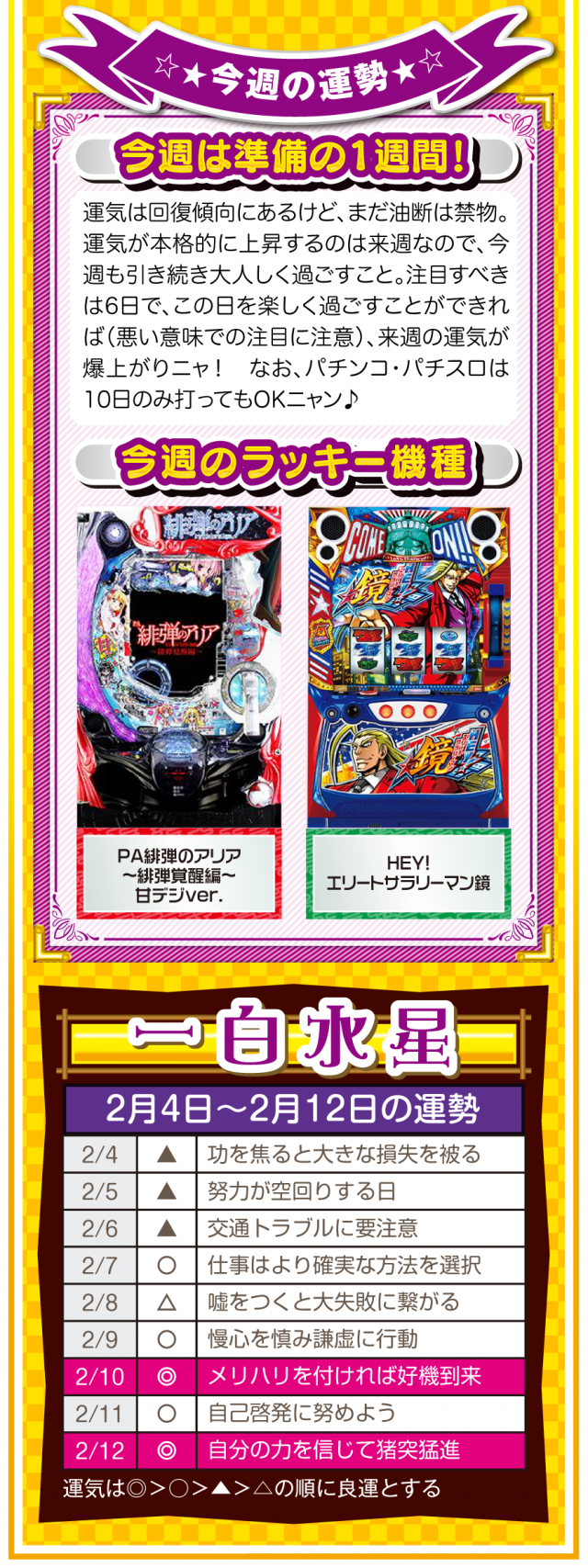 ちょっとしたプレゼントを渡すでも、ご飯をご馳走するでもIい。自分の行動が相手にどう思われるかを考えて、「気が利く人」を目指してほしいニャン♪ というわけで早速、2月6日から12日の1週間を鑑定ニャ(そろそろバレンタインに対して無関心になりつつあるフォー・チュンチュンが、オマケとして4日と5日の運勢も鑑定したニャン♡)!