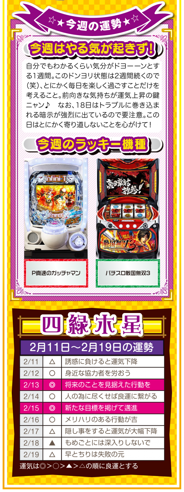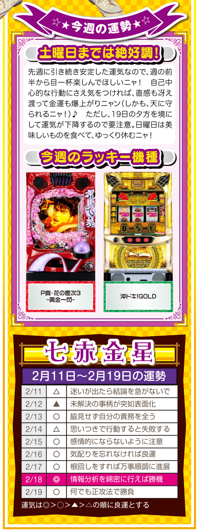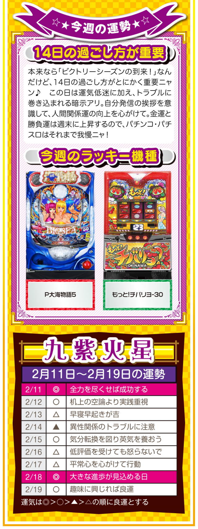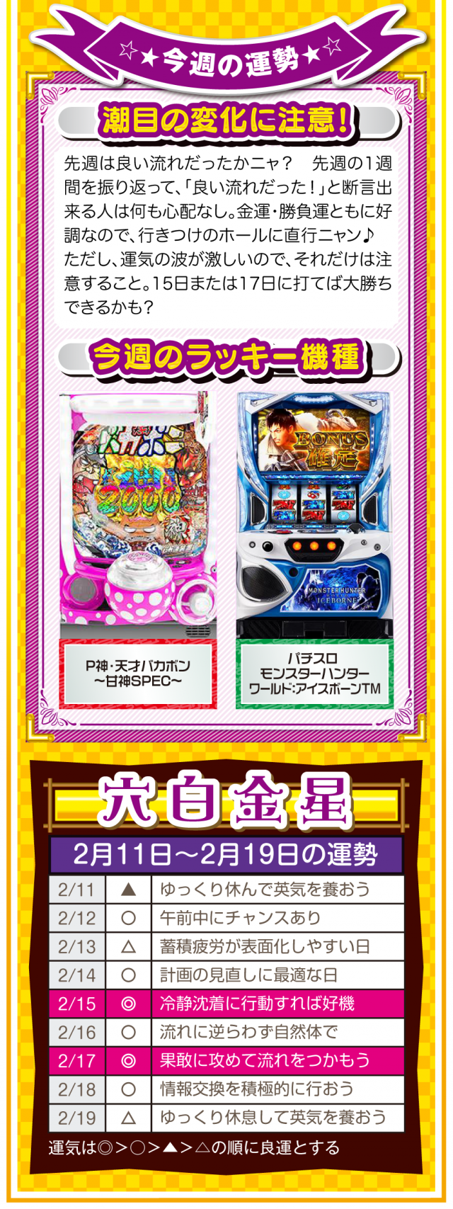だから、パチンコ・パチスロで負けた時は、積極的に挨拶をしてみて(笑)。そして挨拶から始まる運気があることを覚えておいてほしいニャン♪ というわけで早速、2月13日から19日の1週間を鑑定ニャ(今年も本命チョコを買いそびれたフォー・チュンチュンが、オマケとして11日と12日の運勢も鑑定したニャン♡)!