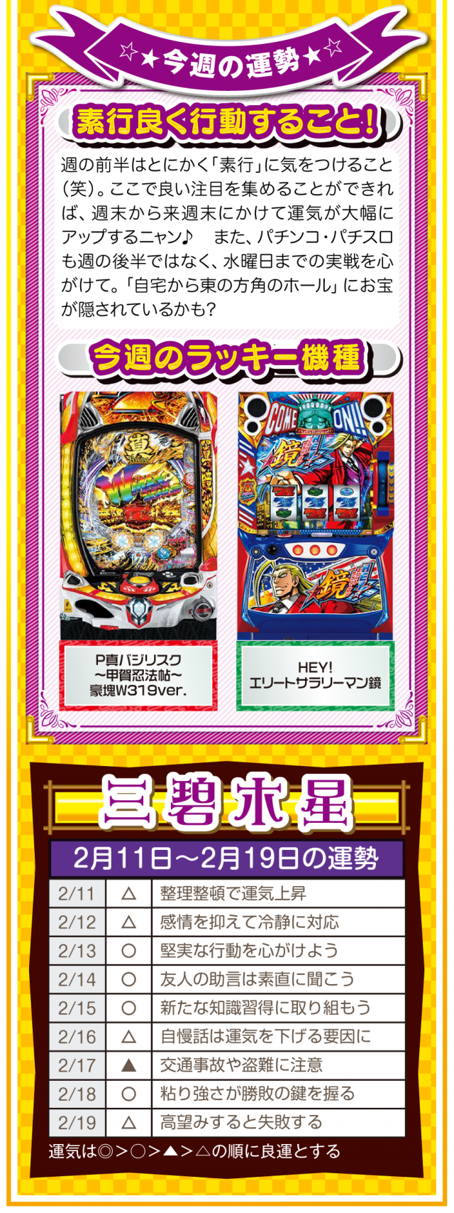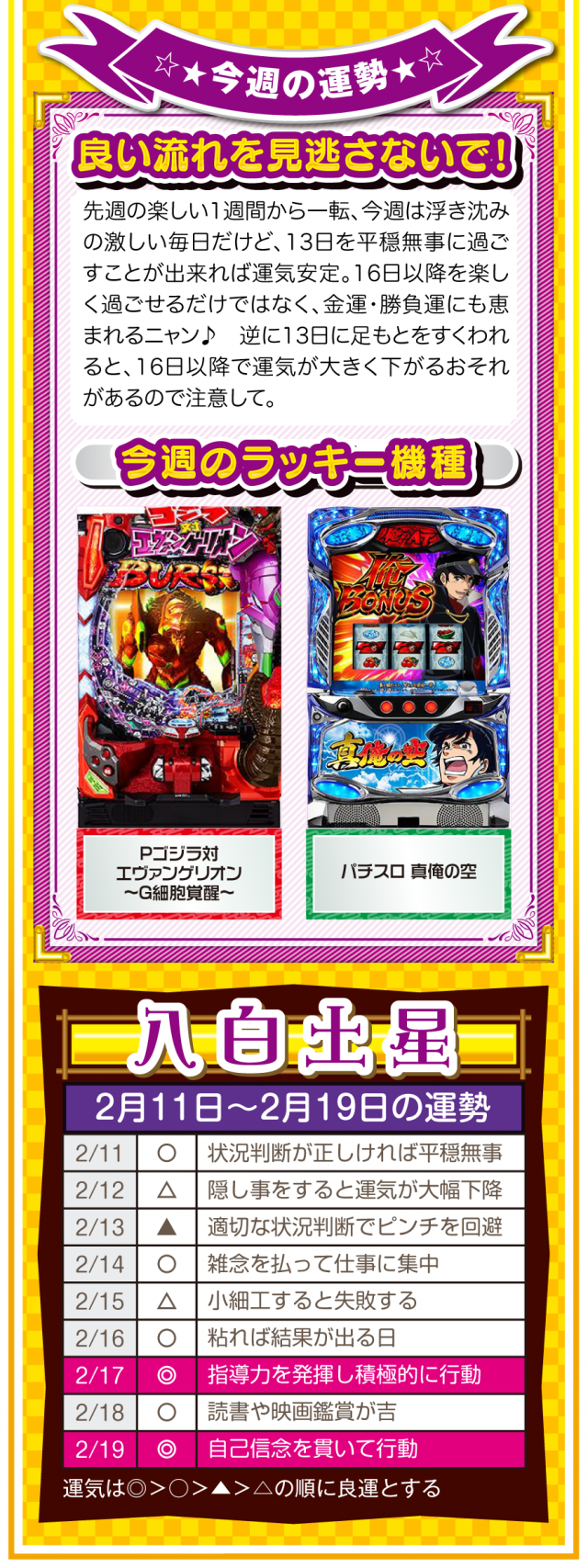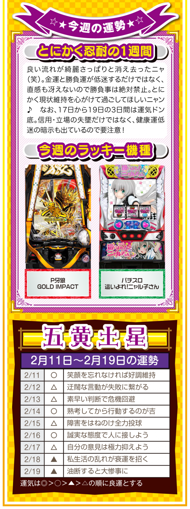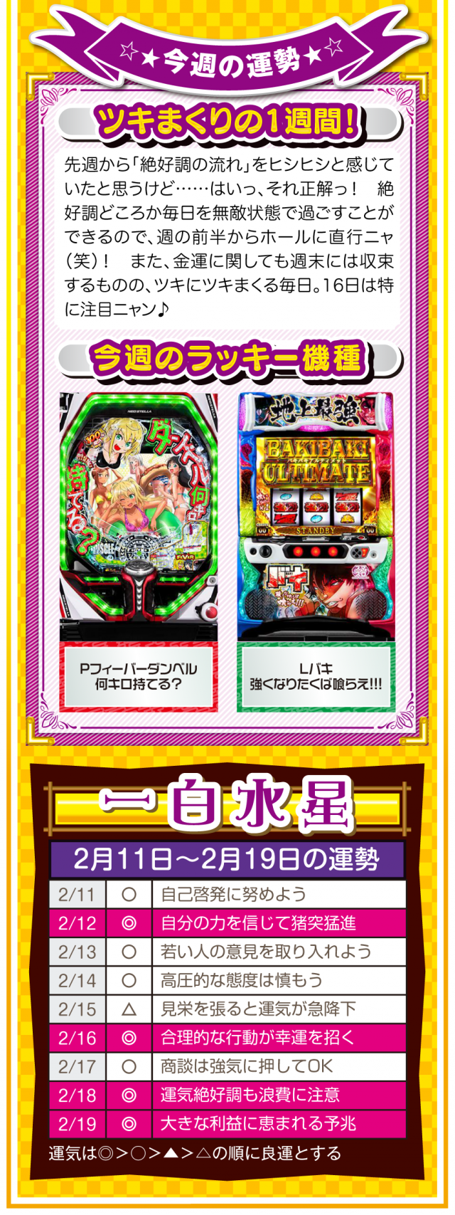 だから、パチンコ・パチスロで負けた時は、積極的に挨拶をしてみて(笑)。そして挨拶から始まる運気があることを覚えておいてほしいニャン♪ というわけで早速、2月13日から19日の1週間を鑑定ニャ(今年も本命チョコを買いそびれたフォー・チュンチュンが、オマケとして11日と12日の運勢も鑑定したニャン♡)!