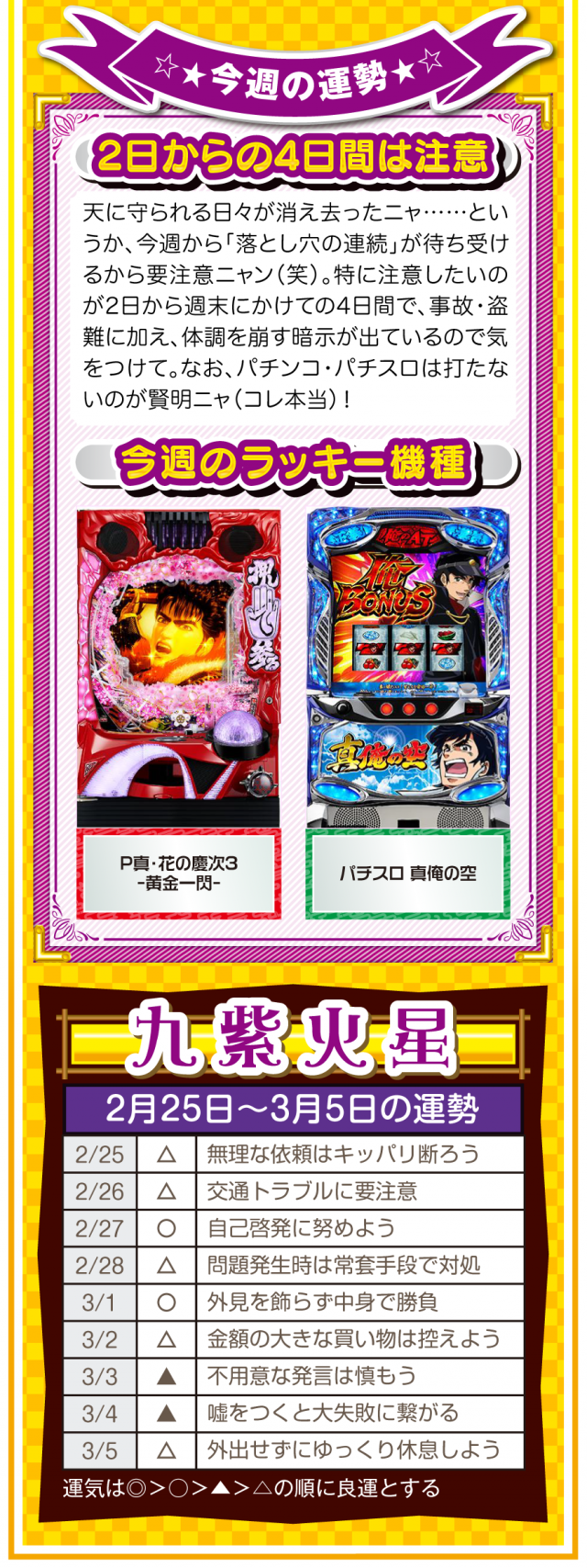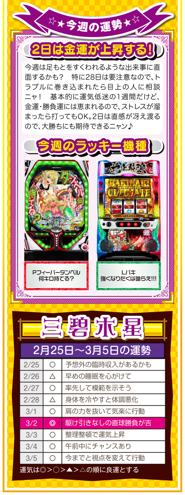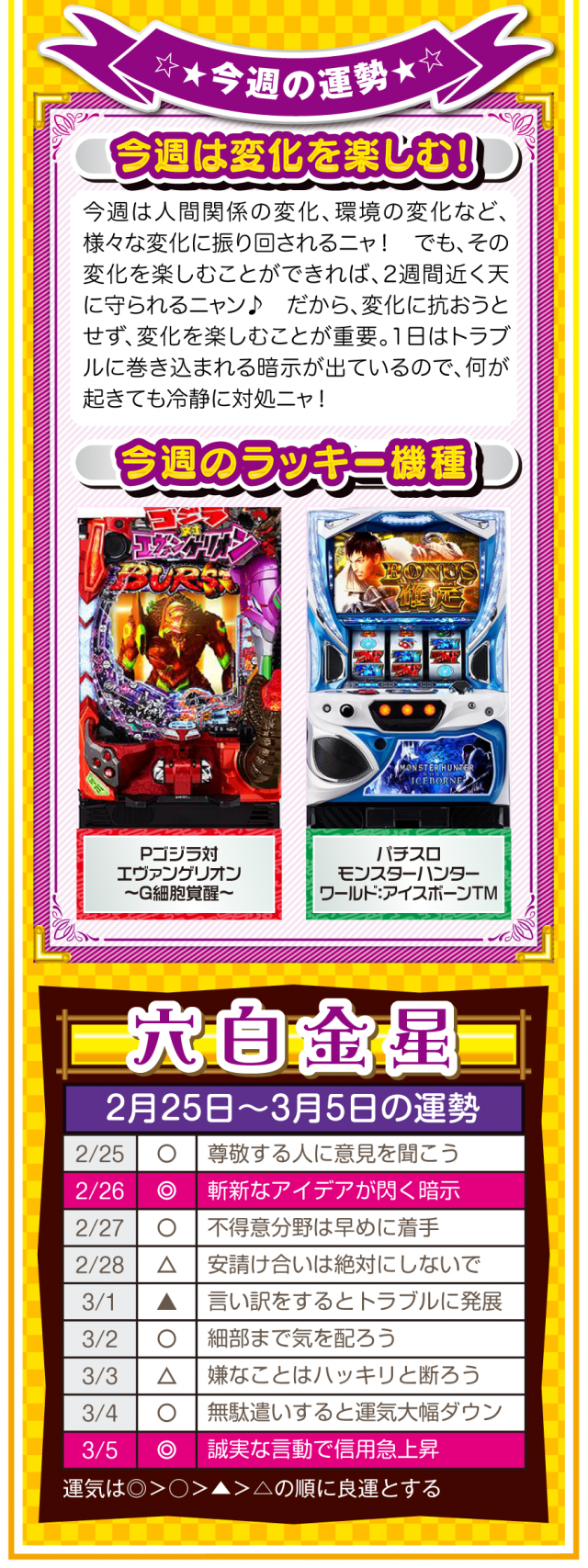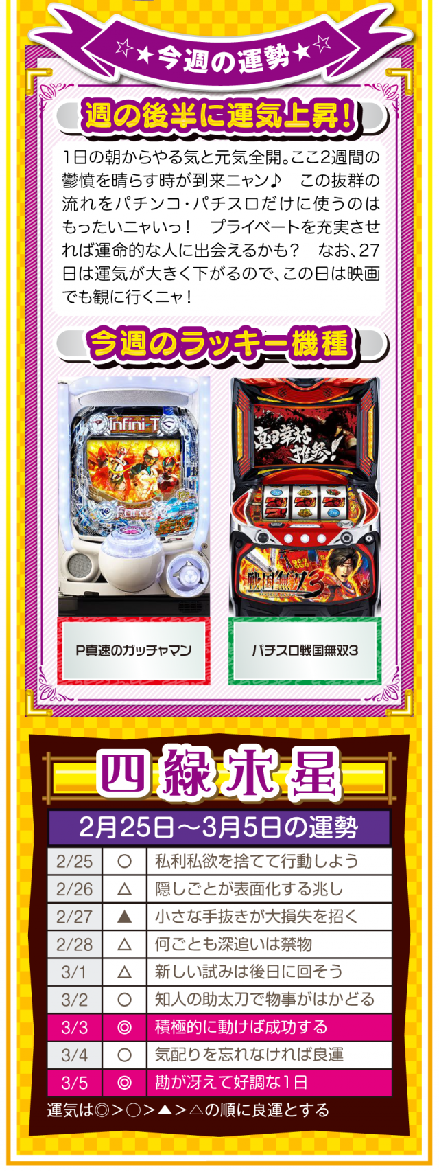 逆境・苦難はチャンスの始まり。人は責任とプレッシャーを背負った時に、運とツキの流れも大きく変わることを覚えておいてほしいニャン♪ というわけで早速、2月27日から3月5日の1週間を鑑定ニャ(独身に対してプレッシャーを感じ始めたフォー・チュンチュンが、オマケとして2月25日と26日の運勢も鑑定したニャ♡)!