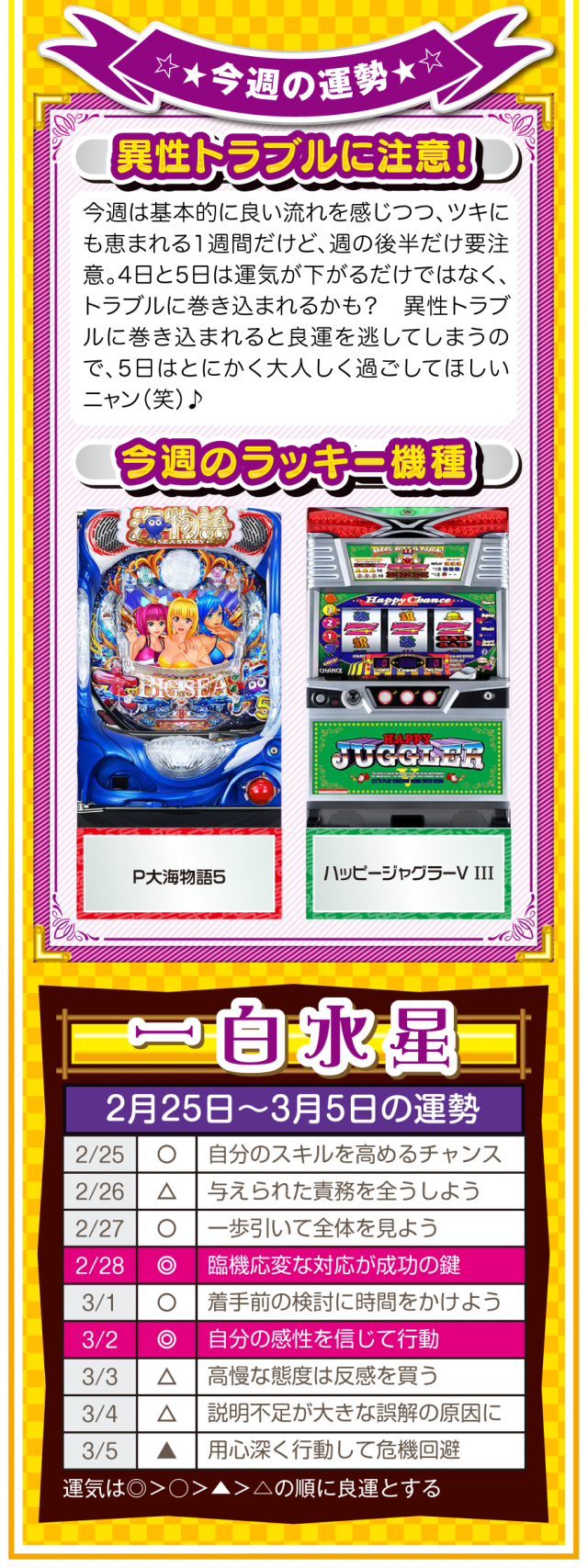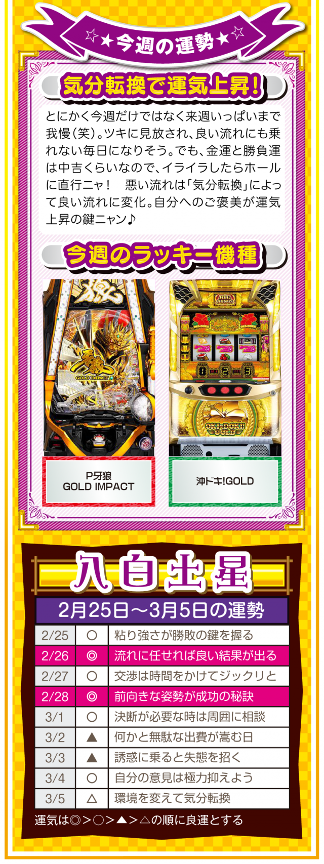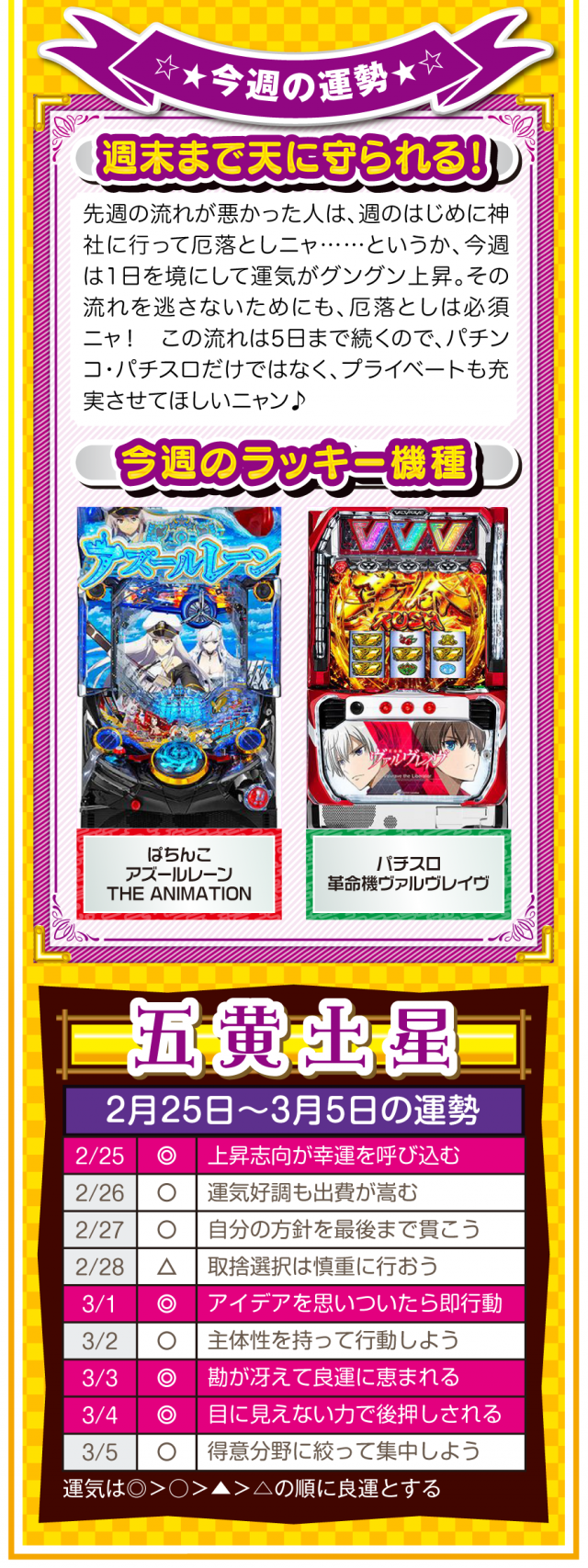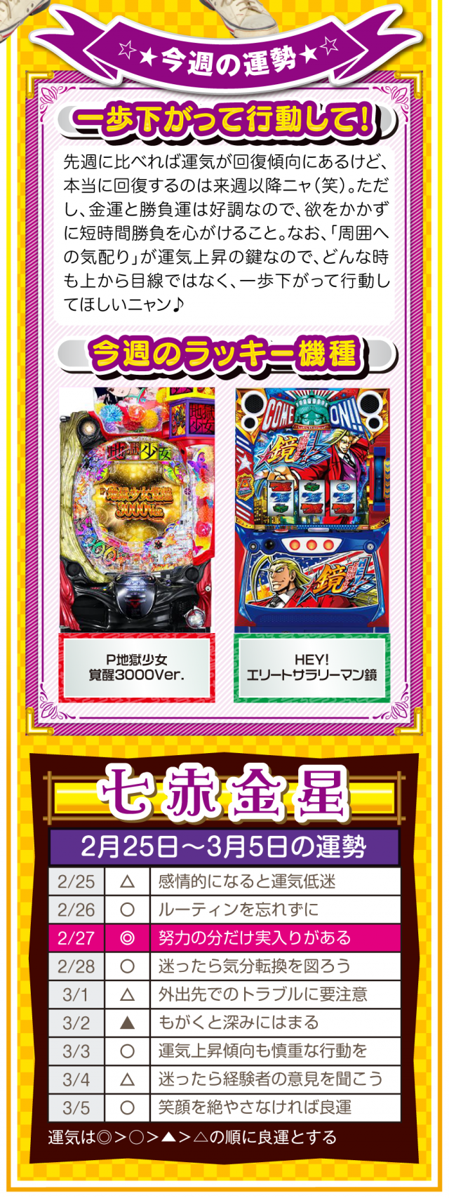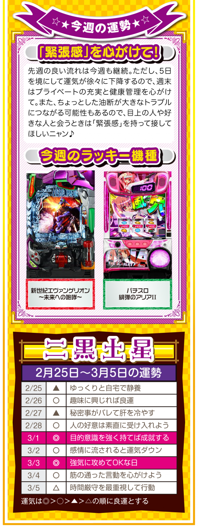 逆境・苦難はチャンスの始まり。人は責任とプレッシャーを背負った時に、運とツキの流れも大きく変わることを覚えておいてほしいニャン♪ というわけで早速、2月27日から3月5日の1週間を鑑定ニャ(独身に対してプレッシャーを感じ始めたフォー・チュンチュンが、オマケとして2月25日と26日の運勢も鑑定したニャ♡)!