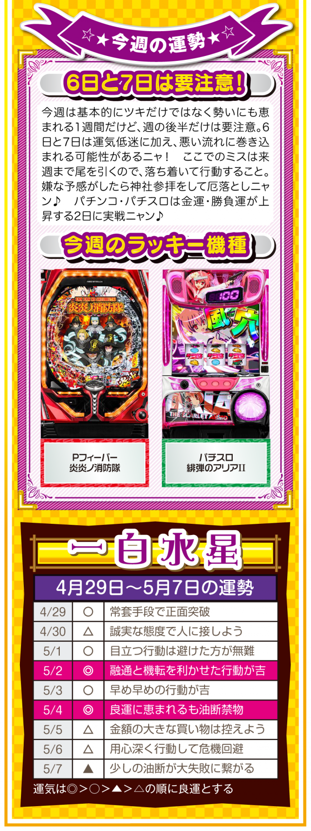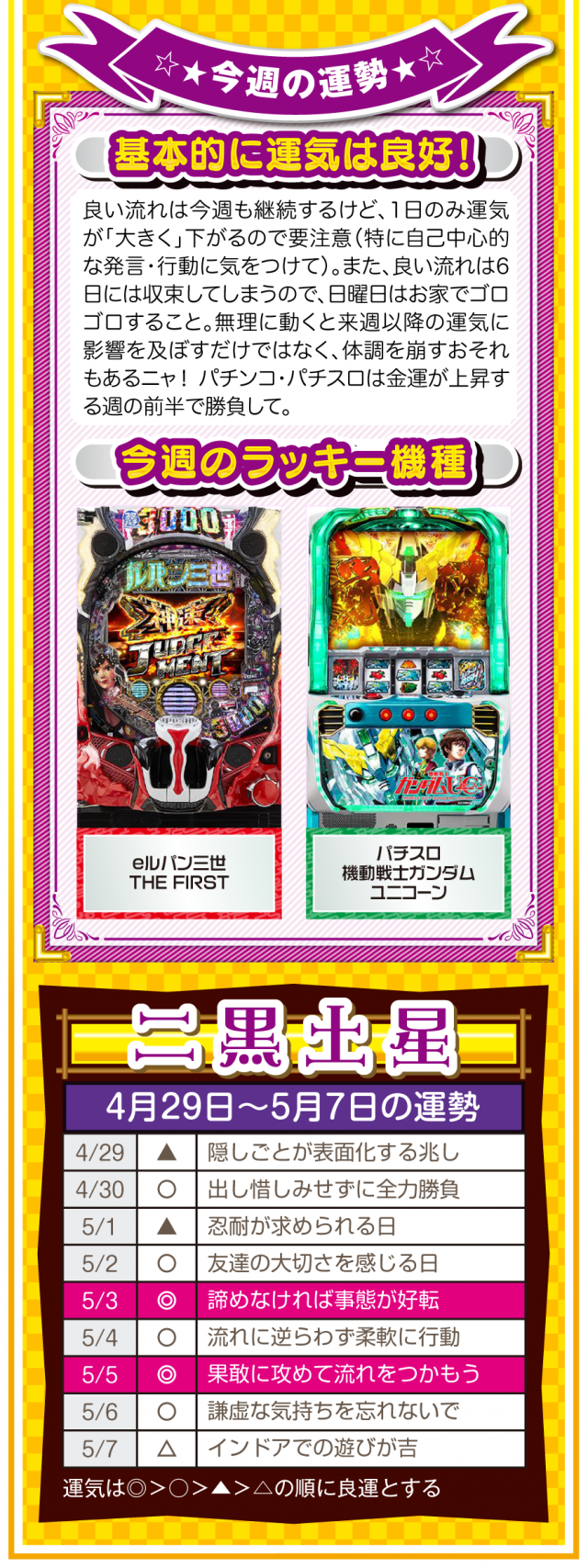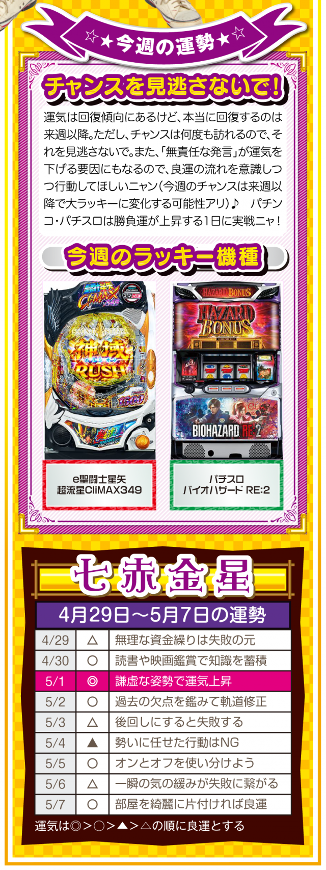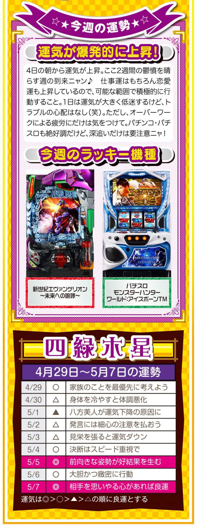 僅かな一歩でも前に進めるよう、自分の成長に対して期待することも忘れないでほしいニャン♪ というわけで早速、5月1日から7日の1週間を鑑定ニャ(玉の輿に乗った友達に対する呪詛が止まらないフォー・チュンチュンが、オマケとして4月29日と30日の運勢も鑑定したニャン♡)!