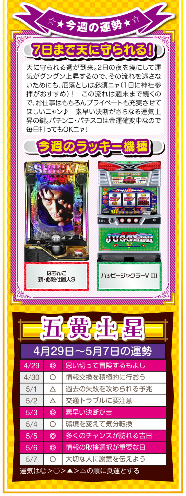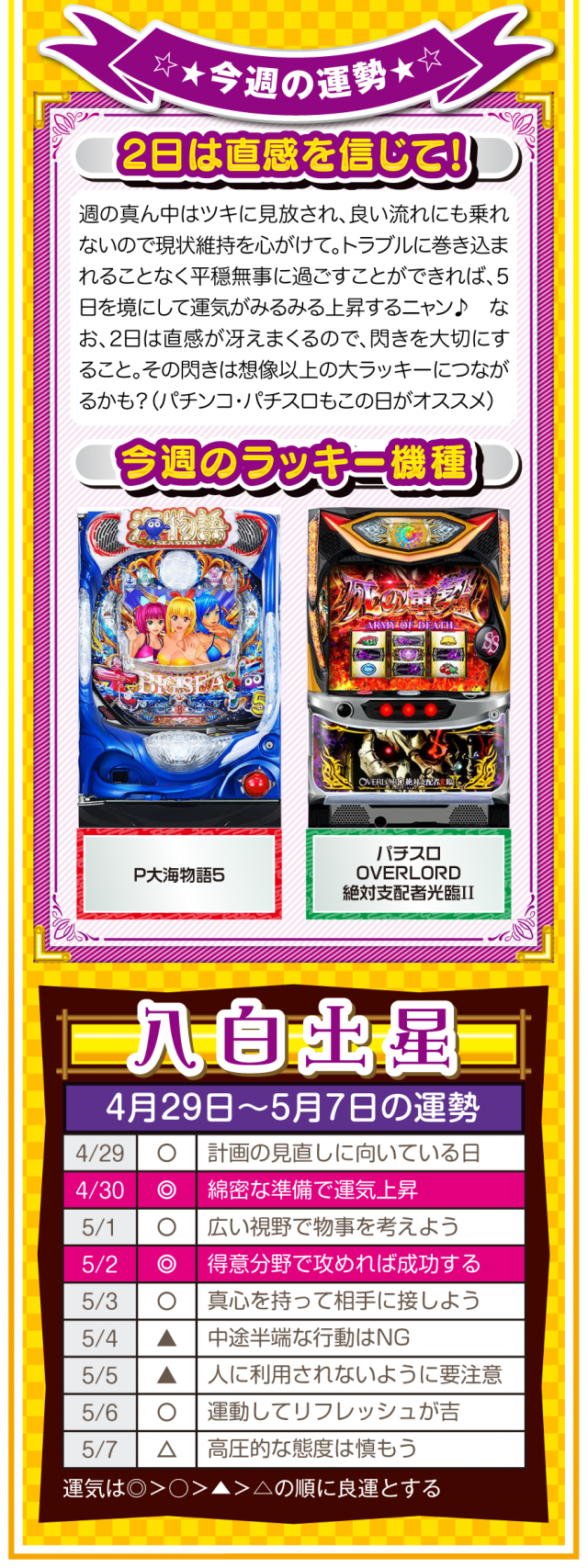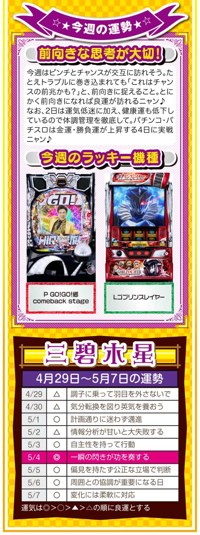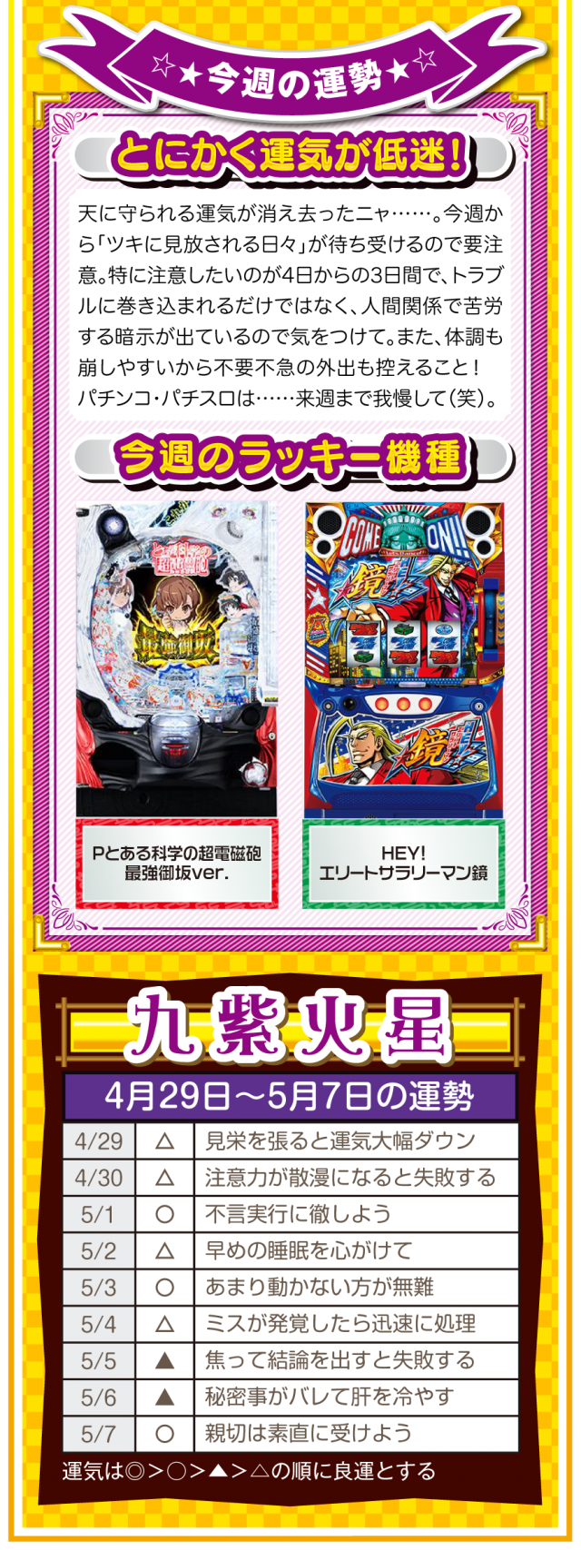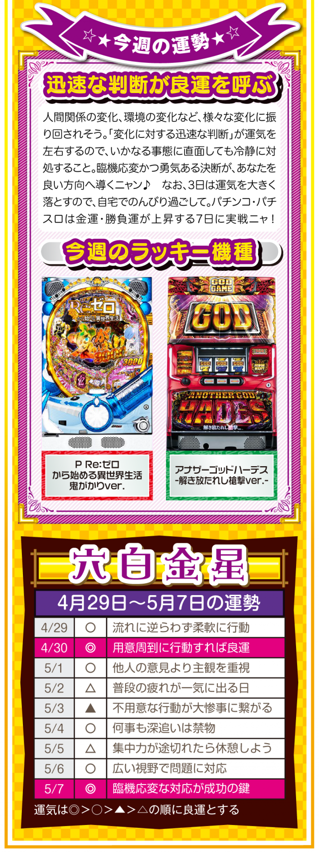僅かな一歩でも前に進めるよう、自分の成長に対して期待することも忘れないでほしいニャン♪ というわけで早速、5月1日から7日の1週間を鑑定ニャ(玉の輿に乗った友達に対する呪詛が止まらないフォー・チュンチュンが、オマケとして4月29日と30日の運勢も鑑定したニャン♡)!