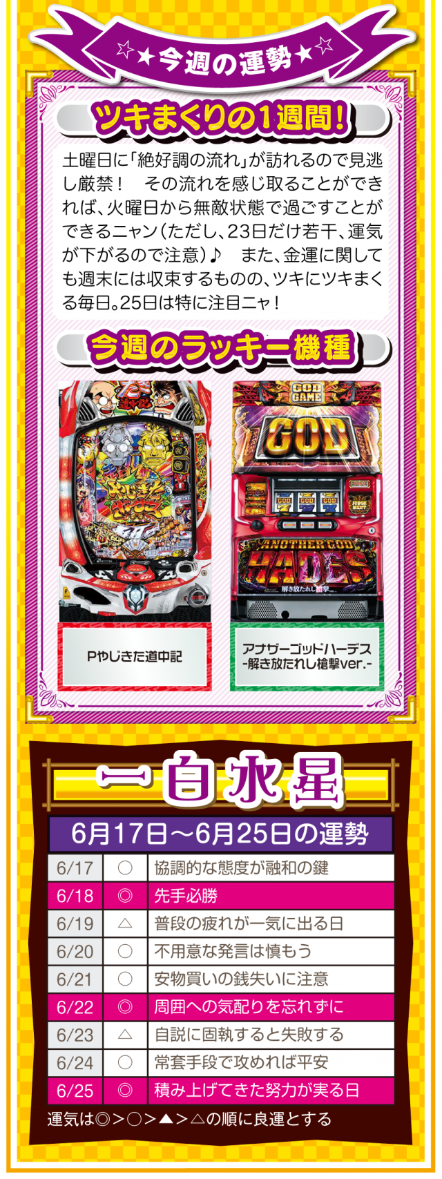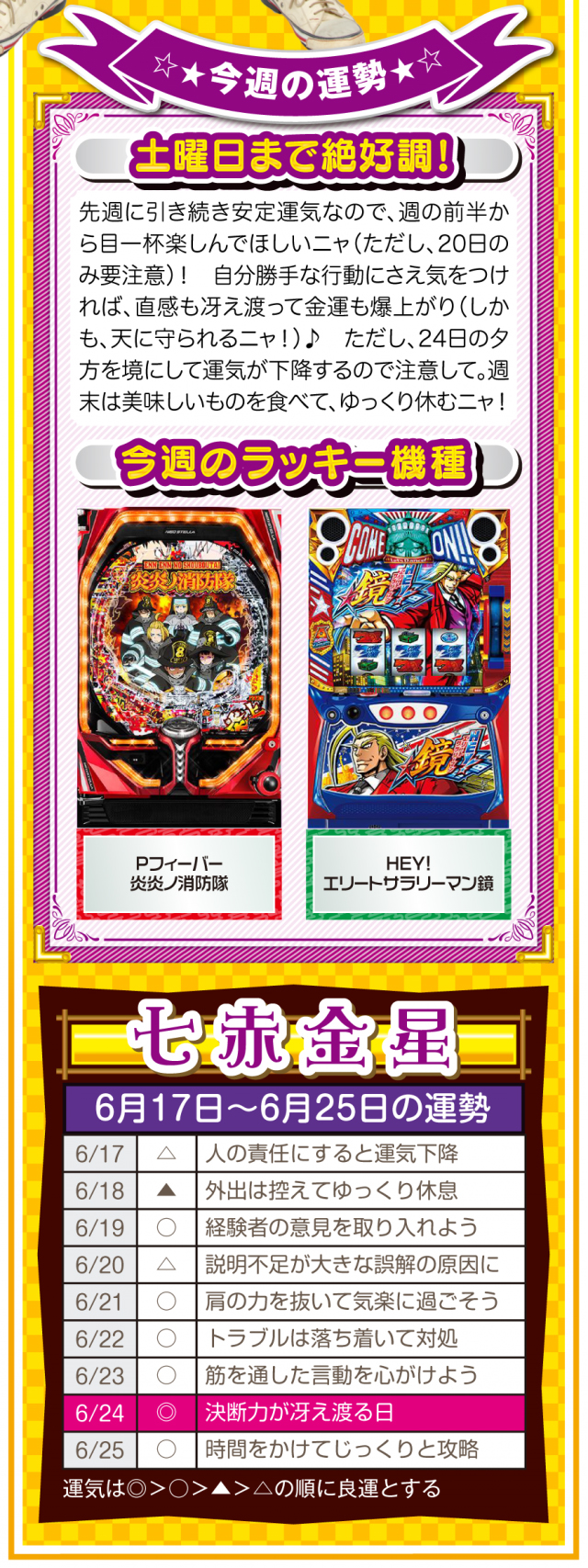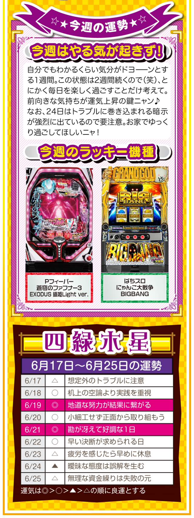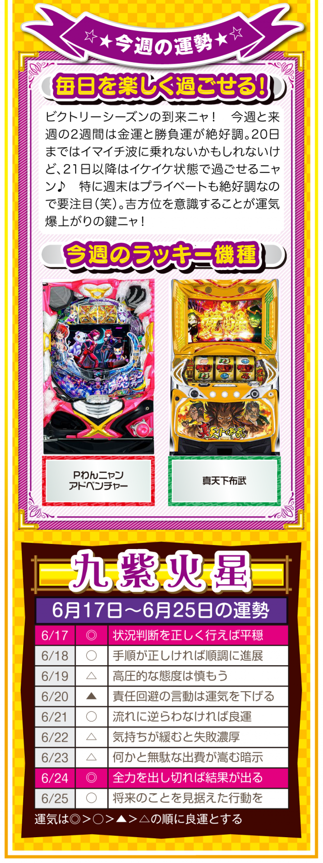 案ずるより産むが易し。口に出すことくらい難しくないので(笑)、本当にお金と恋愛に困っていたら行動あるのみ。「行動を起こせる人」と「行動を起こせない人」で、金運と恋愛運が大きく変わることを覚えておいてほしいニャン♪ というわけで早速、6月19日から25日の1週間を鑑定ニャ(自己暗示だけは大得意のフォー・チュンチュンが、オマケとして17日と18日の運勢も鑑定したニャン♡)!