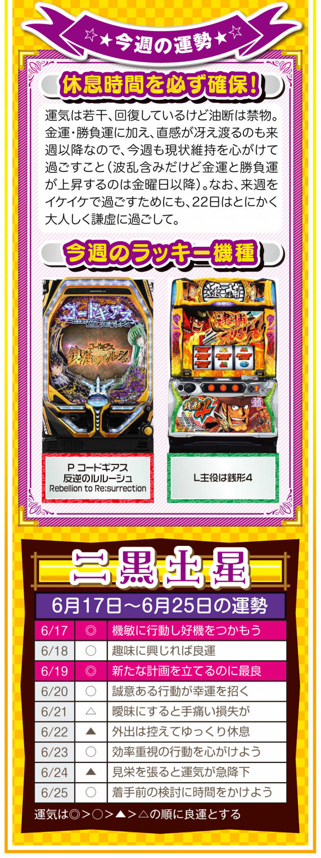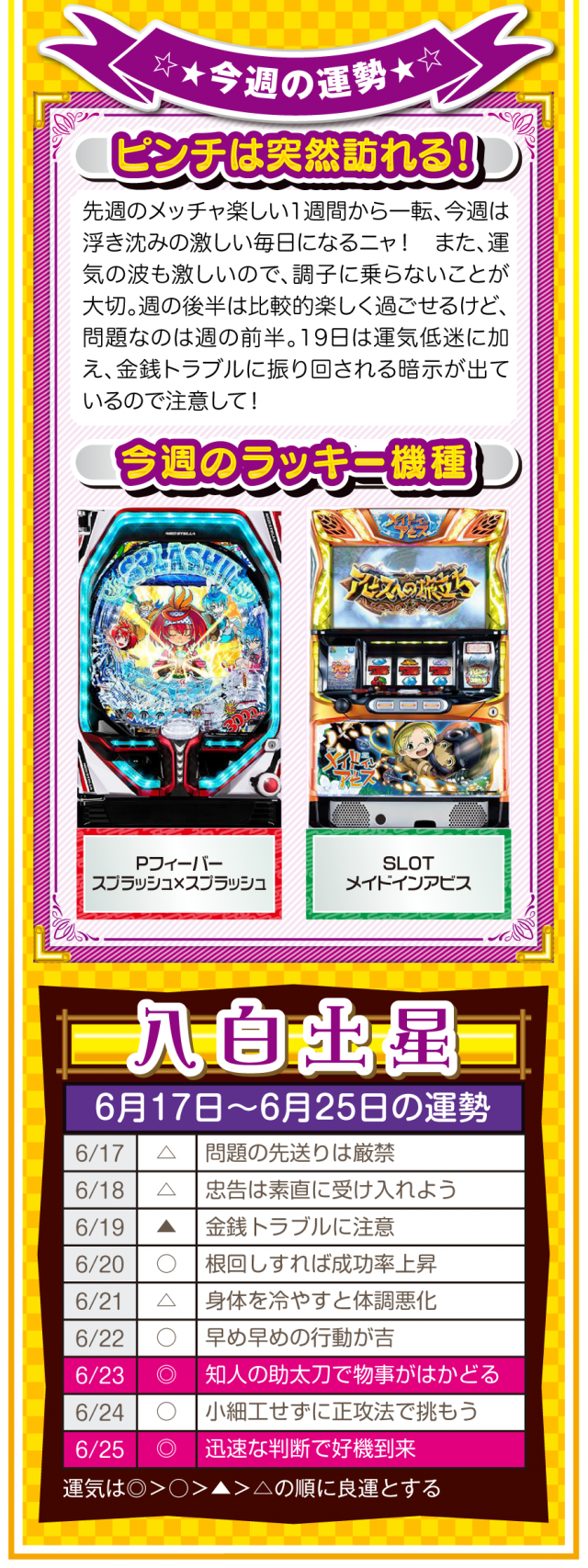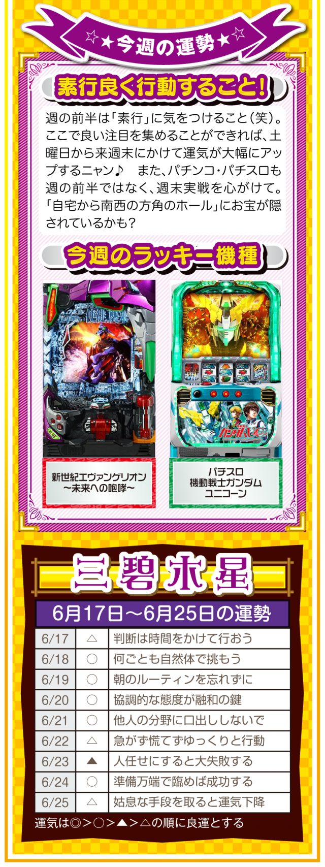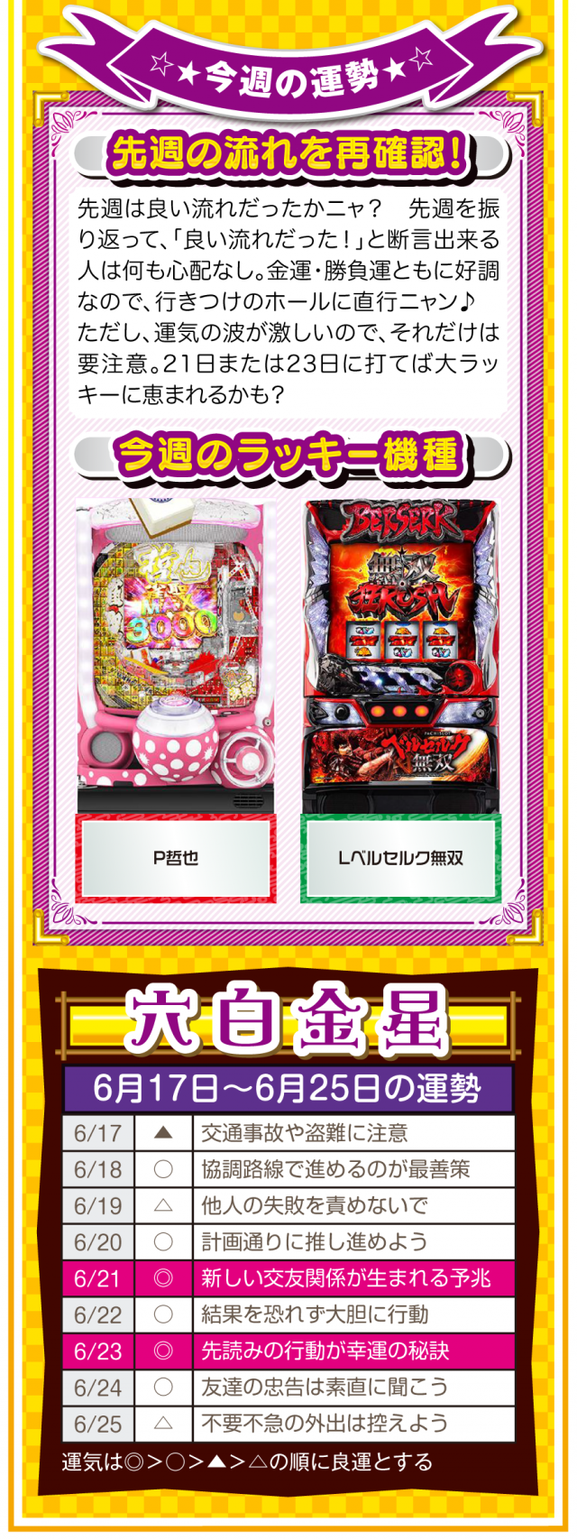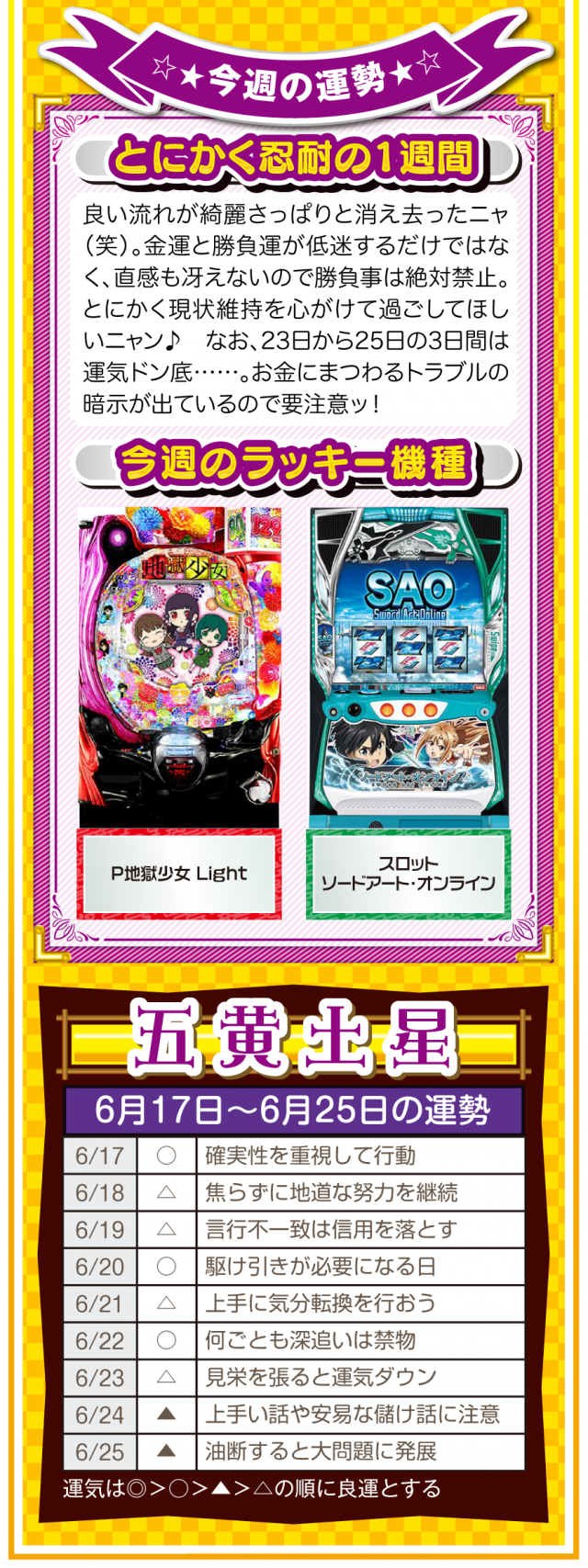 案ずるより産むが易し。口に出すことくらい難しくないので(笑)、本当にお金と恋愛に困っていたら行動あるのみ。「行動を起こせる人」と「行動を起こせない人」で、金運と恋愛運が大きく変わることを覚えておいてほしいニャン♪ というわけで早速、6月19日から25日の1週間を鑑定ニャ(自己暗示だけは大得意のフォー・チュンチュンが、オマケとして17日と18日の運勢も鑑定したニャン♡)!