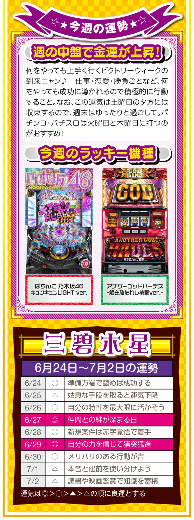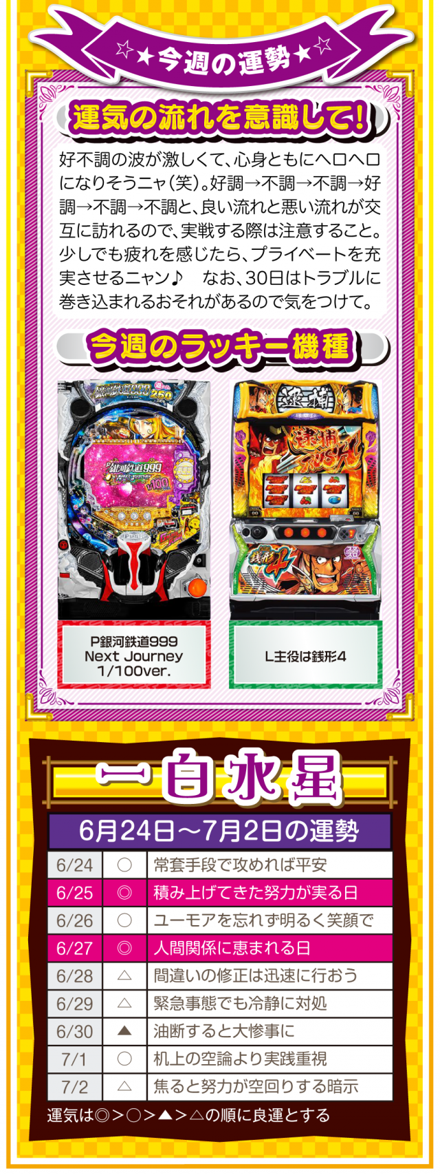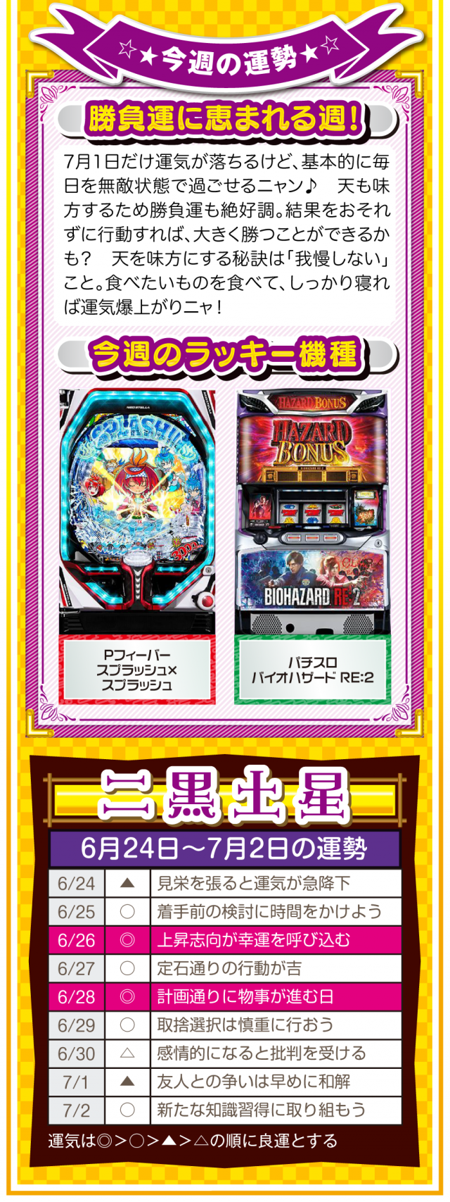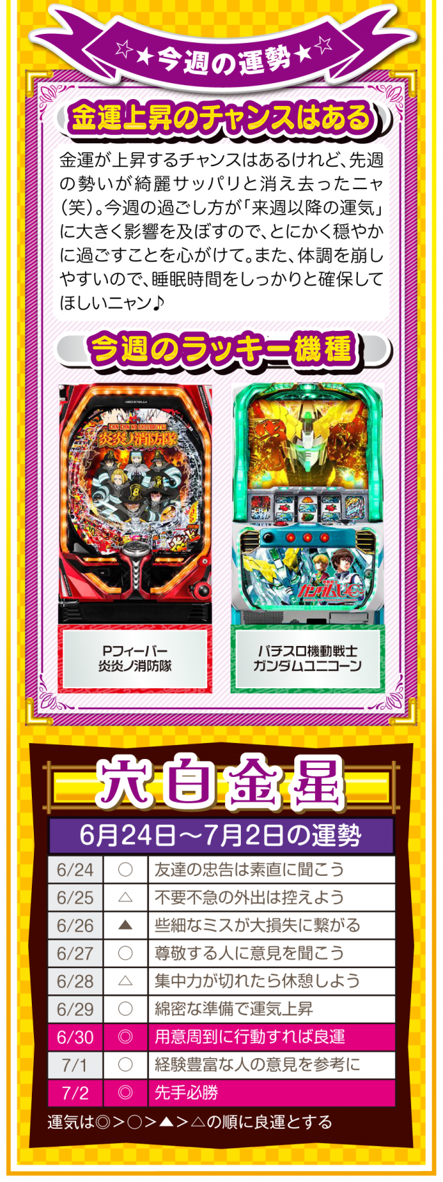 人生を変えるタイミングは、悲観ではなく歓迎すべきということを覚えておいてほしいニャン♪ というわけで早速、6月26日から7月2日の1週間を鑑定ニャ(恋愛のタイミングがなかなか訪れないフォー・チュンチュンが、オマケとして24日と25日の運勢も鑑定したニャン♡)!
