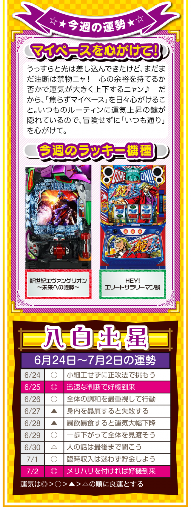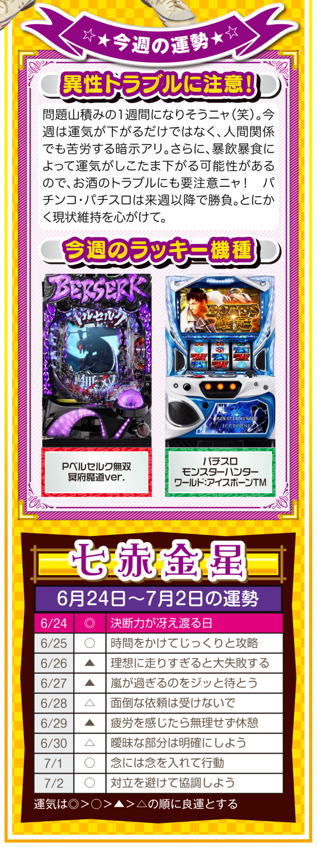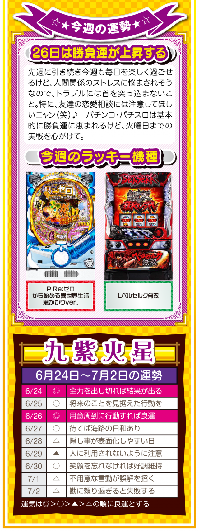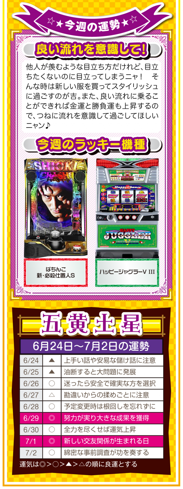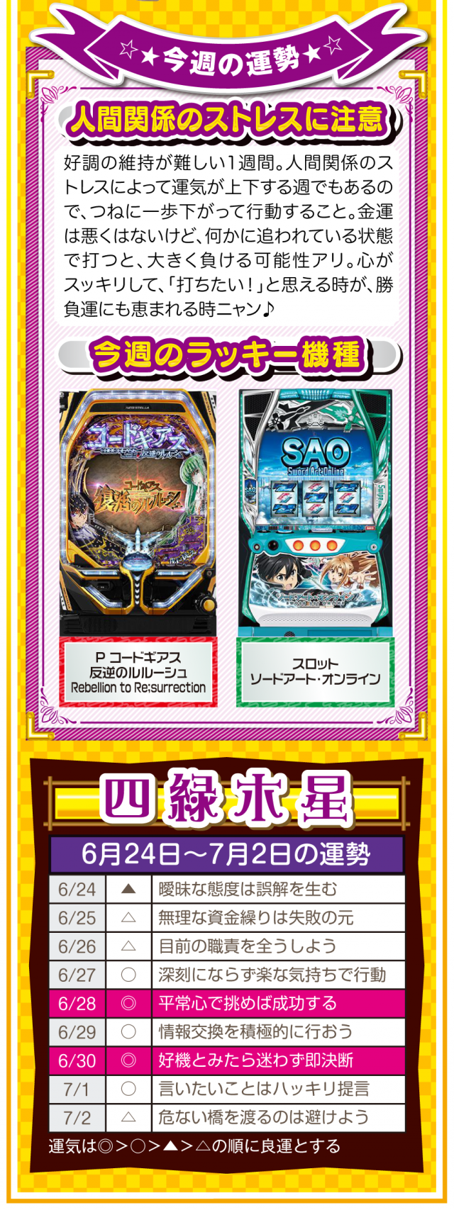 人生を変えるタイミングは、悲観ではなく歓迎すべきということを覚えておいてほしいニャン♪ というわけで早速、6月26日から7月2日の1週間を鑑定ニャ(恋愛のタイミングがなかなか訪れないフォー・チュンチュンが、オマケとして24日と25日の運勢も鑑定したニャン♡)!