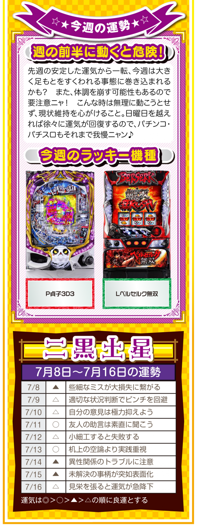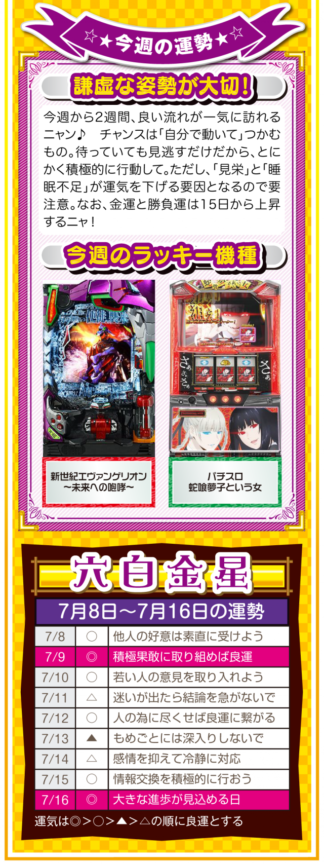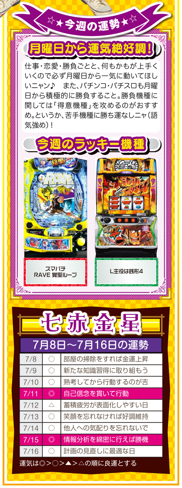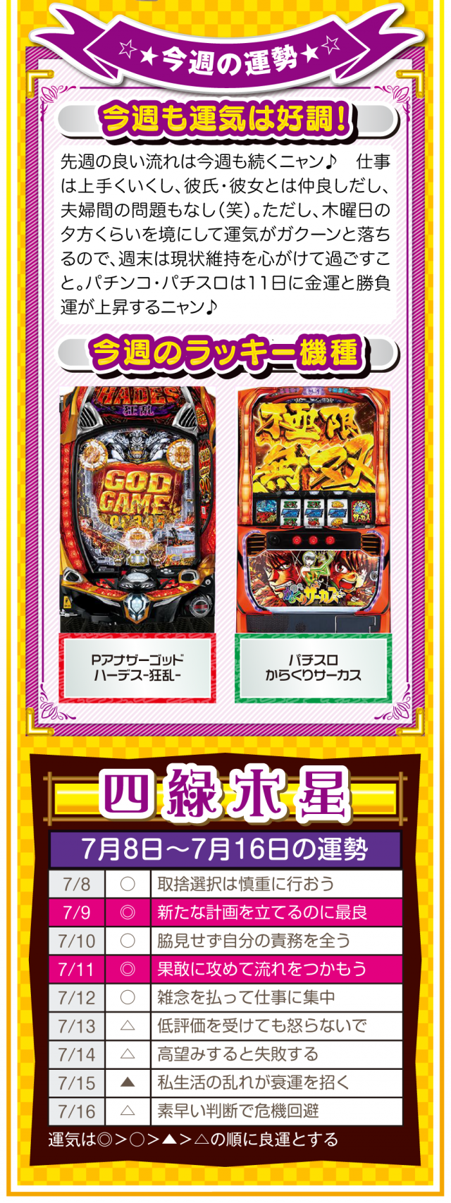 愚痴を愚痴のまま終わらせず、それをプラスに変える努力がツキと強運を呼び込むことを覚えておいてほしいニャン♪ というわけで早速、7月10日から7月16日の1週間を鑑定ニャ(マッチングサイトに対する毒が止まらないフォー・チュンチュンが、オマケとして8日と9日の運勢も鑑定したニャン♡)!