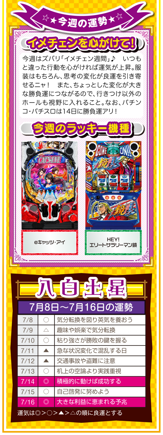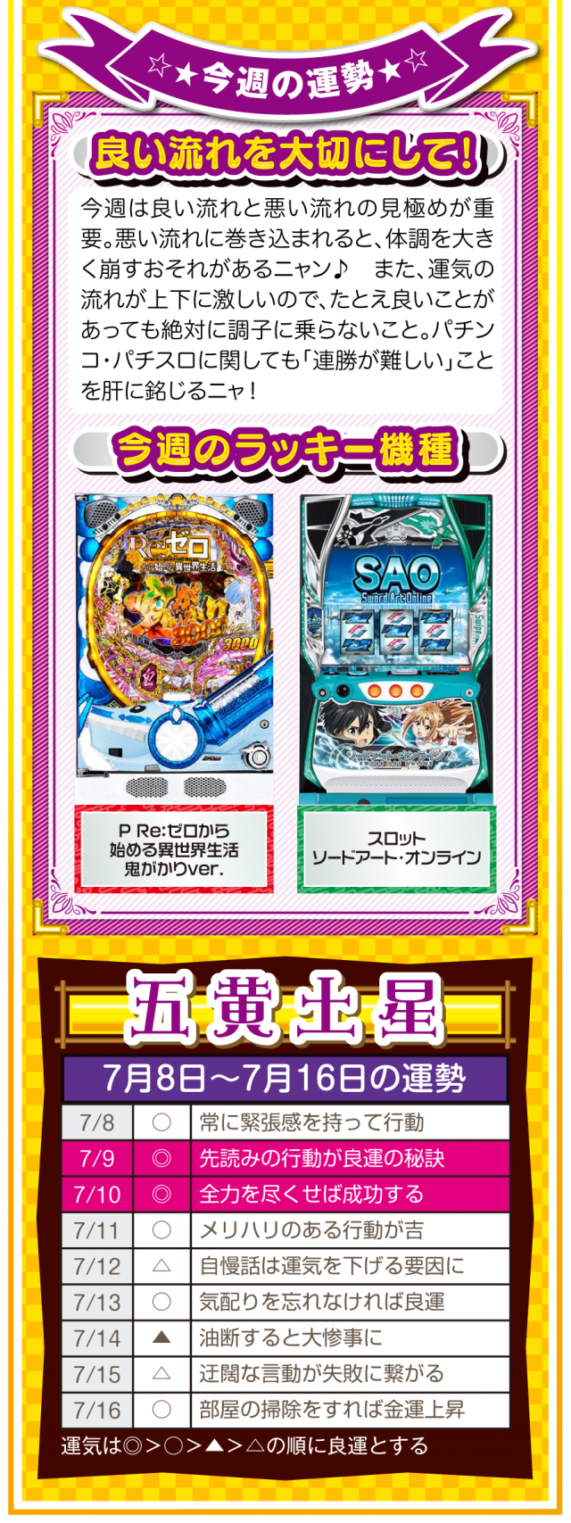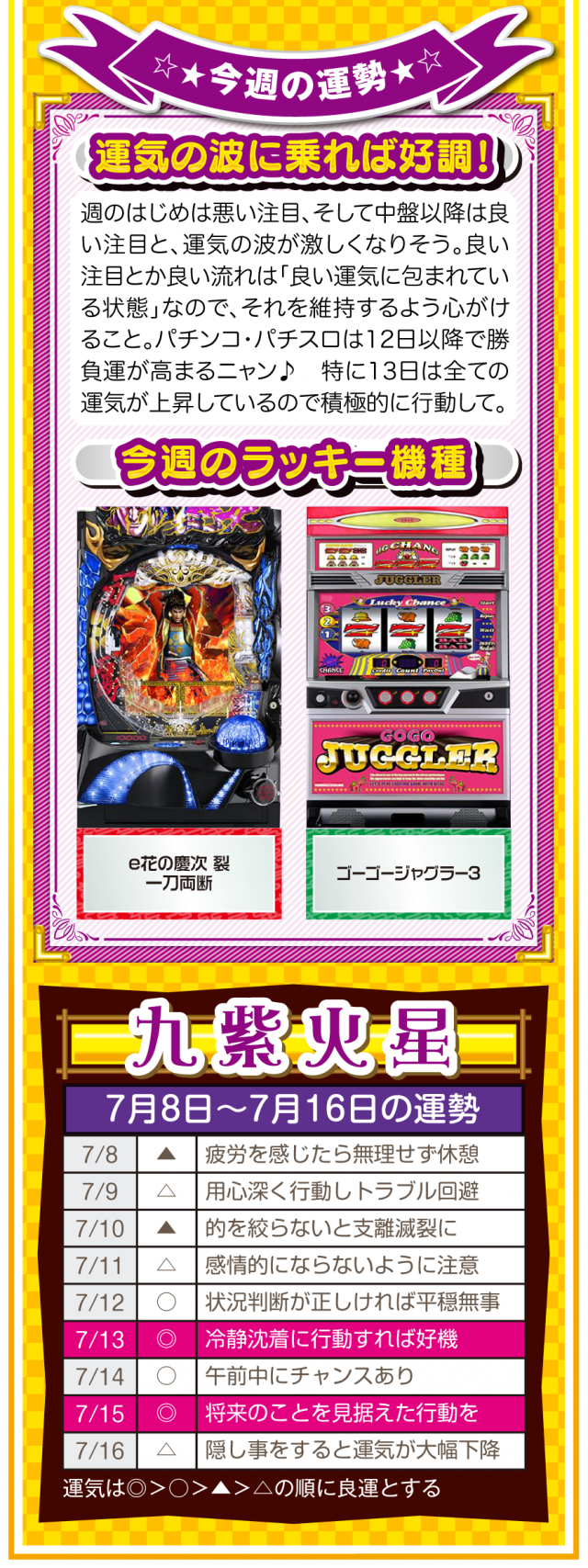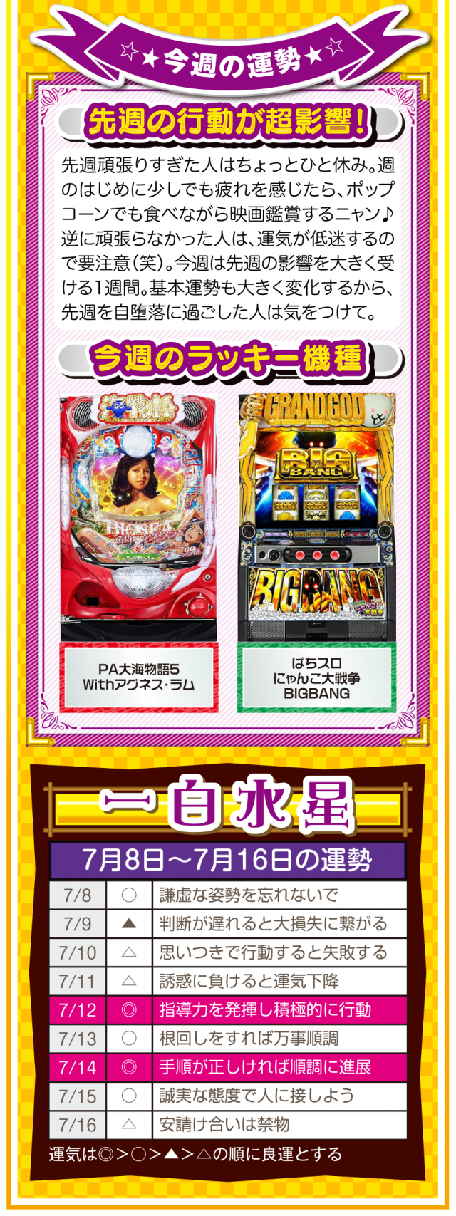 愚痴を愚痴のまま終わらせず、それをプラスに変える努力がツキと強運を呼び込むことを覚えておいてほしいニャン♪ というわけで早速、7月10日から7月16日の1週間を鑑定ニャ(マッチングサイトに対する毒が止まらないフォー・チュンチュンが、オマケとして8日と9日の運勢も鑑定したニャン♡)!