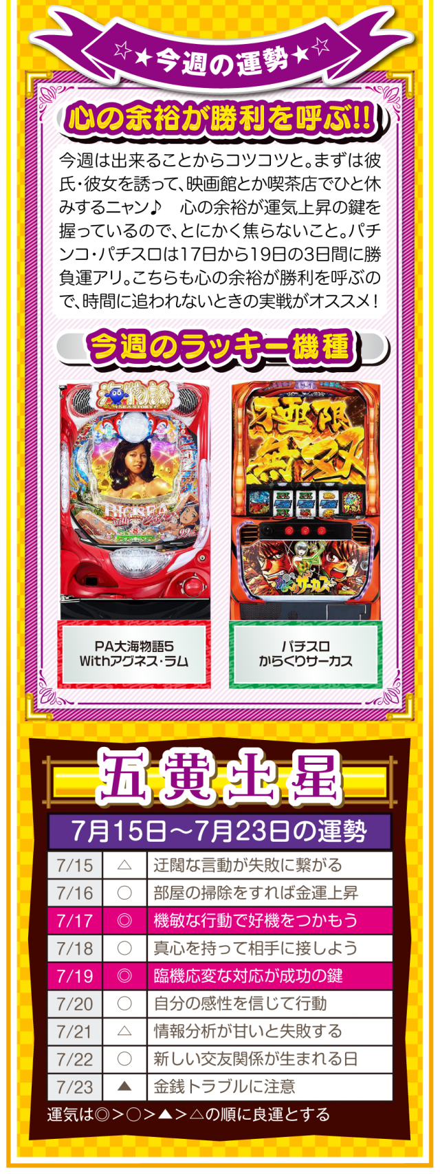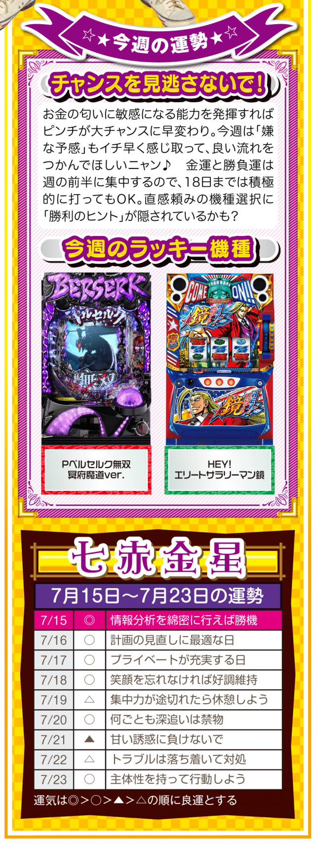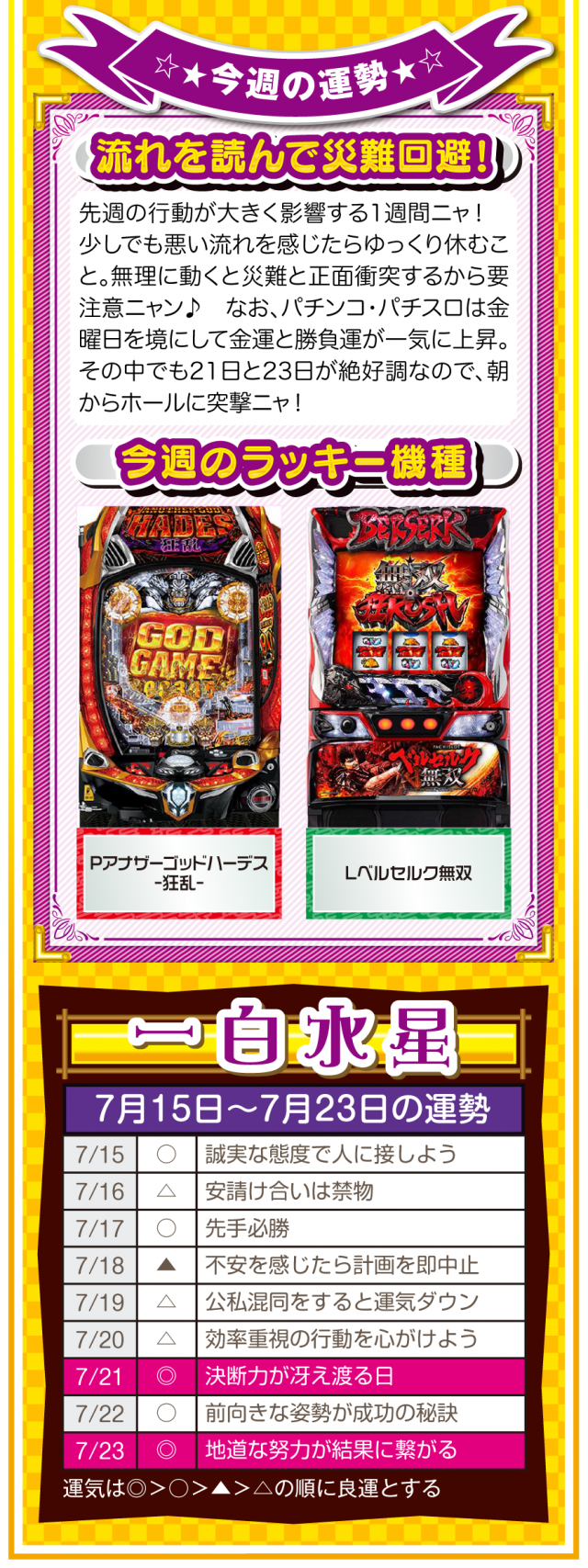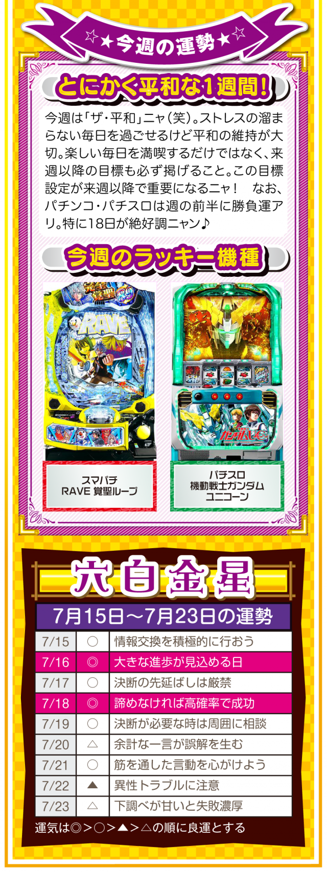 無駄でもいいし、時にはバカにされてもいい。手を抜かずに無駄を続け、価値に繋がる生き方を目指してほしいニャン♪ というわけで早速、7月17日から23日の1週間を鑑定ニャ(恋愛に関する思い出だけは超一流のフォー・チュンチュンが、オマケとして15日と16日の運勢も鑑定したニャン♡)!
