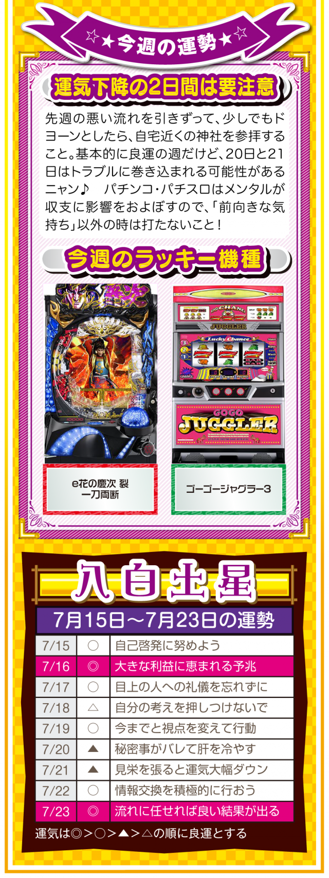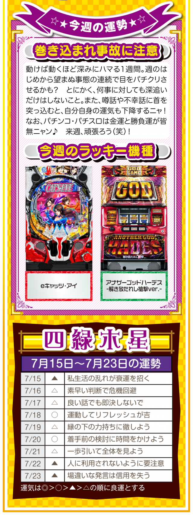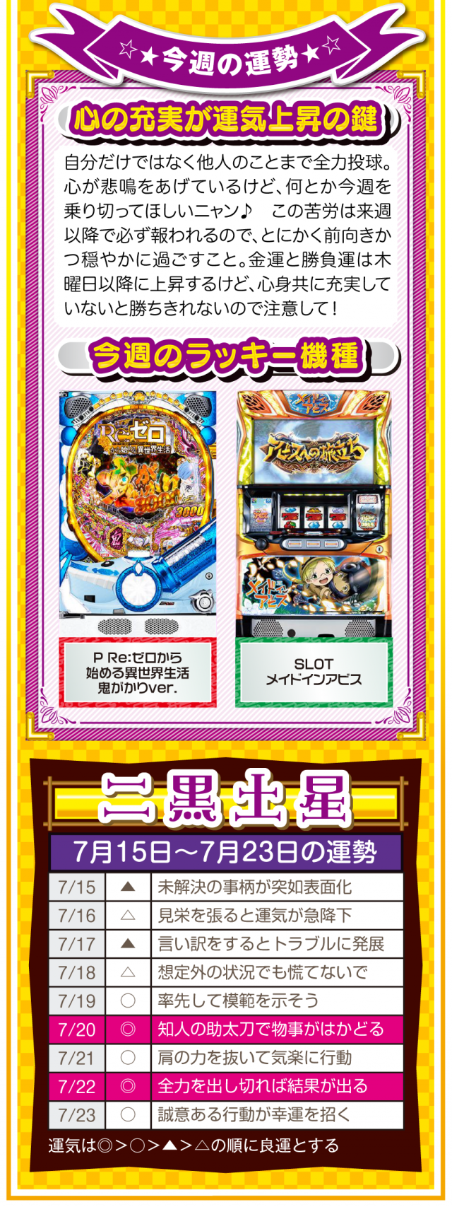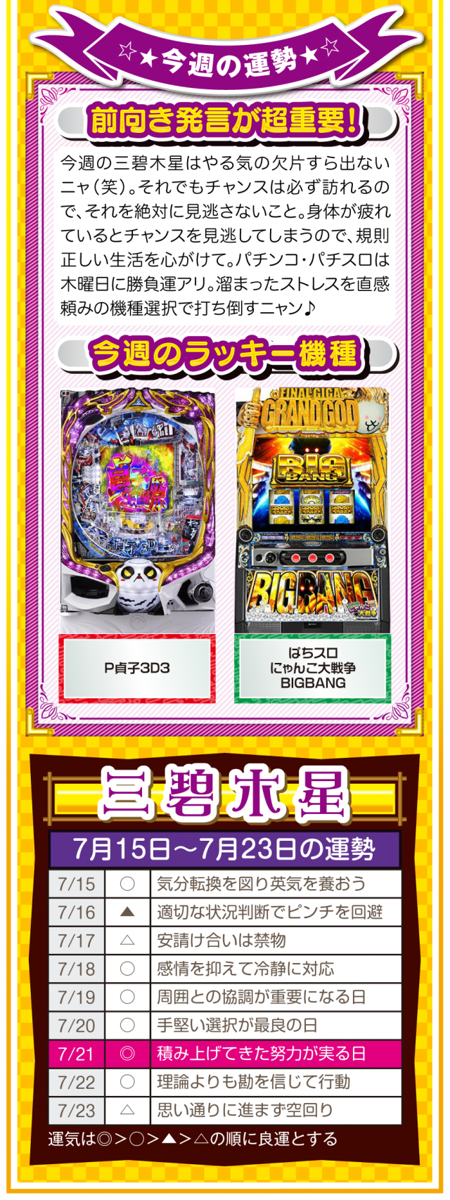無駄でもいいし、時にはバカにされてもいい。手を抜かずに無駄を続け、価値に繋がる生き方を目指してほしいニャン♪ というわけで早速、7月17日から23日の1週間を鑑定ニャ(恋愛に関する思い出だけは超一流のフォー・チュンチュンが、オマケとして15日と16日の運勢も鑑定したニャン♡)!