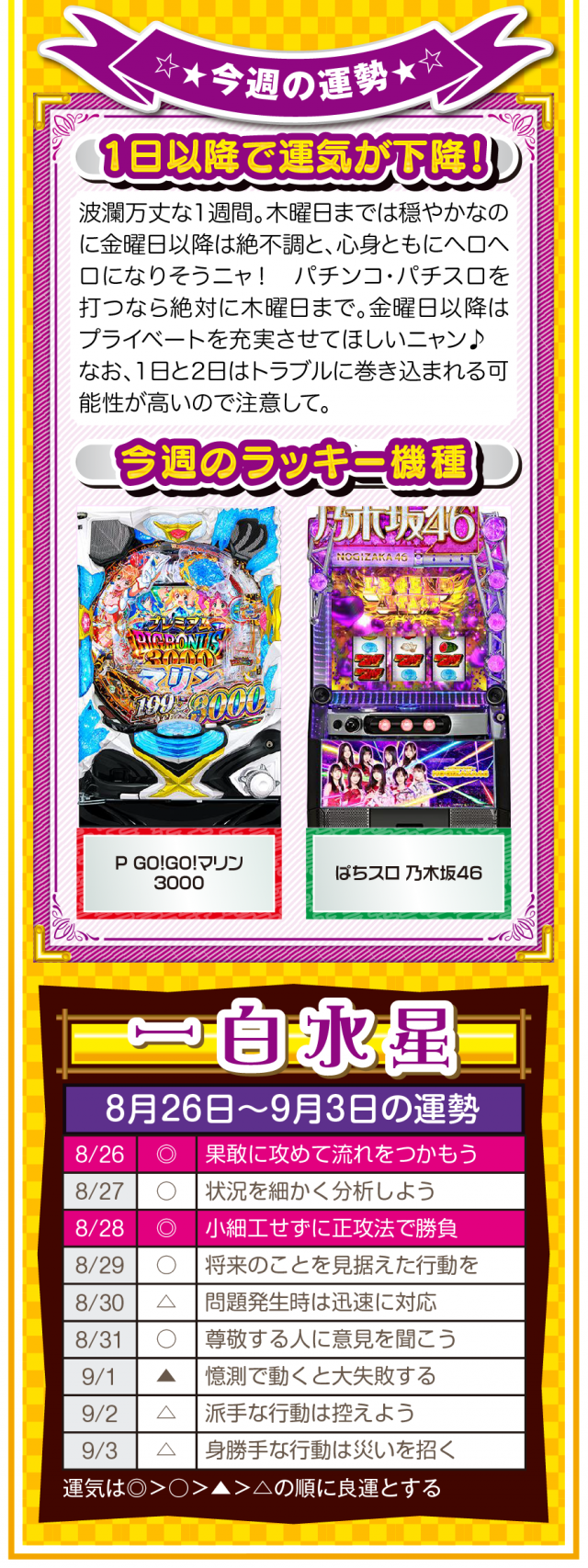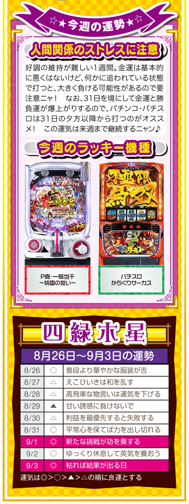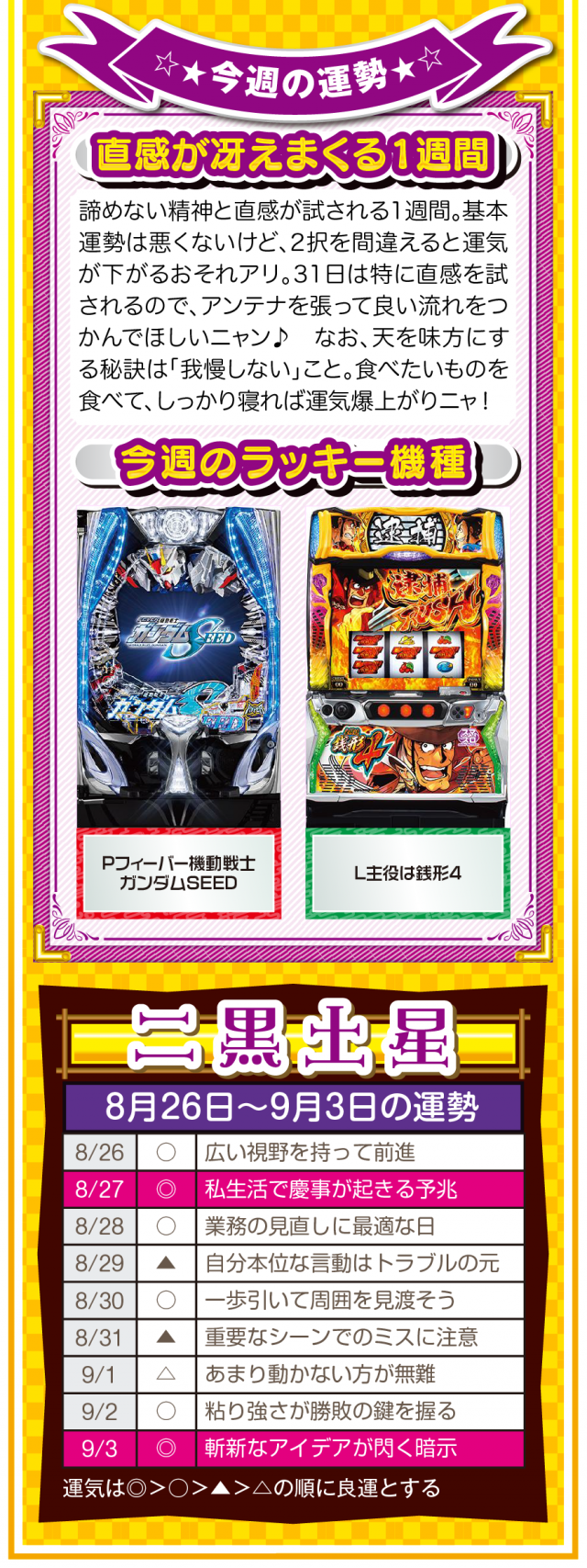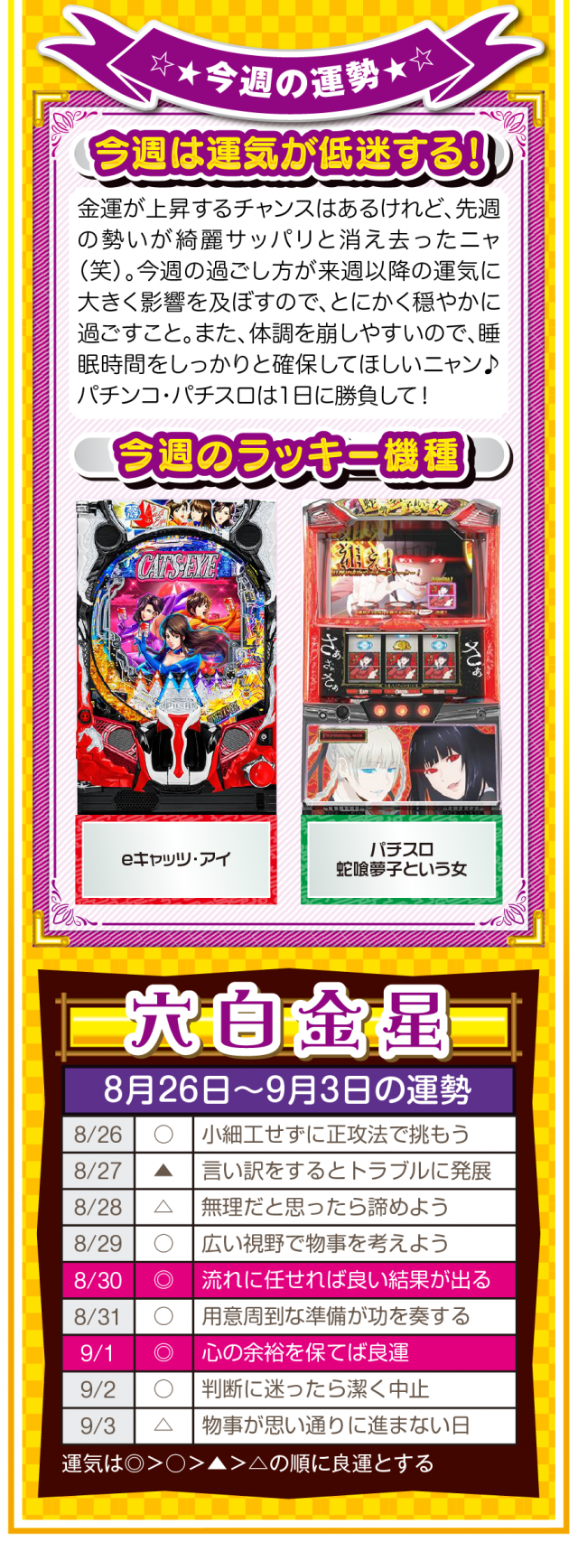 自分を磨いて磨いて磨きまくれば、それがやがて自信に変わるから。自分を磨いてから寄せても遅くはないし、その頃には寄せる必要がないほどモテているはずニャン♪ というわけで早速、8月28日から9月3日の1週間を鑑定ニャ(そろそろ胸すら寄せられない年齢に差し掛かったフォー・チュンチュンが、オマケとして8月26日と27日の運勢も鑑定したニャン♡)!
