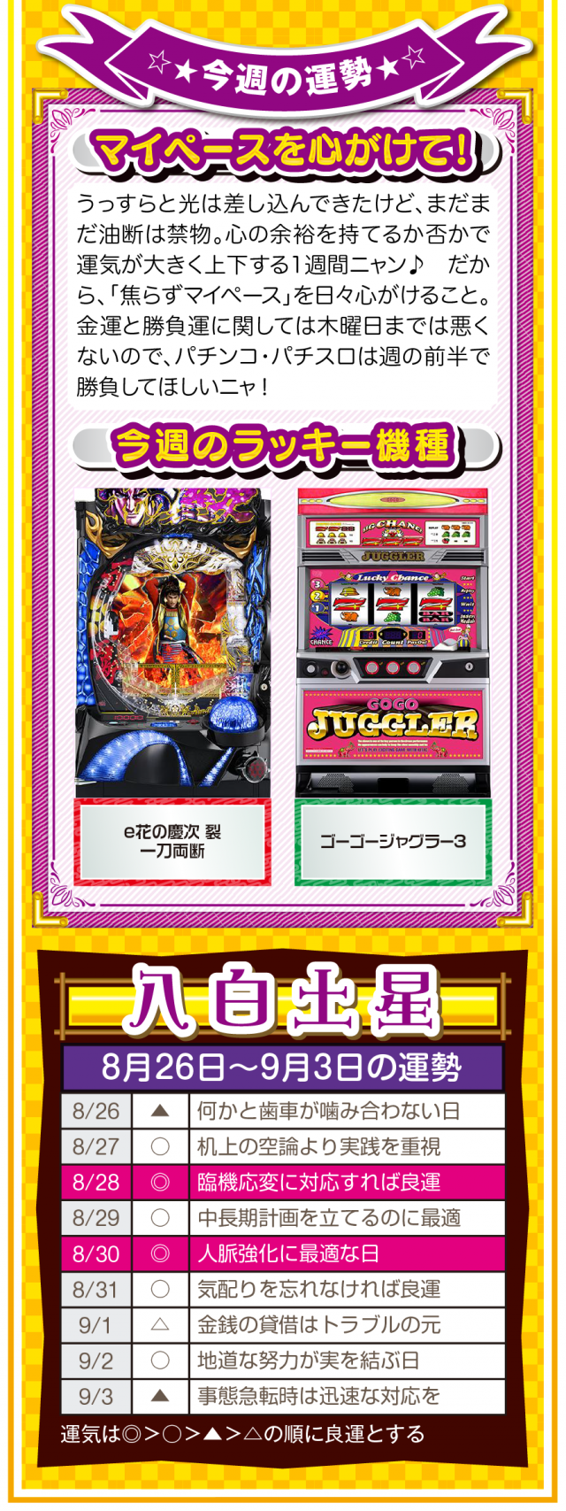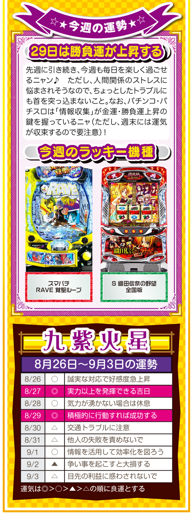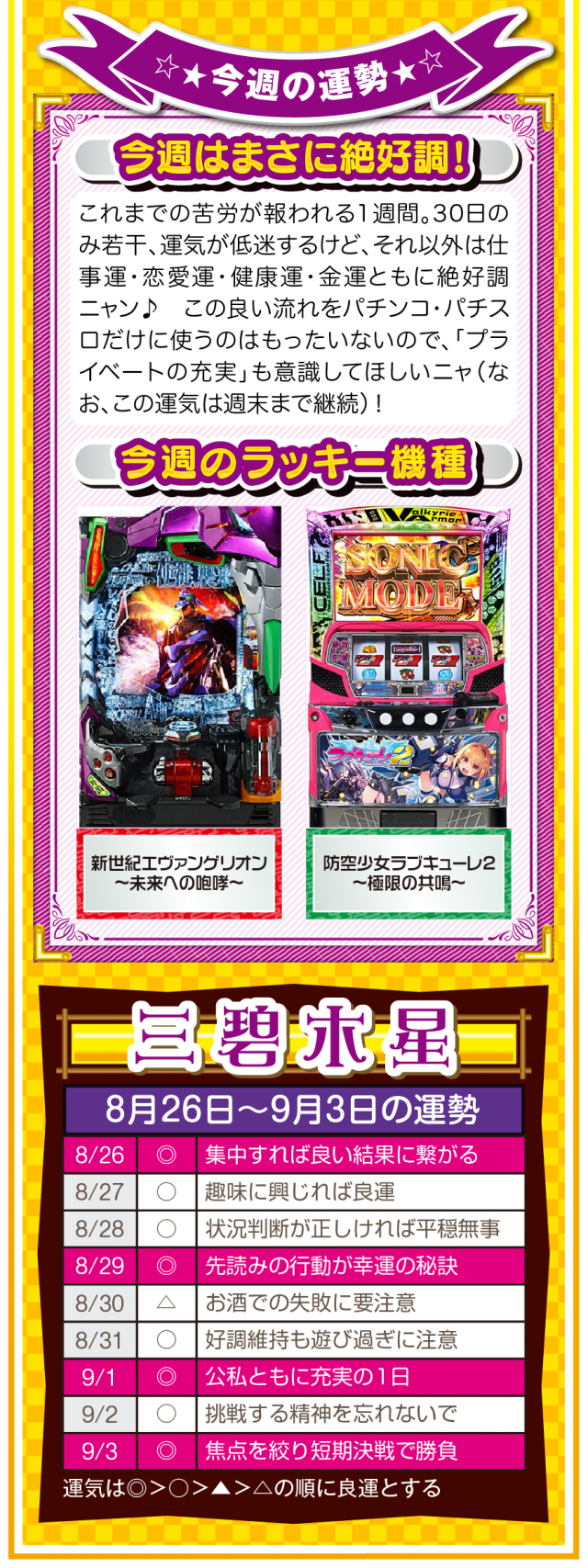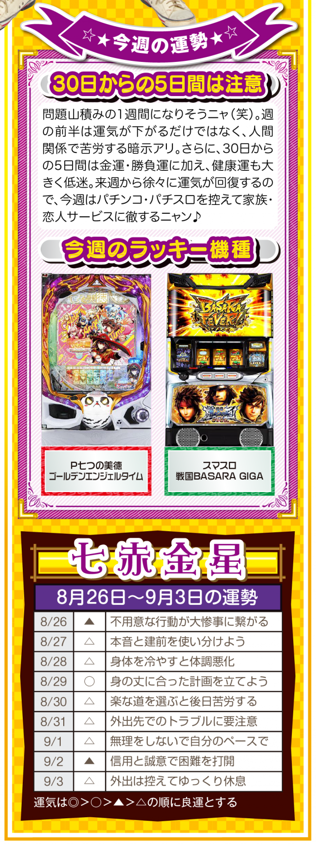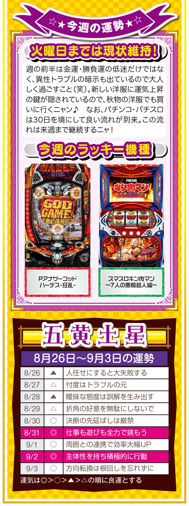 自分を磨いて磨いて磨きまくれば、それがやがて自信に変わるから。自分を磨いてから寄せても遅くはないし、その頃には寄せる必要がないほどモテているはずニャン♪ というわけで早速、8月28日から9月3日の1週間を鑑定ニャ(そろそろ胸すら寄せられない年齢に差し掛かったフォー・チュンチュンが、オマケとして8月26日と27日の運勢も鑑定したニャン♡)!