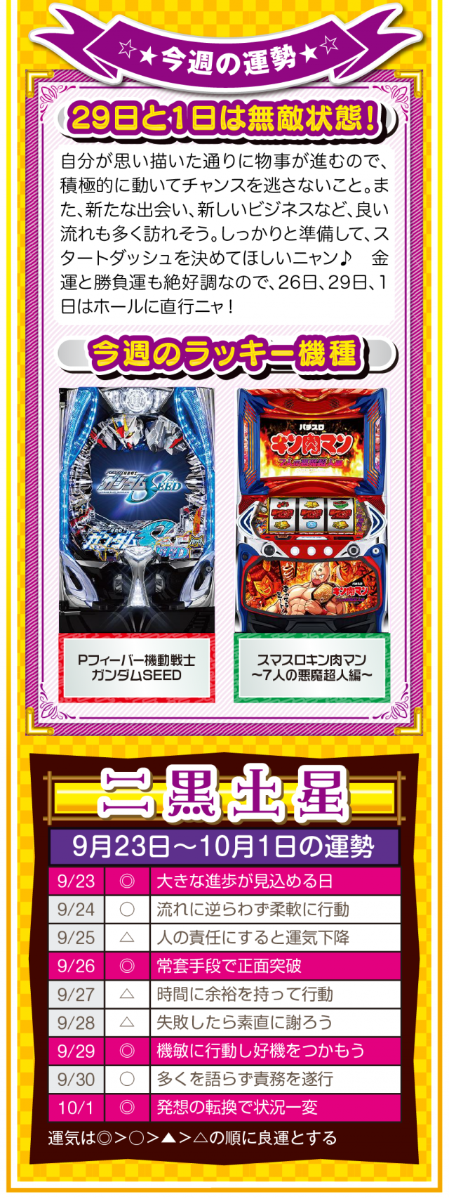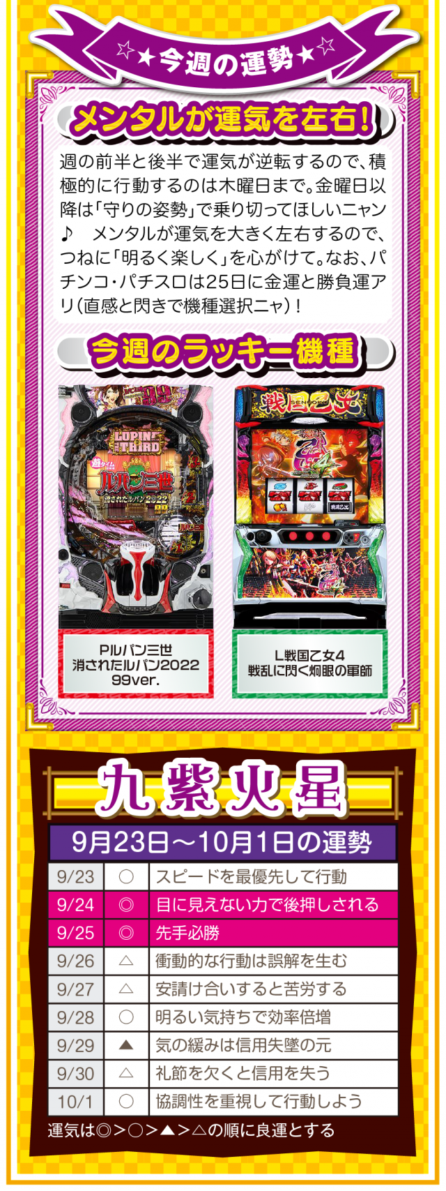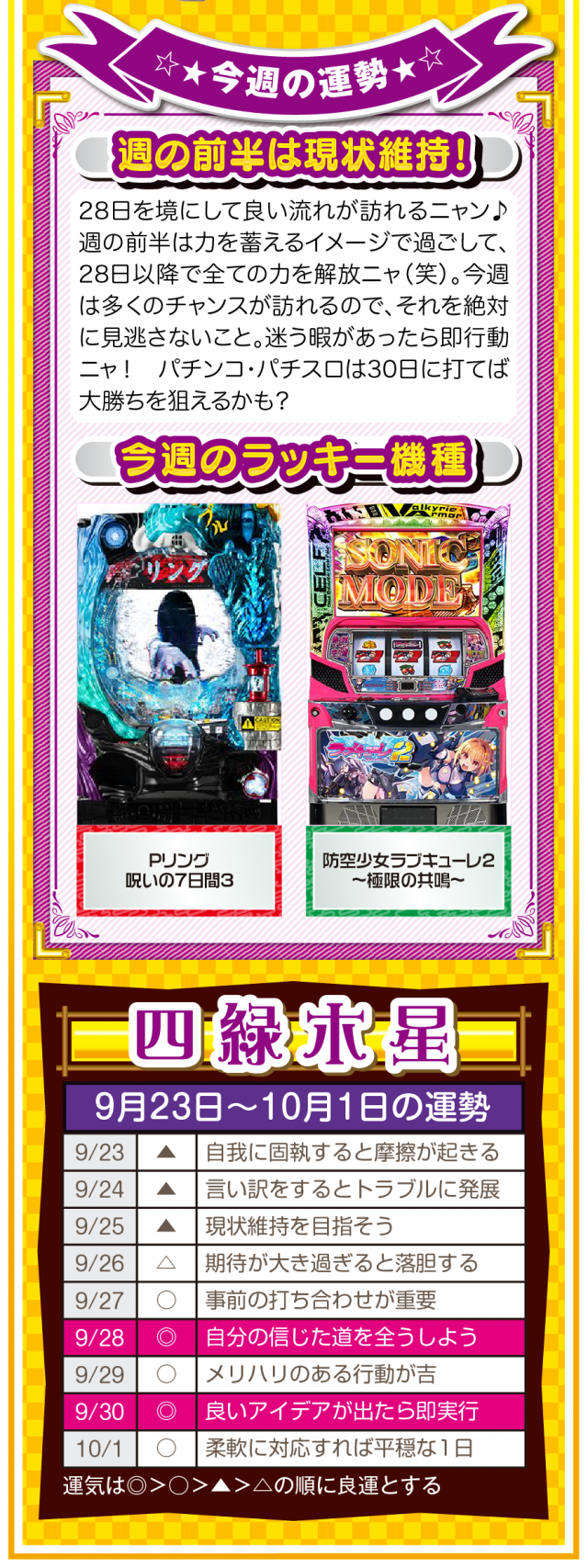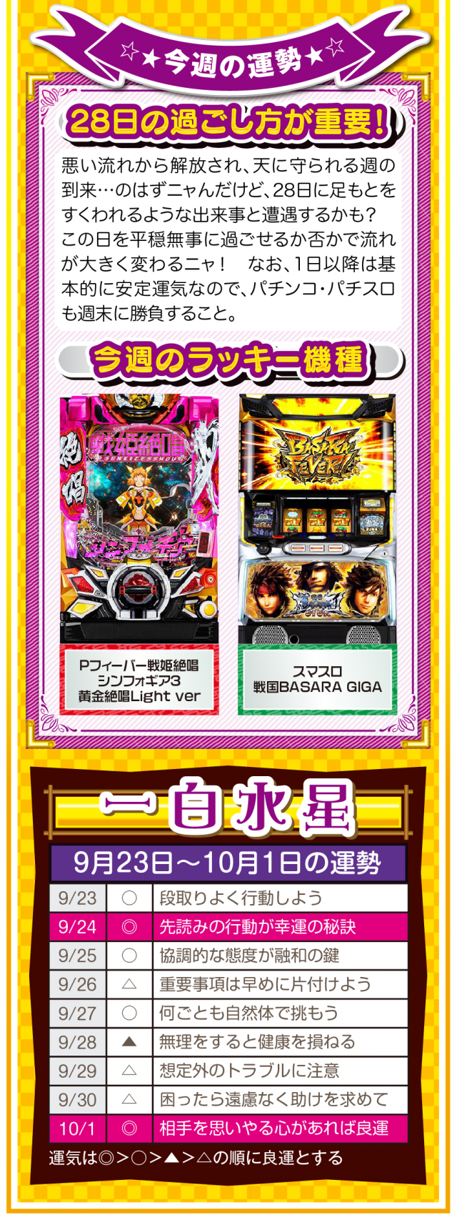 他人を褒められる人、そしてモテる人になるためにも、今週は自分探しの旅に出てほしいニャン♪ というわけで早速、9月25日から10月1日の1週間を鑑定ニャ(好みじゃない人にモテまくるフォー・チュンチュンが、今週もオマケとして23日と24日の運勢も鑑定したニャン♡)!