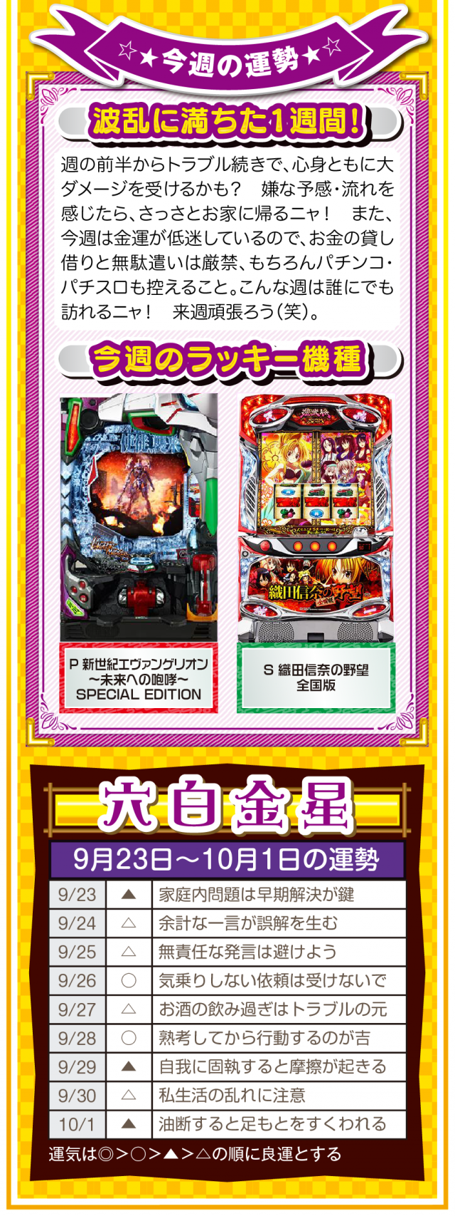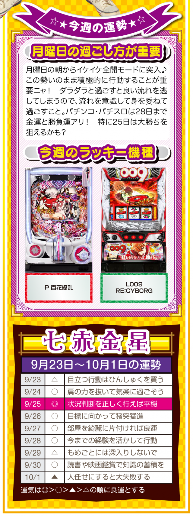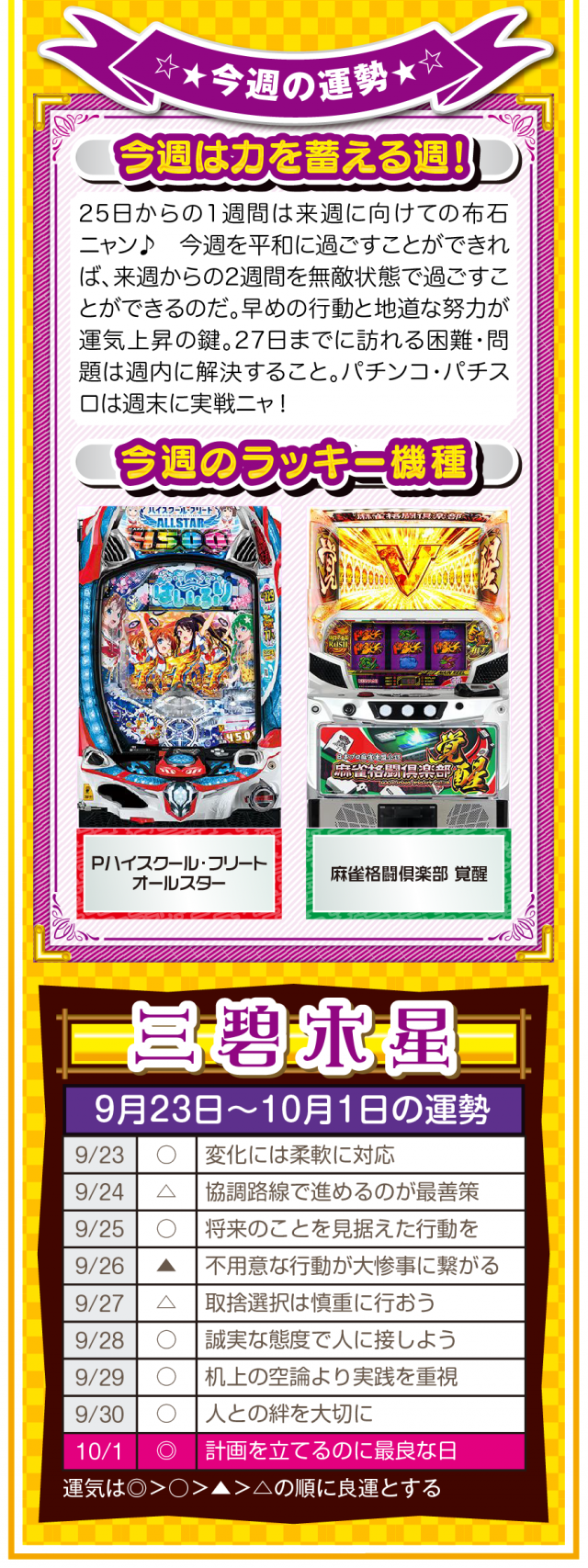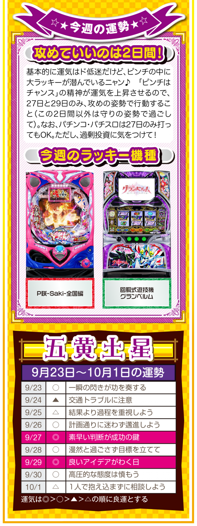 他人を褒められる人、そしてモテる人になるためにも、今週は自分探しの旅に出てほしいニャン♪ というわけで早速、9月25日から10月1日の1週間を鑑定ニャ(好みじゃない人にモテまくるフォー・チュンチュンが、今週もオマケとして23日と24日の運勢も鑑定したニャン♡)!