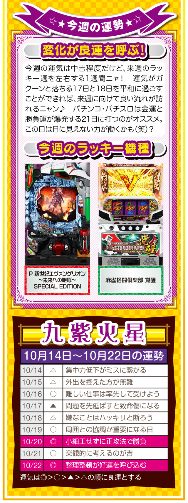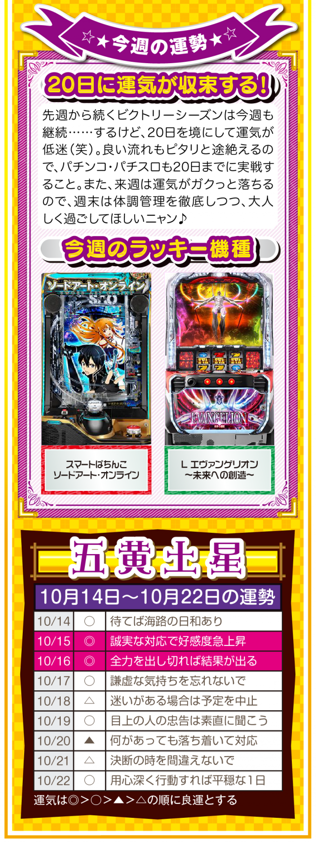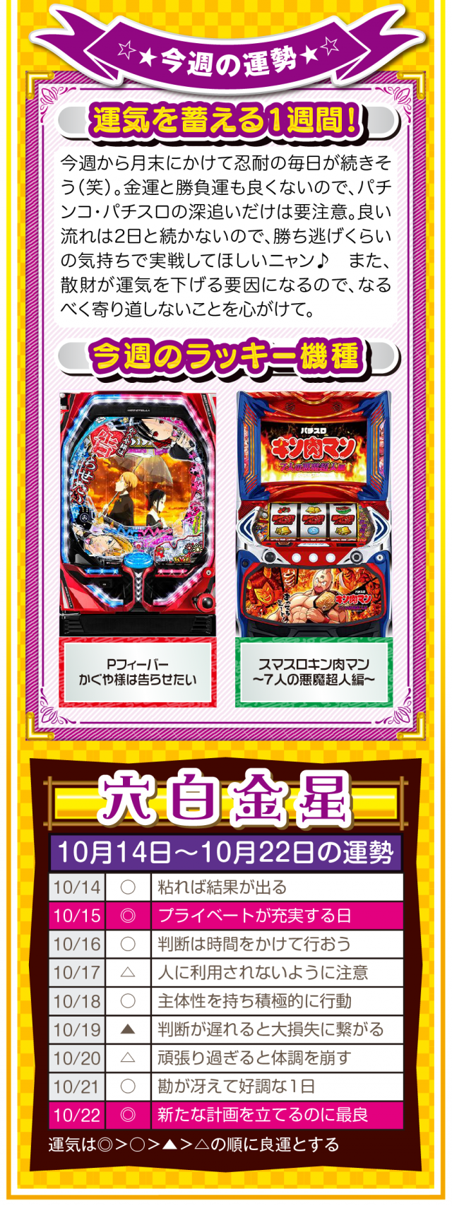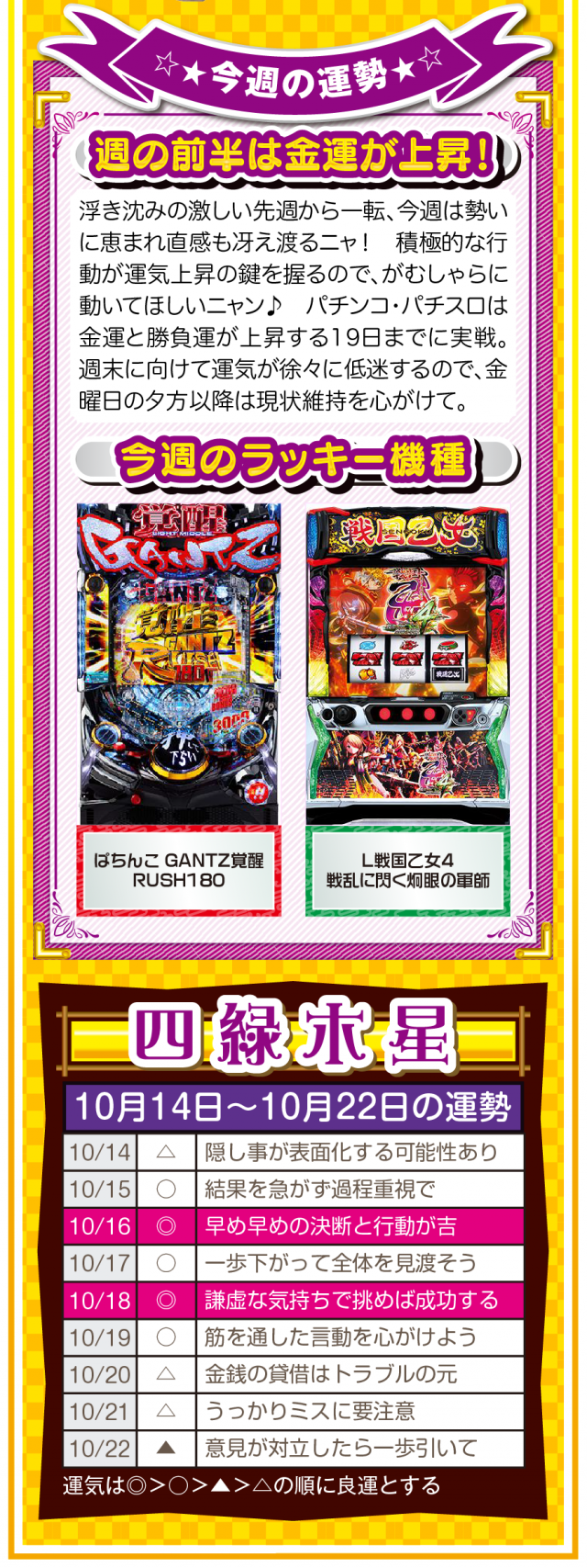 真剣に生きていれば挨拶と感謝は癖になるし、それが人生を成功に導く合い言葉になることを覚えておいてほしいニャン♪ というわけで早速、10月16日から22日の1週間を鑑定ニャ(おかげさまで締め切りギリギリのフォー・チュンチュンが、今週もオマケとして14日と15日の運勢も鑑定したニャン♡)!