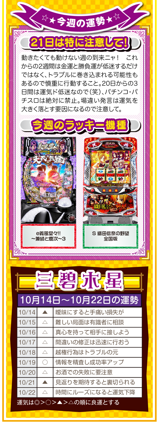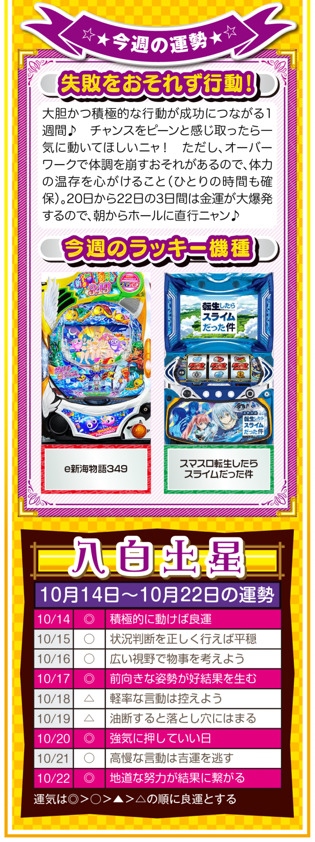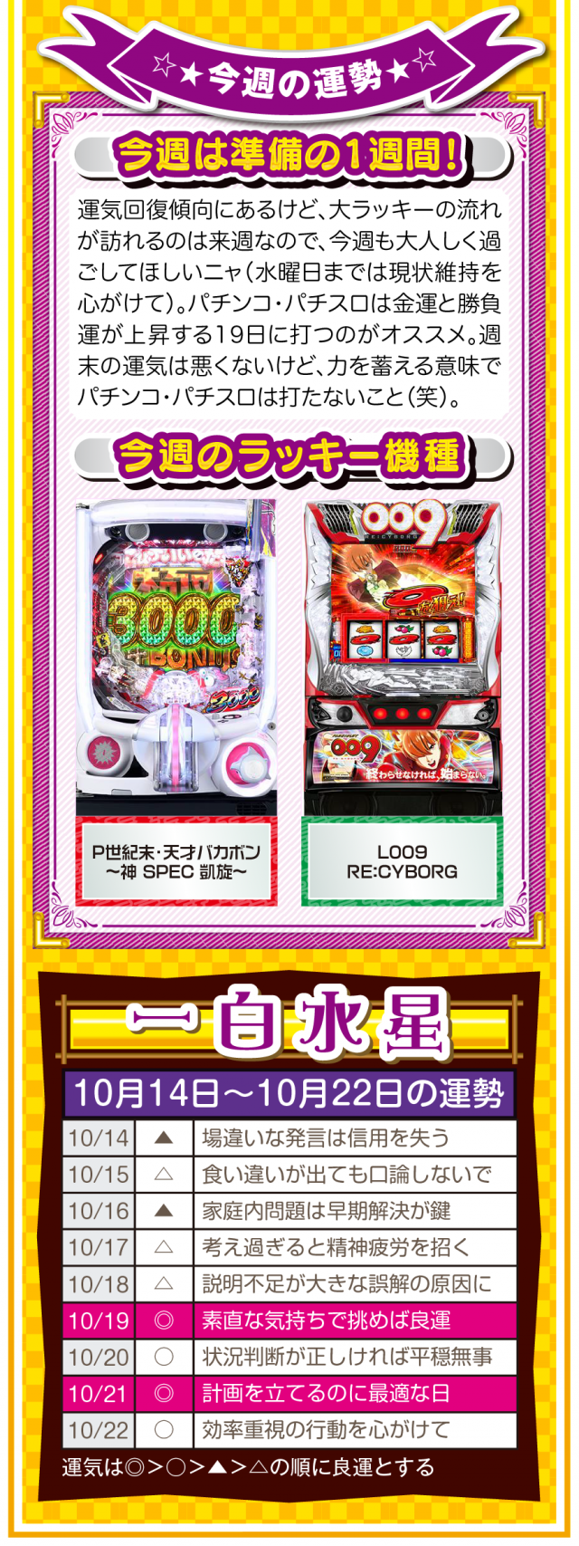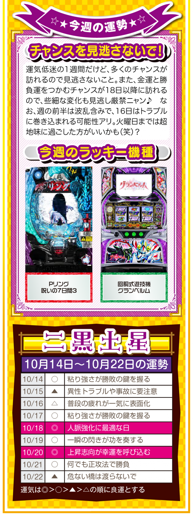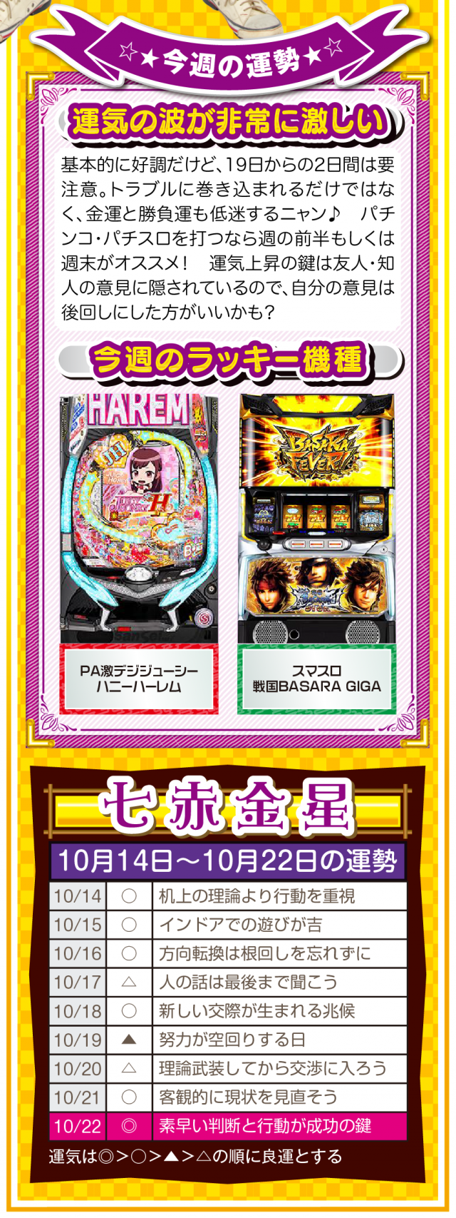 真剣に生きていれば挨拶と感謝は癖になるし、それが人生を成功に導く合い言葉になることを覚えておいてほしいニャン♪ というわけで早速、10月16日から22日の1週間を鑑定ニャ(おかげさまで締め切りギリギリのフォー・チュンチュンが、今週もオマケとして14日と15日の運勢も鑑定したニャン♡)!