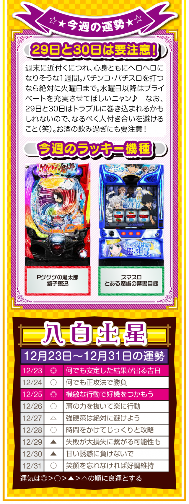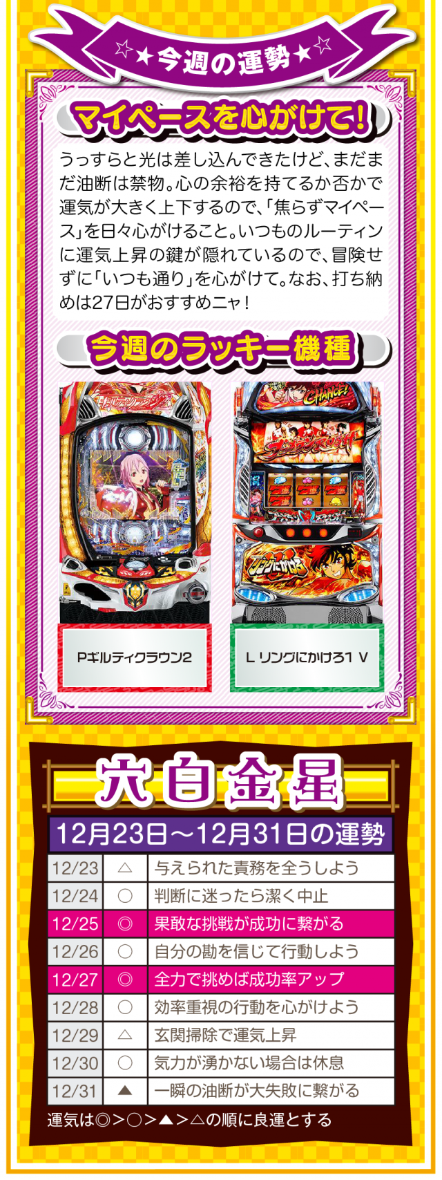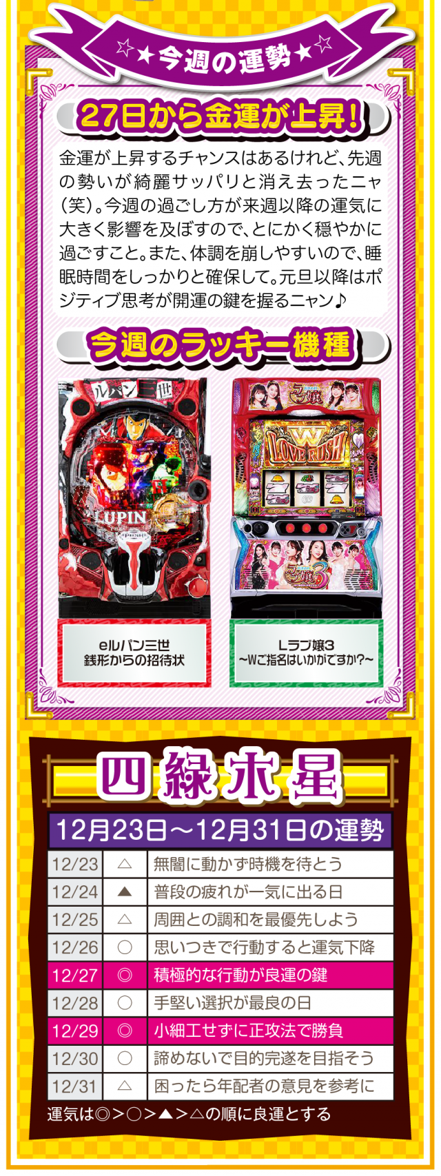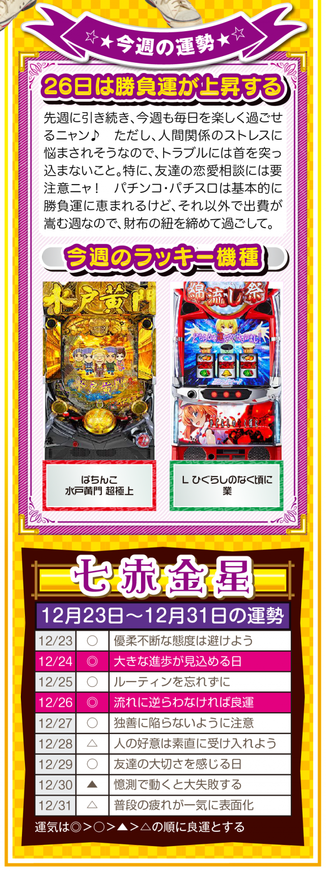 パチンコ・パチスロも「当てたい」ではなく「当てる」(笑)。そのための行動、思考によって、「運とツキに愛されるか否かが決まる」ことを覚えておいてほしいニャン♪ というわけで早速、12月25日から31日の1週間を鑑定ニャ(結婚に対する夢と希望を忘れ気味のフォー・チュンチュンが、オマケとして12月23日と24日の運勢も鑑定したニャン♡)!