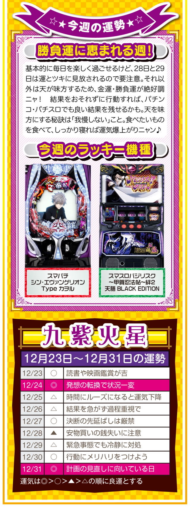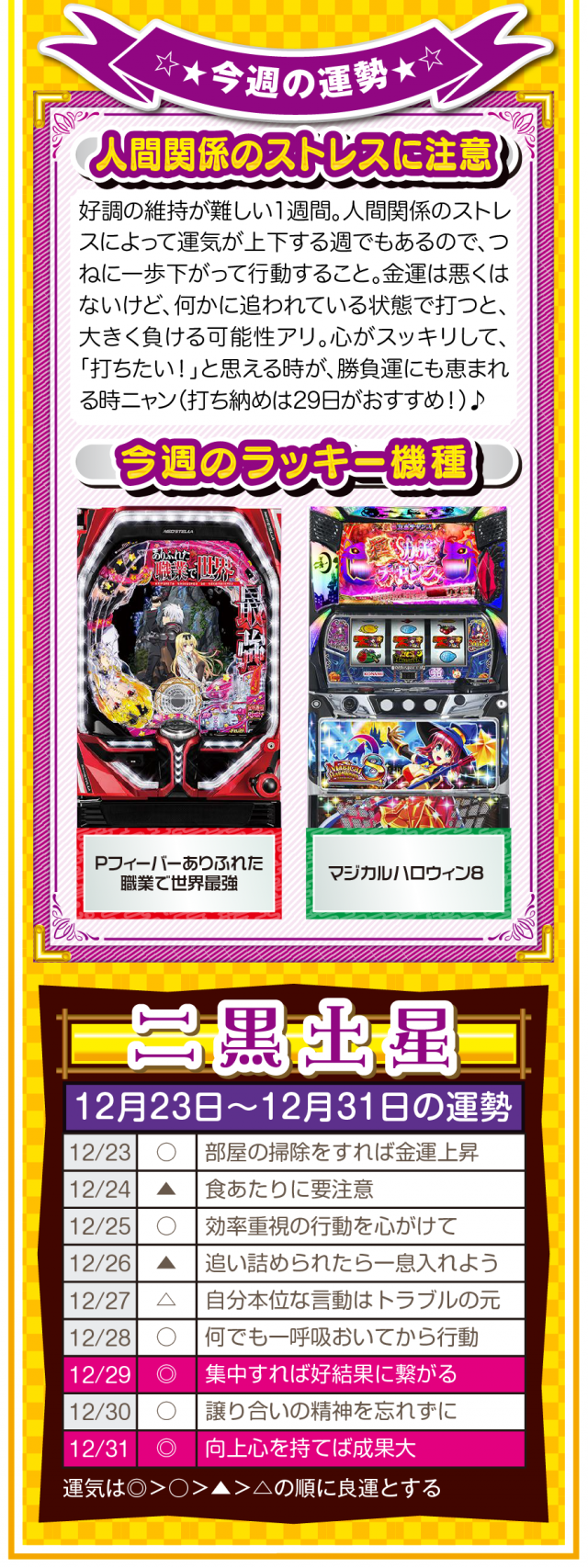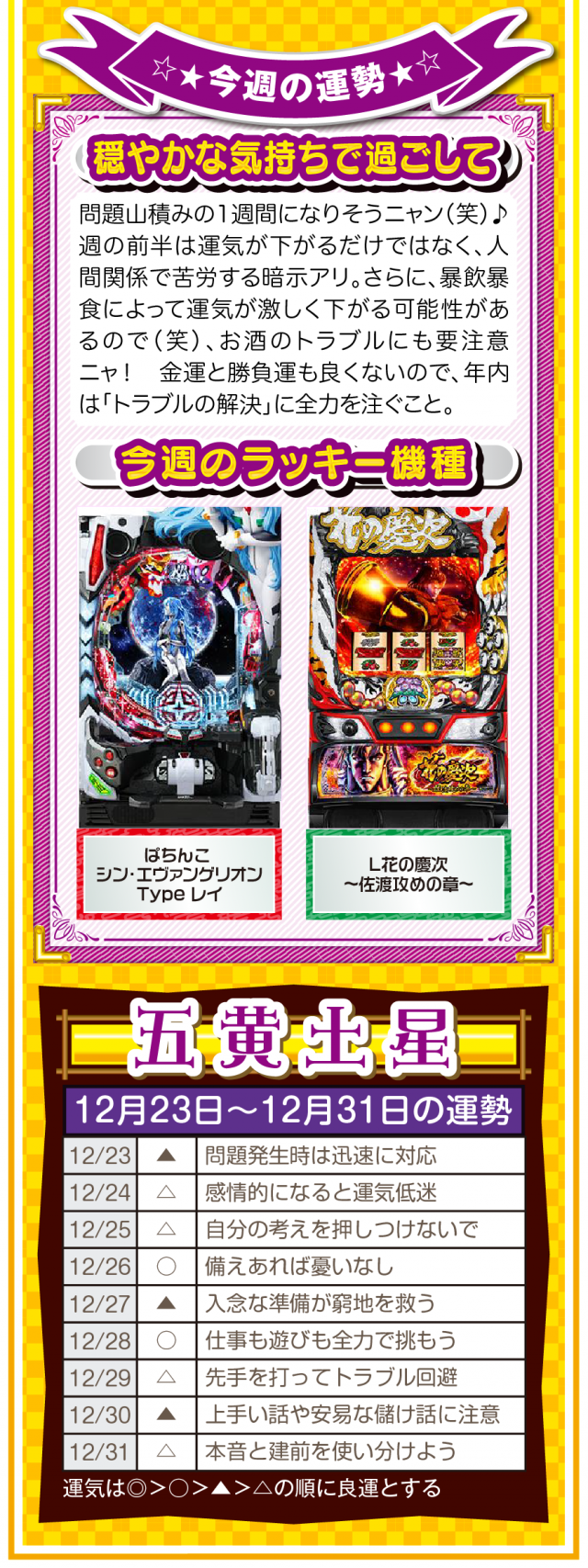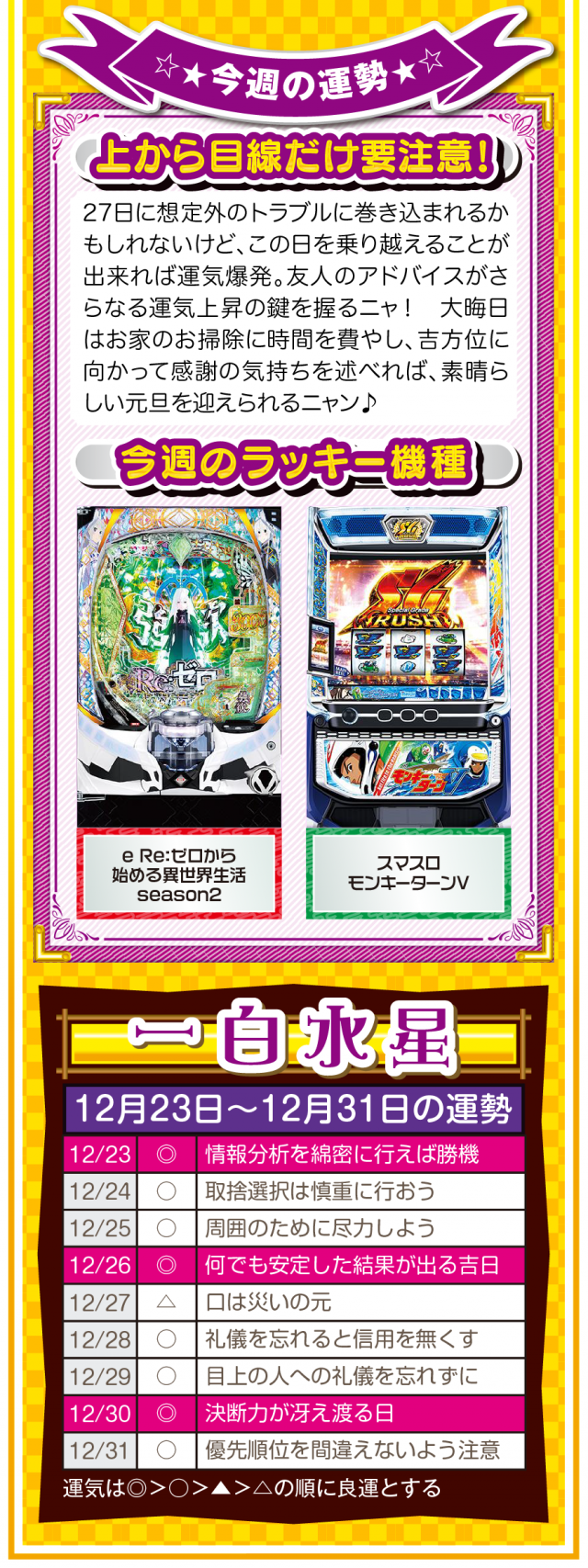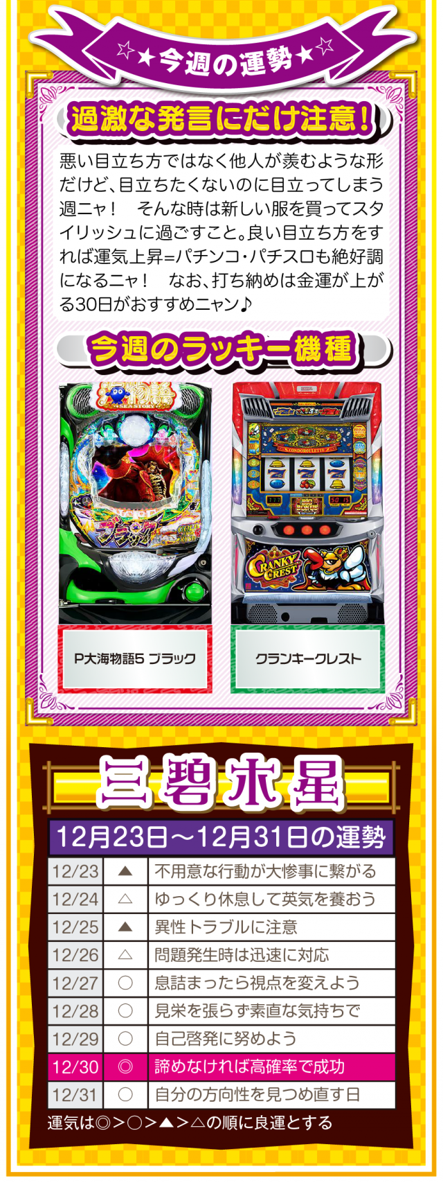 パチンコ・パチスロも「当てたい」ではなく「当てる」(笑)。そのための行動、思考によって、「運とツキに愛されるか否かが決まる」ことを覚えておいてほしいニャン♪ というわけで早速、12月25日から31日の1週間を鑑定ニャ(結婚に対する夢と希望を忘れ気味のフォー・チュンチュンが、オマケとして12月23日と24日の運勢も鑑定したニャン♡)!