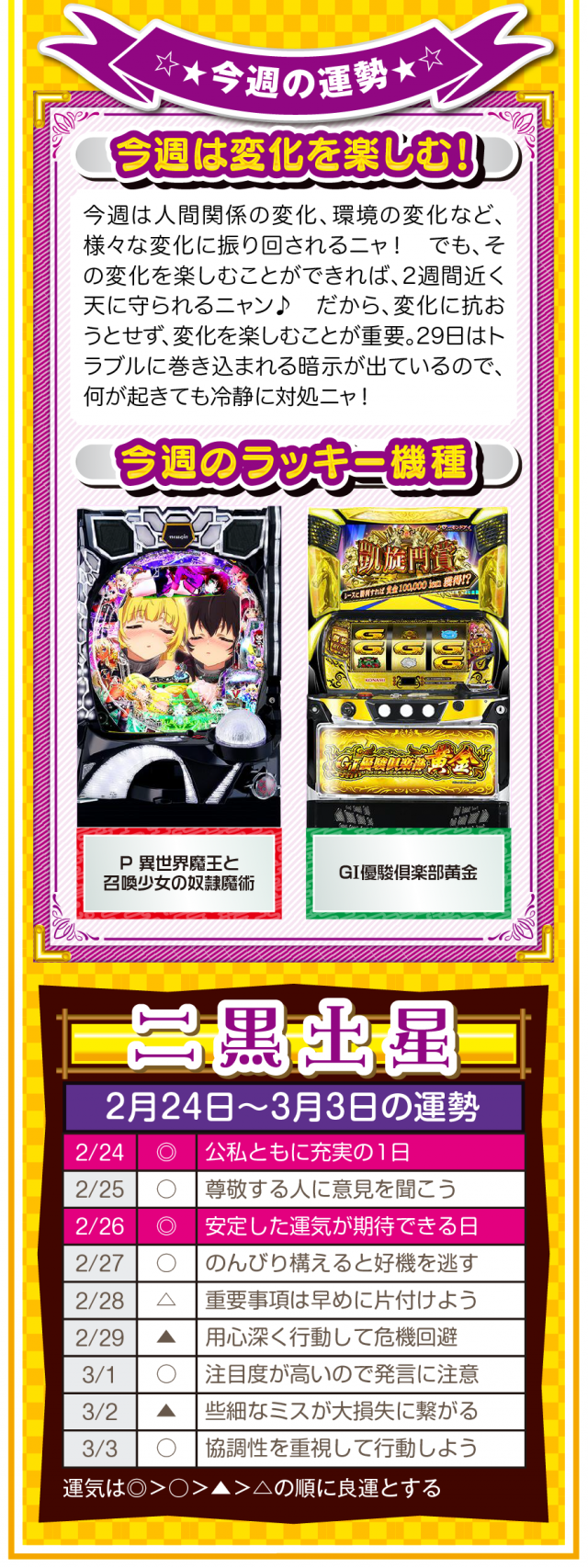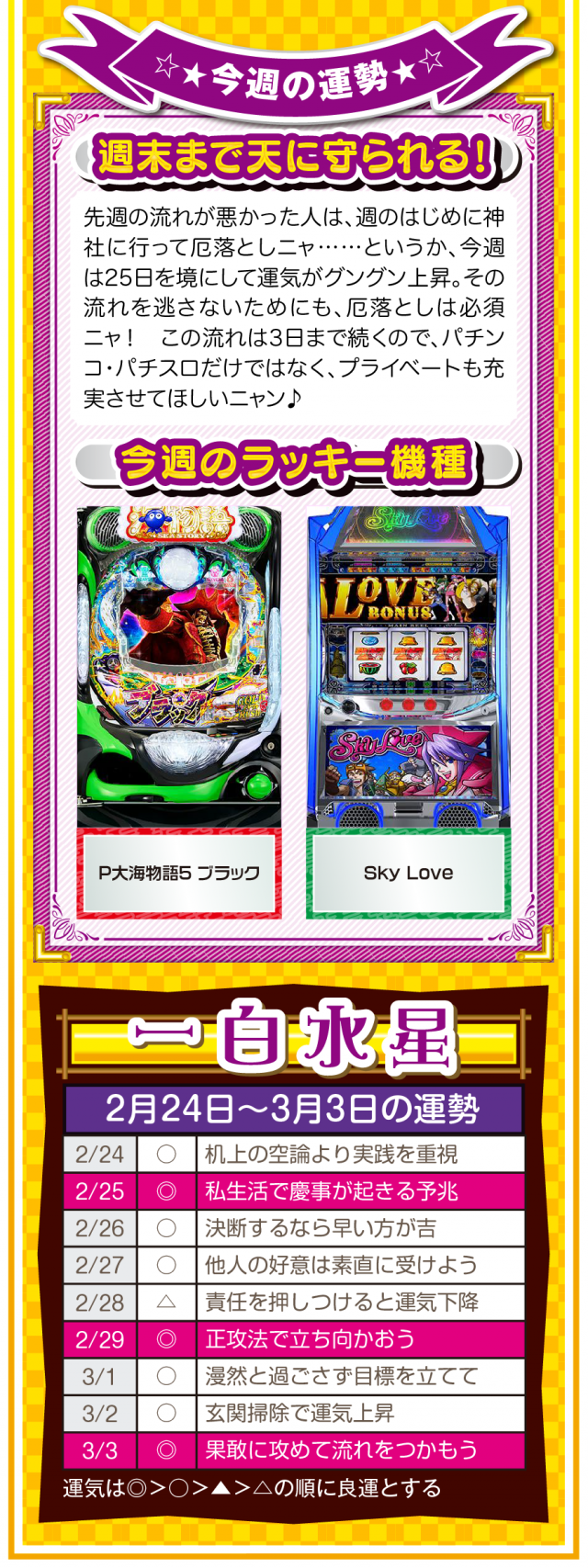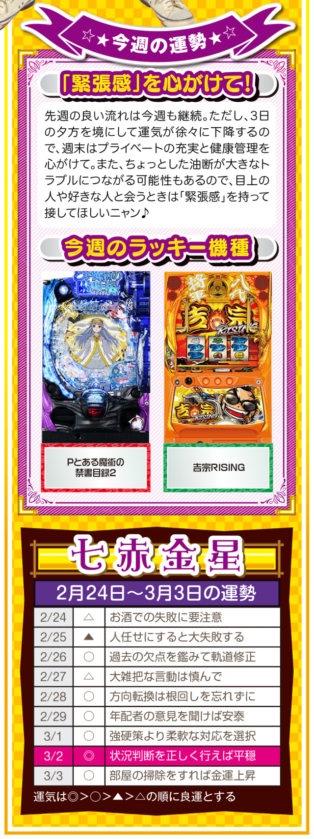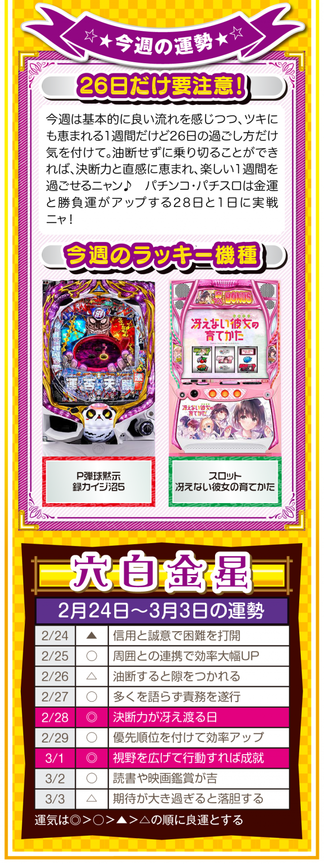 「選ぶ」前に「選ばれる」人間を目指す。選ばれる人間は、運にもツキにも選ばれることを覚えておいてほしいニャ! というわけで早速、2月26日から3月3日の1週間を鑑定ニャ(異性にとにかく選ばれたいフォー・チュンチュンが、オマケとして2月24日と25日の運勢も鑑定したニャ♡)!