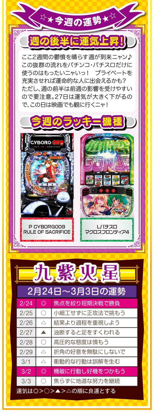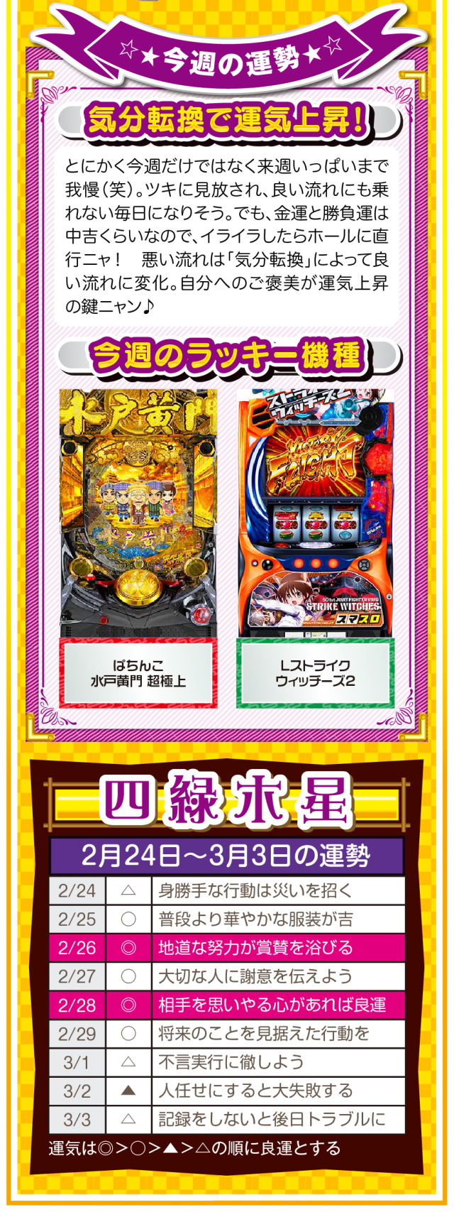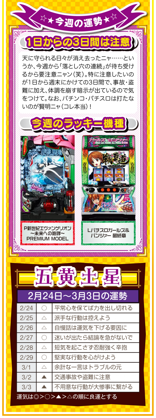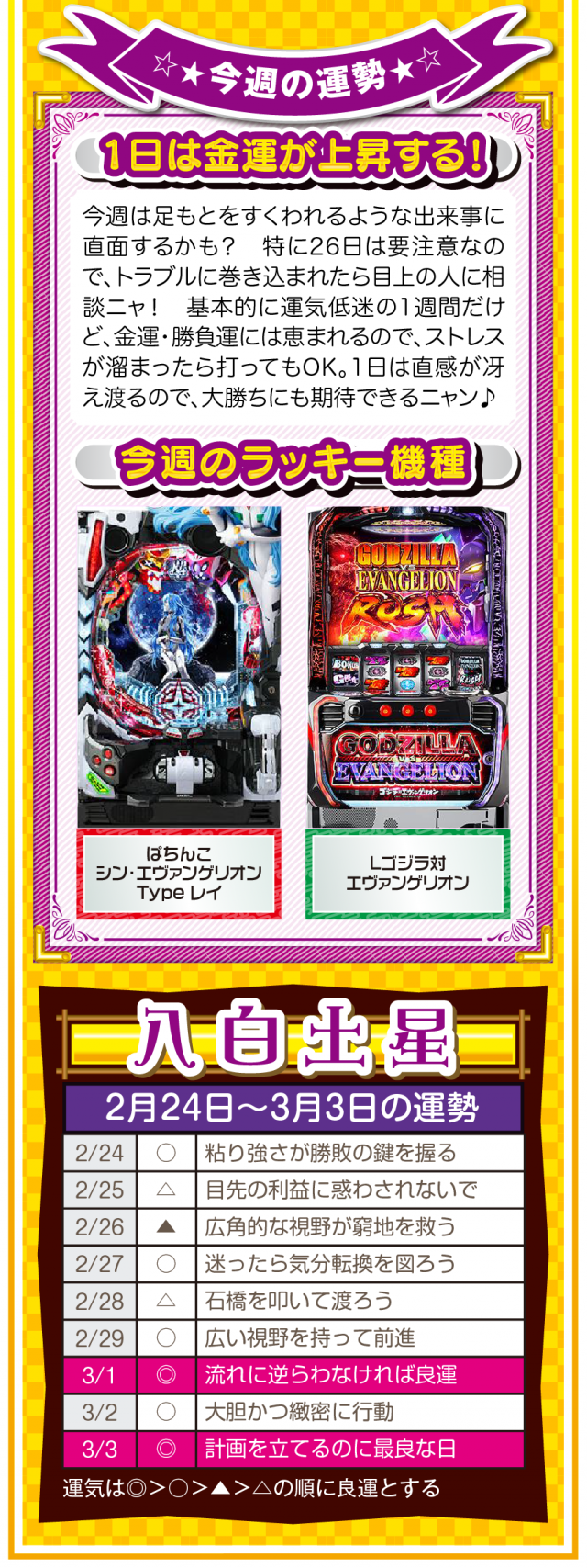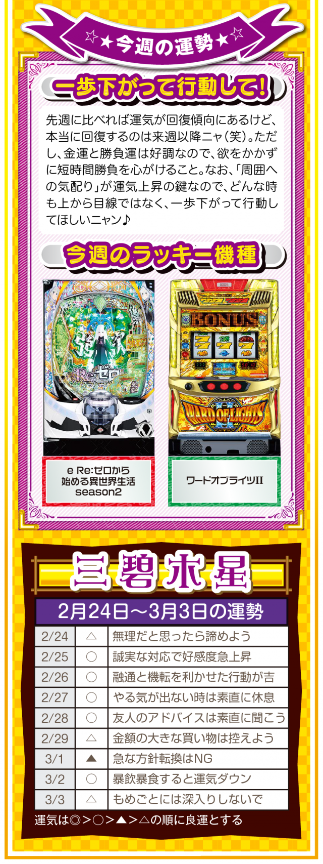 「選ぶ」前に「選ばれる」人間を目指す。選ばれる人間は、運にもツキにも選ばれることを覚えておいてほしいニャ! というわけで早速、2月26日から3月3日の1週間を鑑定ニャ(異性にとにかく選ばれたいフォー・チュンチュンが、オマケとして2月24日と25日の運勢も鑑定したニャ♡)!
