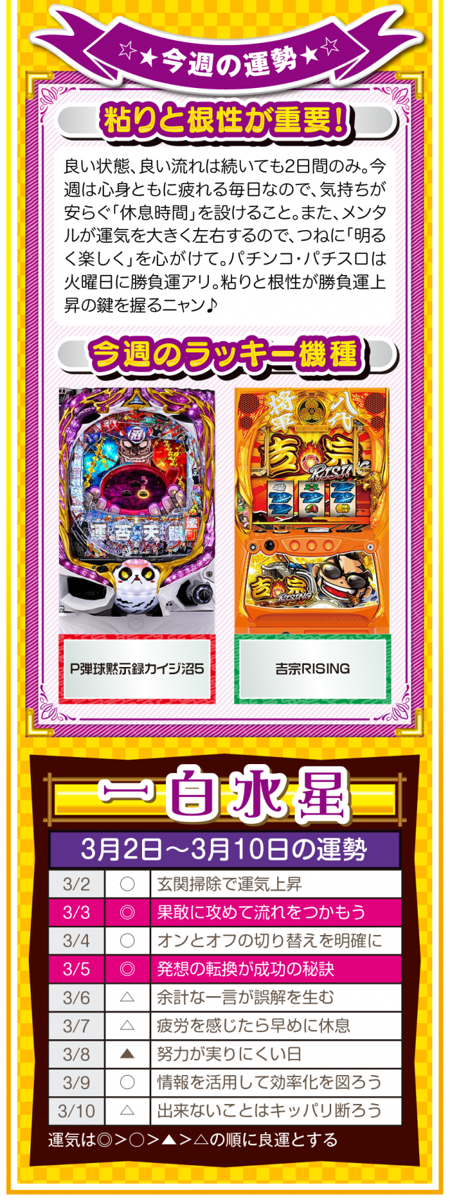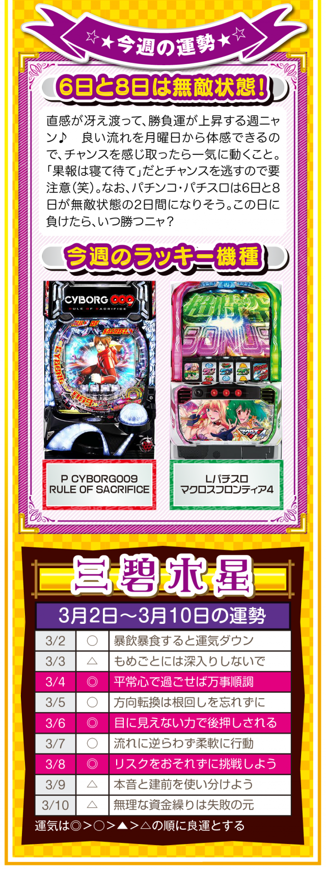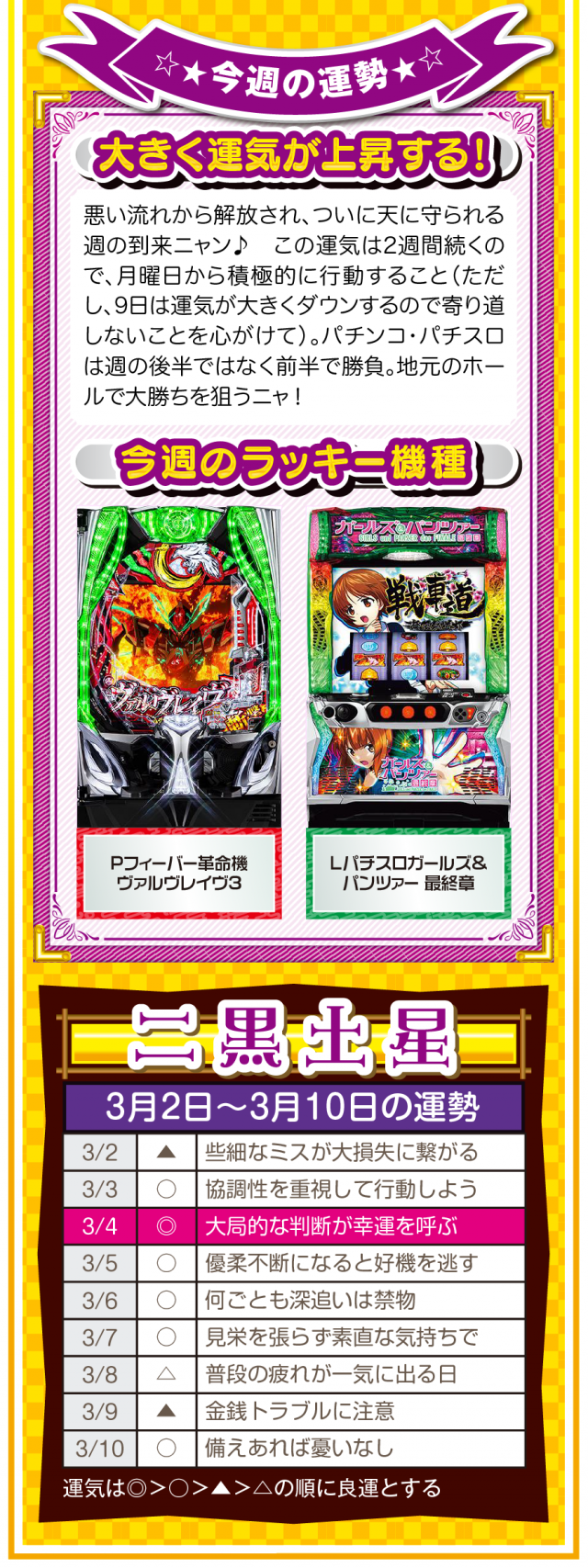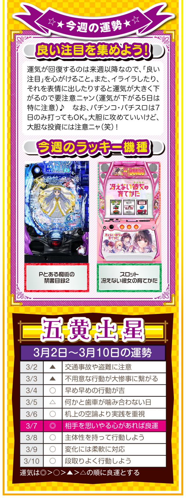 人を褒められる人は、褒められる人生を送ることが出来ることを覚えておいてほしいニャ! というわけで早速、3月4日から10日の1週間を鑑定ニャン(友達になかなか褒められないフォー・チュンチュンが、オマケとして3月2日と3日の運勢も鑑定したニャ♡)!