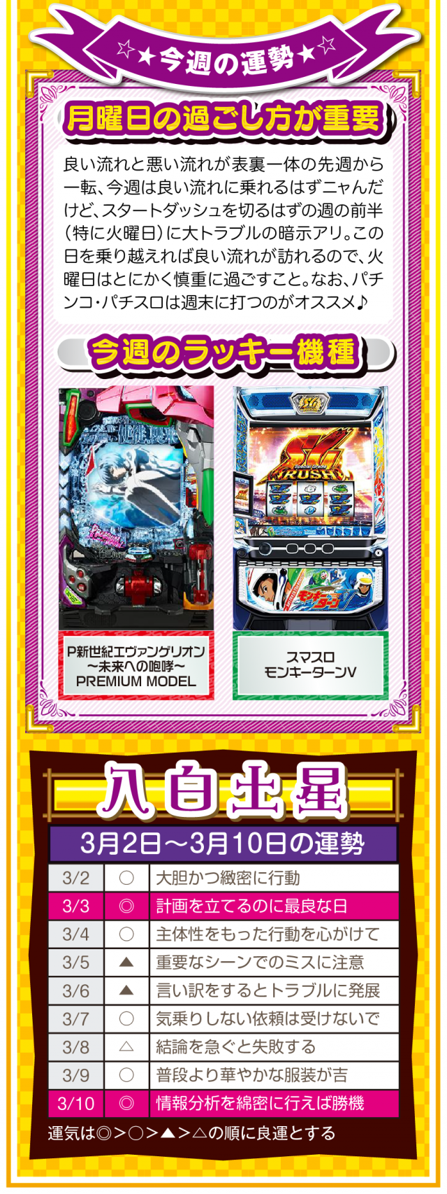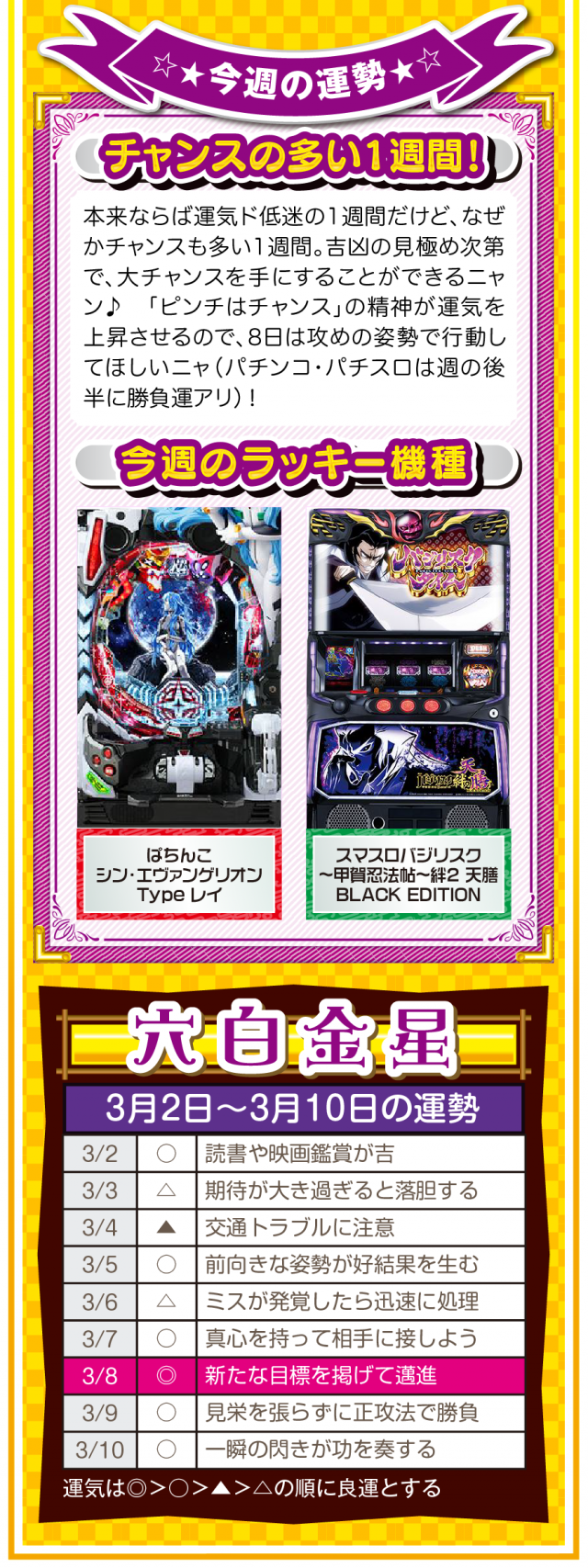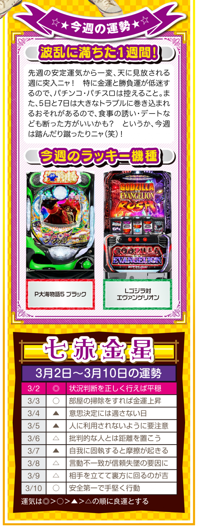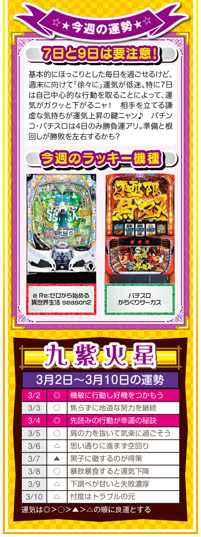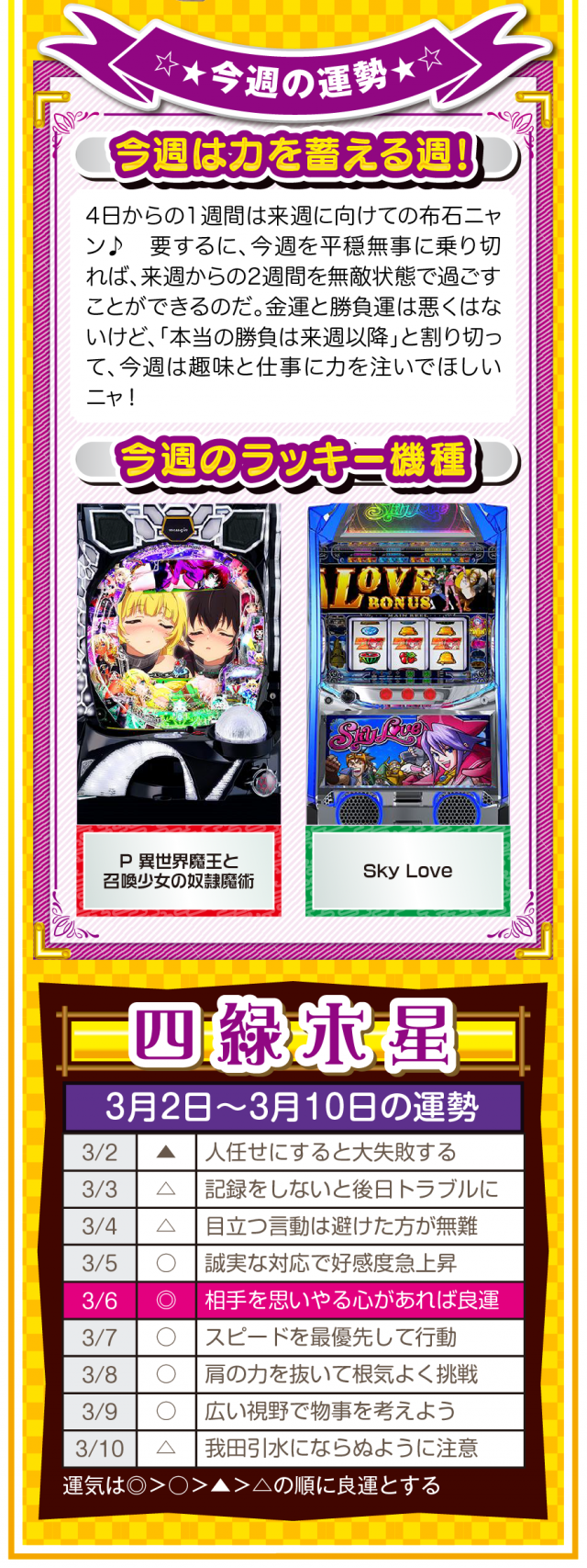 人を褒められる人は、褒められる人生を送ることが出来ることを覚えておいてほしいニャ! というわけで早速、3月4日から10日の1週間を鑑定ニャン(友達になかなか褒められないフォー・チュンチュンが、オマケとして3月2日と3日の運勢も鑑定したニャ♡)!