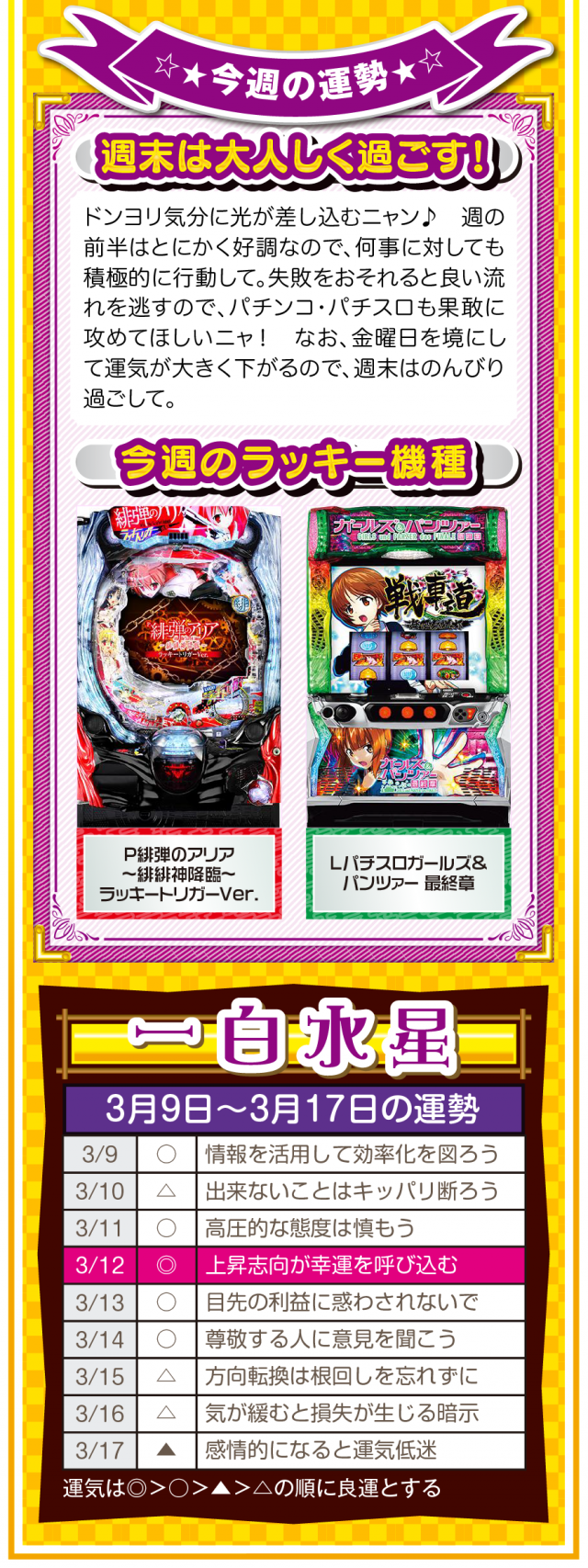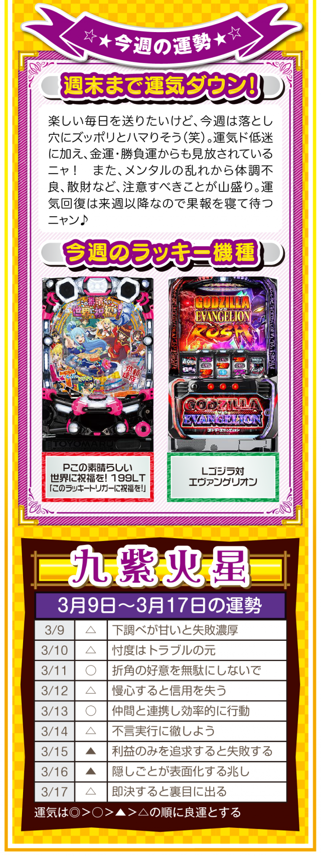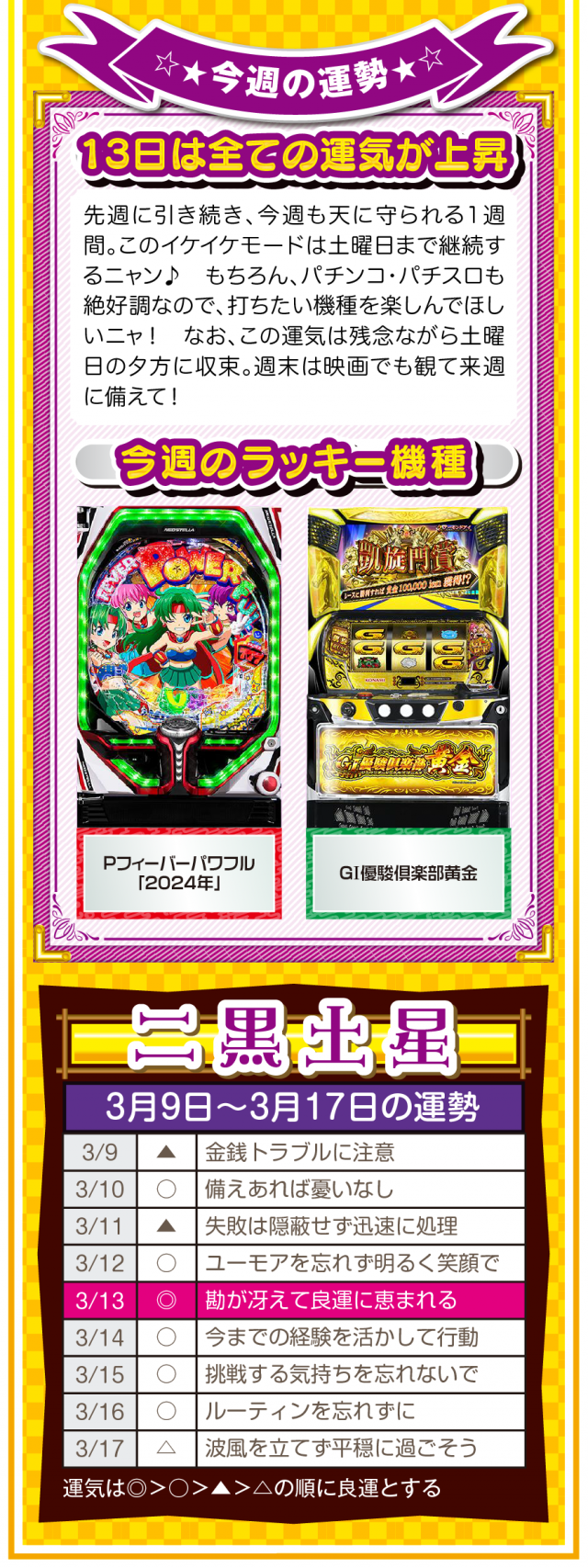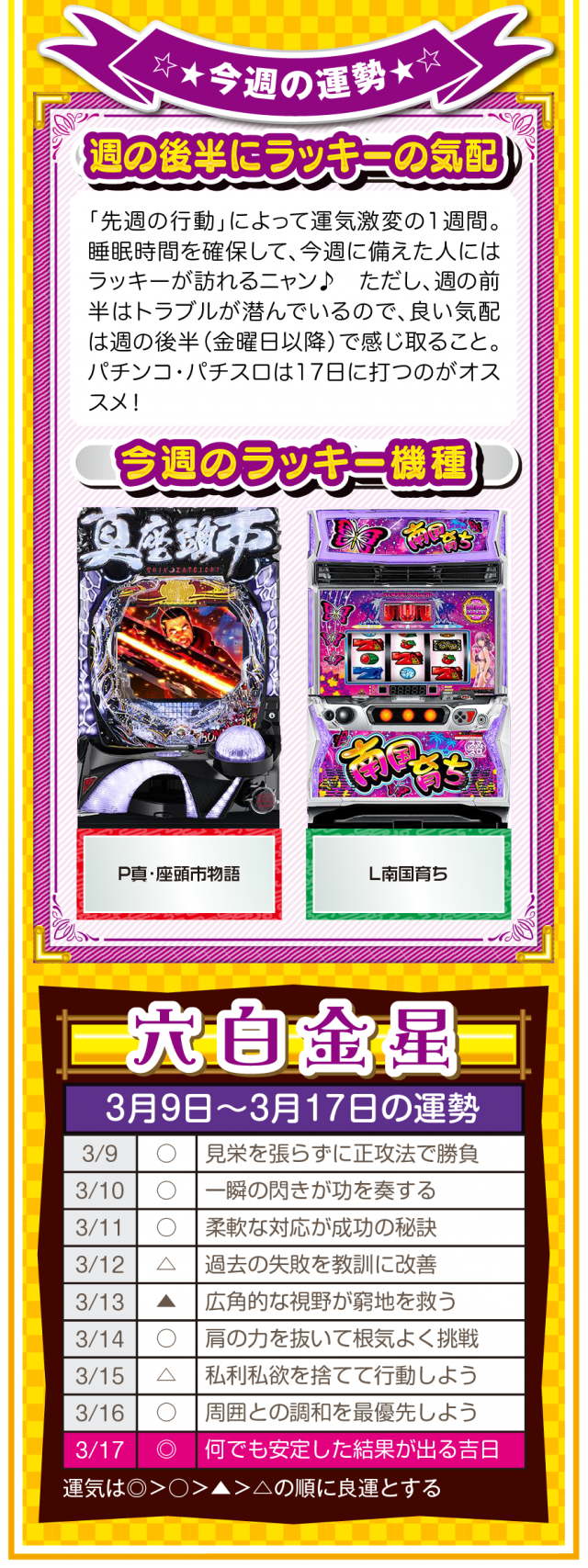 悲しみと辛さを共有すると言っても、その深さは共有出来ないニャ! 共有出来ないからこそ、「笑顔」と「笑い」が“至高の薬”であることを覚えておいてほしいニャン♪ というわけで早速、3月11日から17日の1週間を鑑定ニャ(最近、幸せについて深く考えるフォー・チュンチュンが、オマケとして3月9日と10日の運勢も鑑定したニャン♡)!