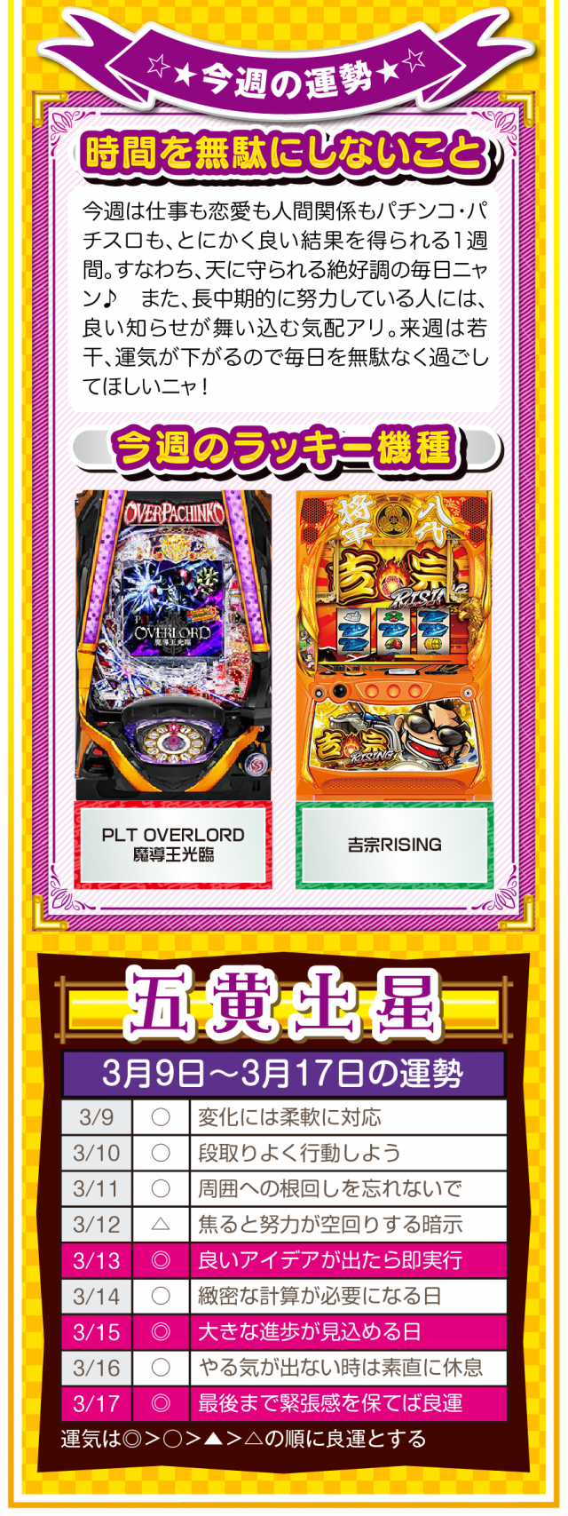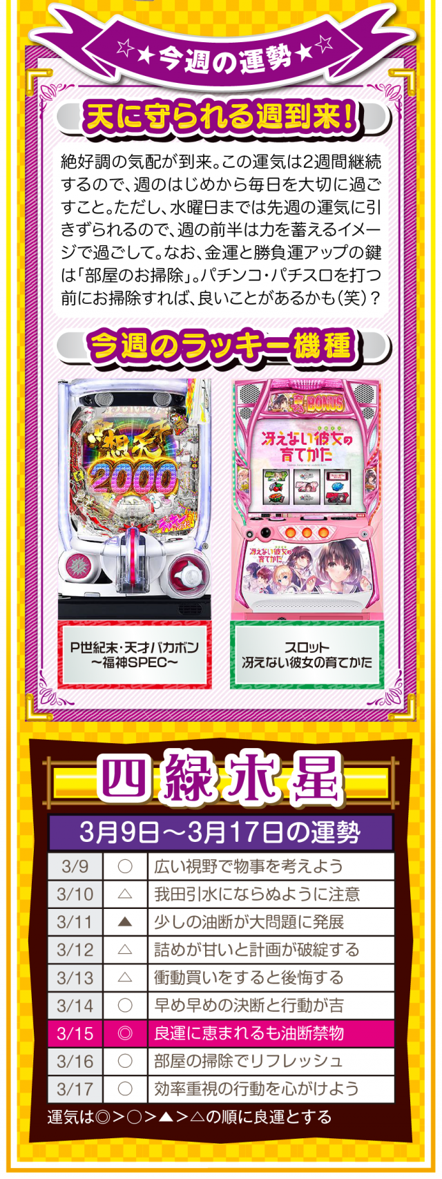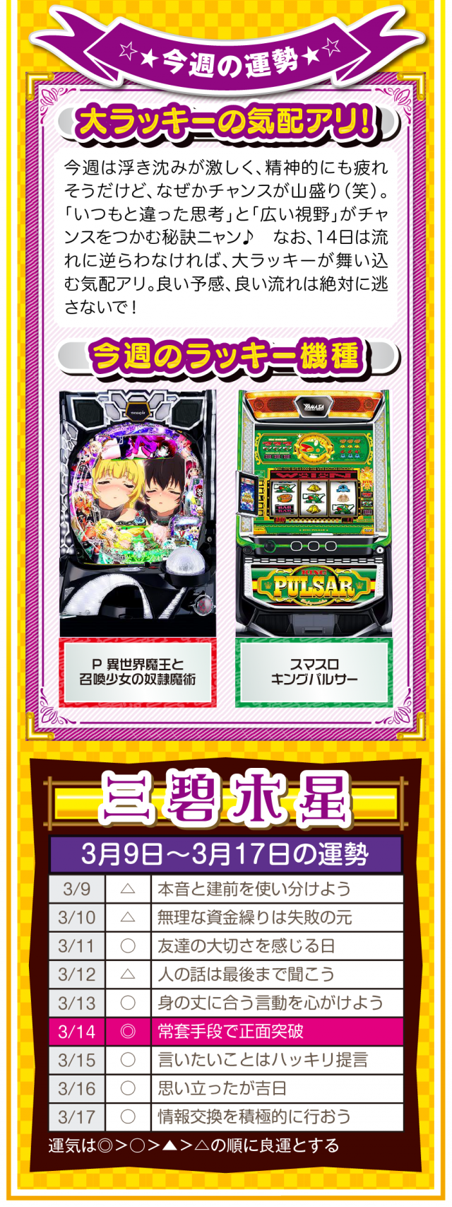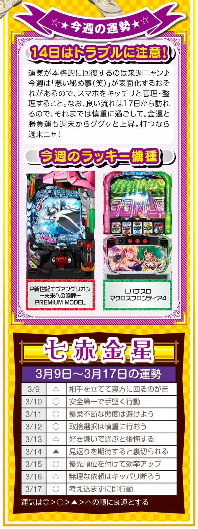 悲しみと辛さを共有すると言っても、その深さは共有出来ないニャ! 共有出来ないからこそ、「笑顔」と「笑い」が“至高の薬”であることを覚えておいてほしいニャン♪ というわけで早速、3月11日から17日の1週間を鑑定ニャ(最近、幸せについて深く考えるフォー・チュンチュンが、オマケとして3月9日と10日の運勢も鑑定したニャン♡)!