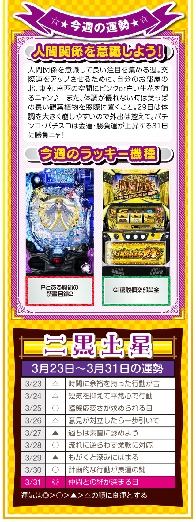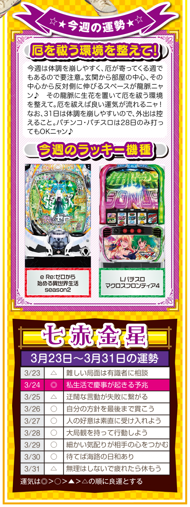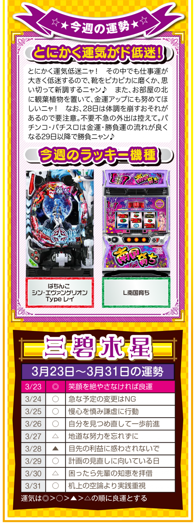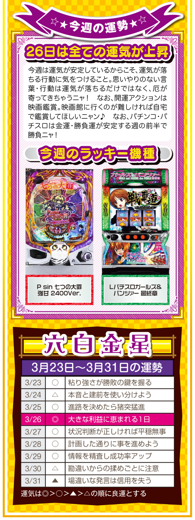 だから困難から逃げず常に立ち向かう人は、人にも運にも恵まれる。困難から逃げる「思い通りの人生」からは「孤立」しか生まれないことを覚えておいてほしいニャン♪ というわけで早速、3月25日から31日の1週間を鑑定ニャ(それでも恋愛からは逃げたいフォー・チュンチュンが、オマケとして3月23日と24日の運勢も鑑定したニャン♡)!