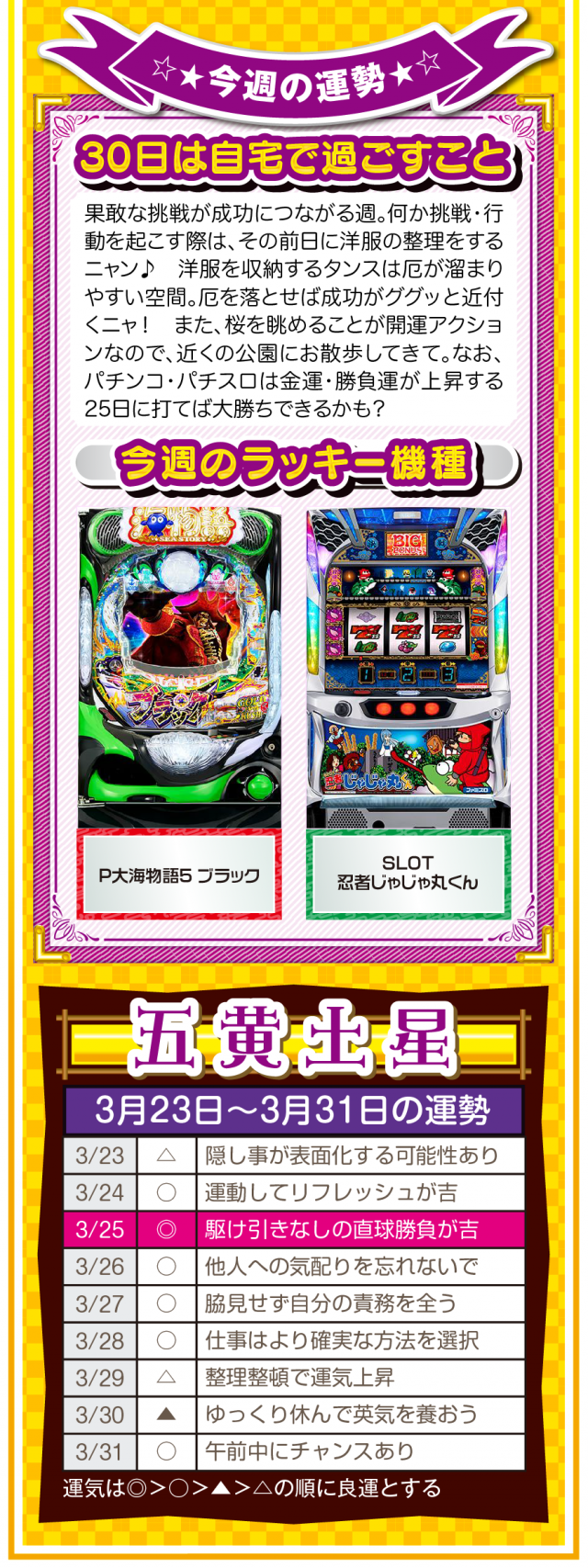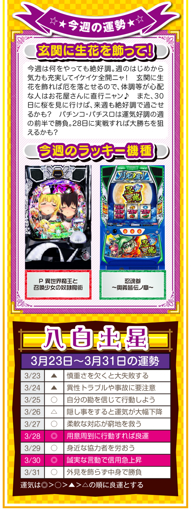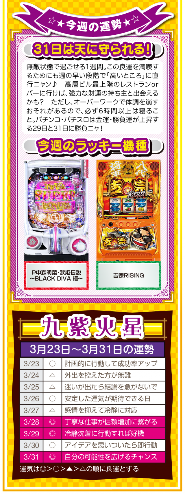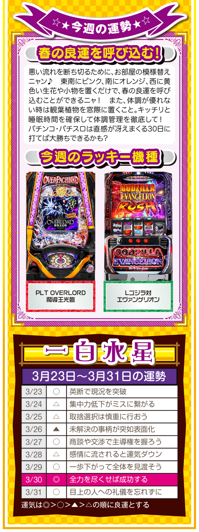 だから困難から逃げず常に立ち向かう人は、人にも運にも恵まれる。困難から逃げる「思い通りの人生」からは「孤立」しか生まれないことを覚えておいてほしいニャン♪ というわけで早速、3月25日から31日の1週間を鑑定ニャ(それでも恋愛からは逃げたいフォー・チュンチュンが、オマケとして3月23日と24日の運勢も鑑定したニャン♡)!