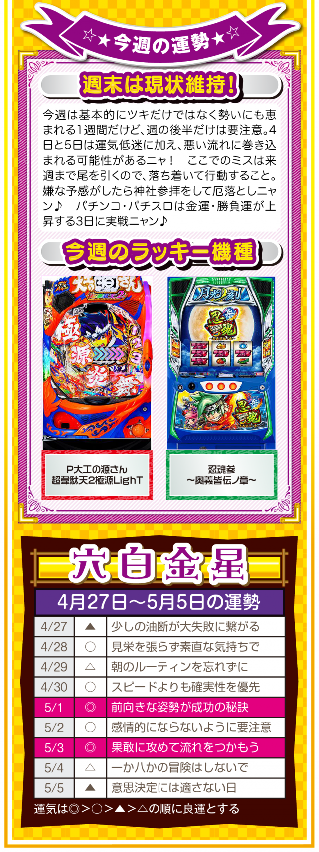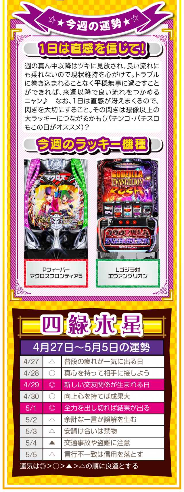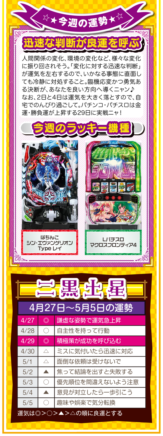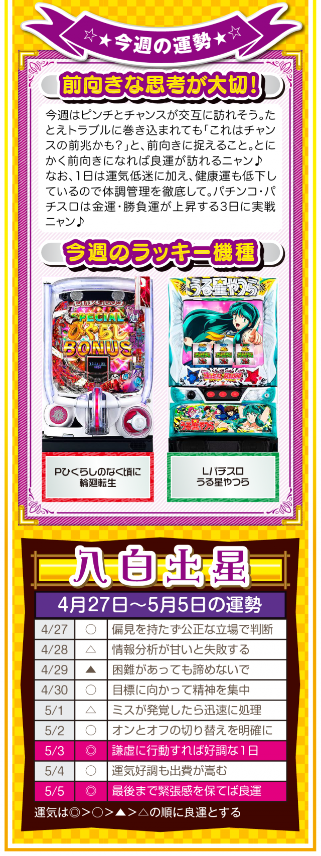 そう思えば動きも思考も軽くなり、知らず知らずのうちに運が味方することを覚えておいてほしいニャン♪ というわけで早速、4月29日から5月5日の1週間を鑑定ニャ(最近、運動不足で身体が重くなってきたので、筋トレを始めようと本気で考えているフォー・チュンチュンが、オマケとして4月27日と28日の運勢も鑑定したニャン♡)!