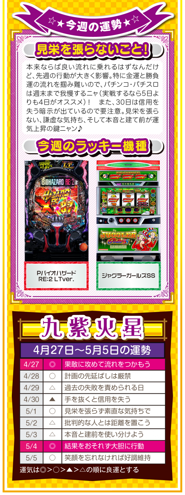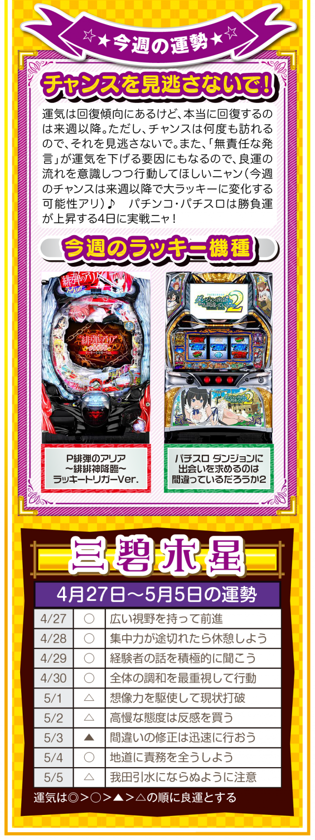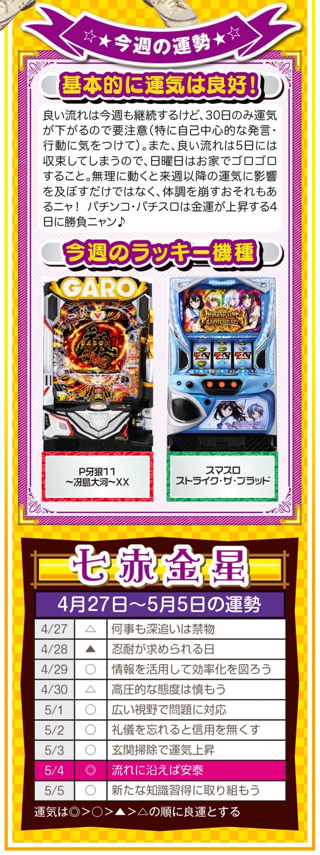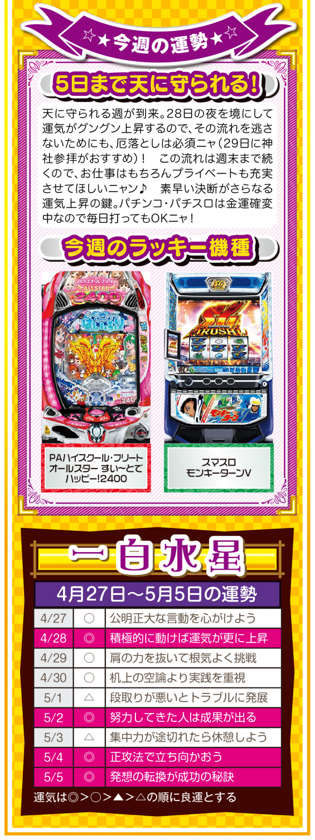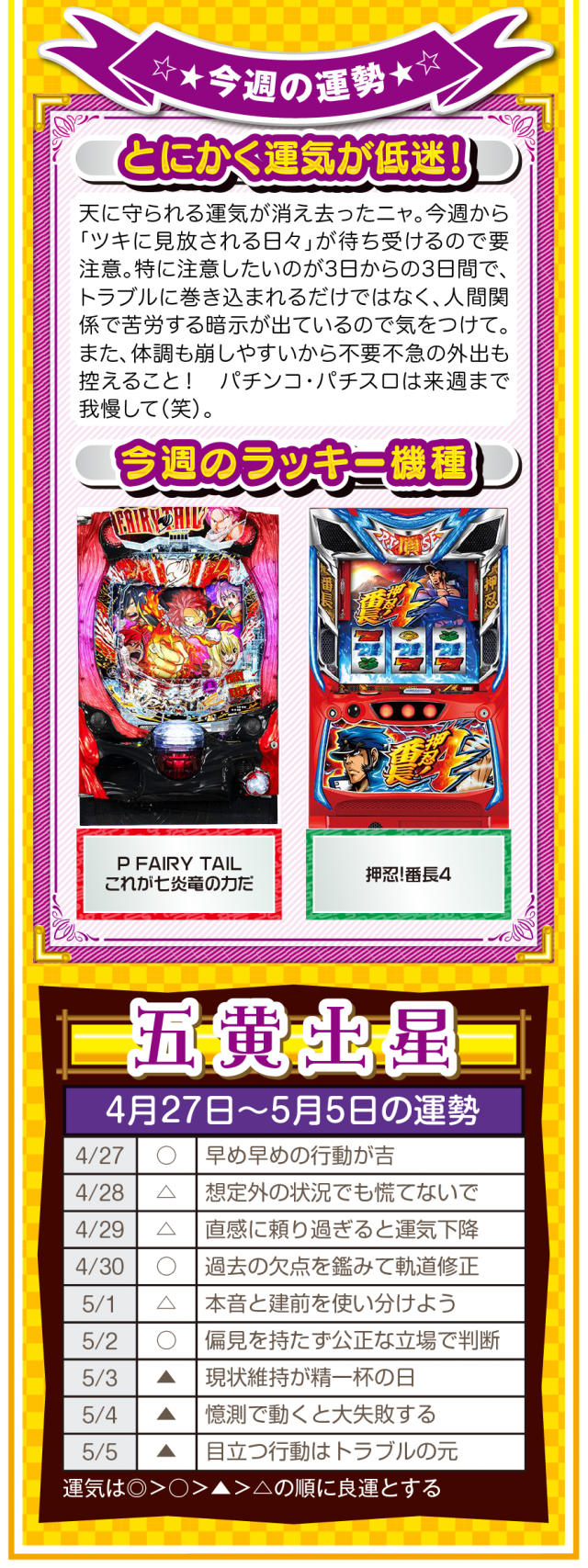 そう思えば動きも思考も軽くなり、知らず知らずのうちに運が味方することを覚えておいてほしいニャン♪ というわけで早速、4月29日から5月5日の1週間を鑑定ニャ(最近、運動不足で身体が重くなってきたので、筋トレを始めようと本気で考えているフォー・チュンチュンが、オマケとして4月27日と28日の運勢も鑑定したニャン♡)!