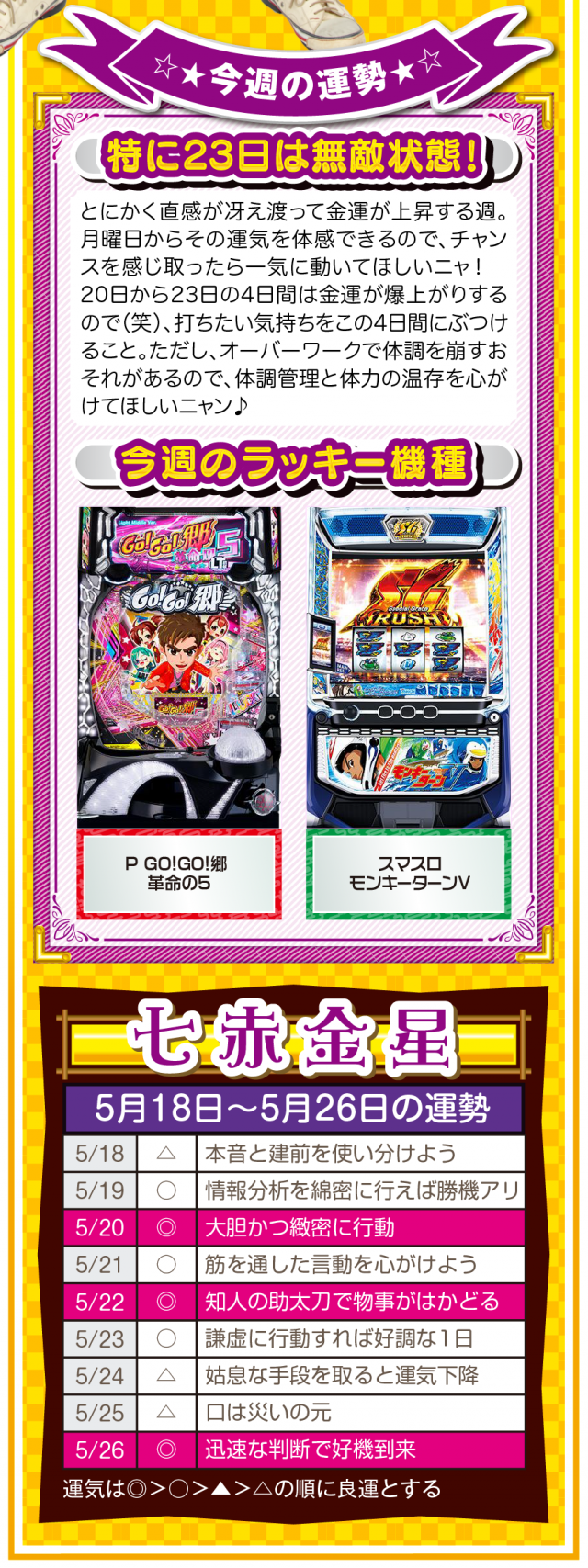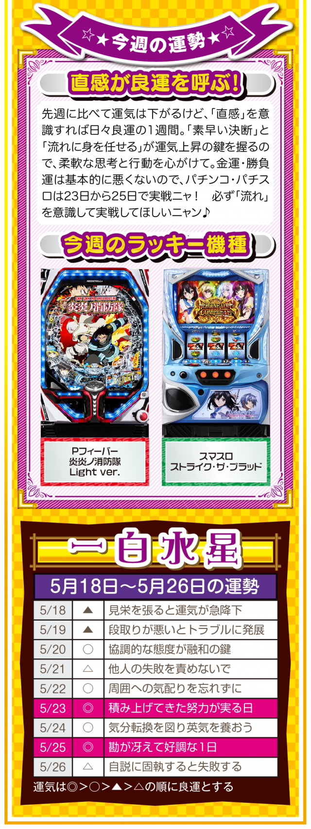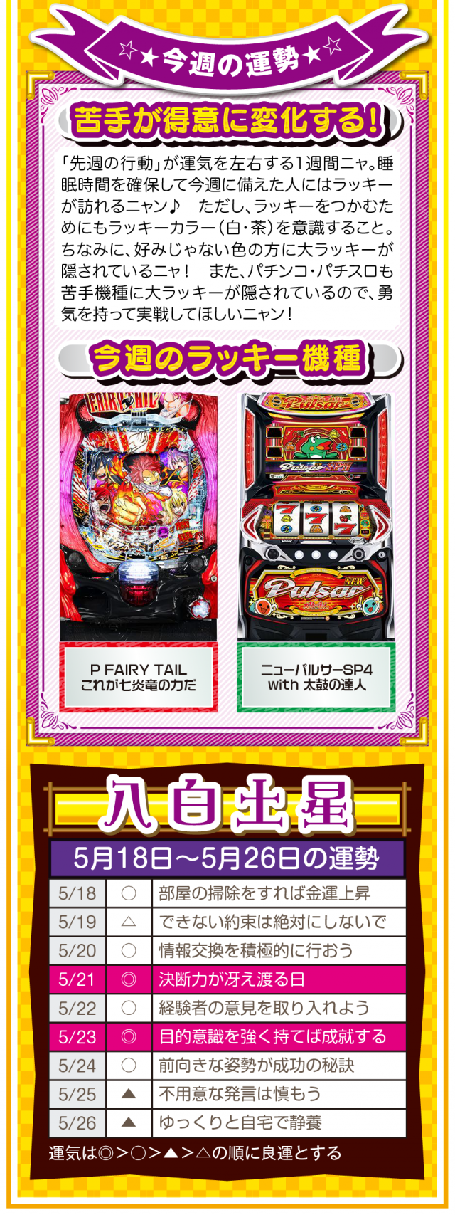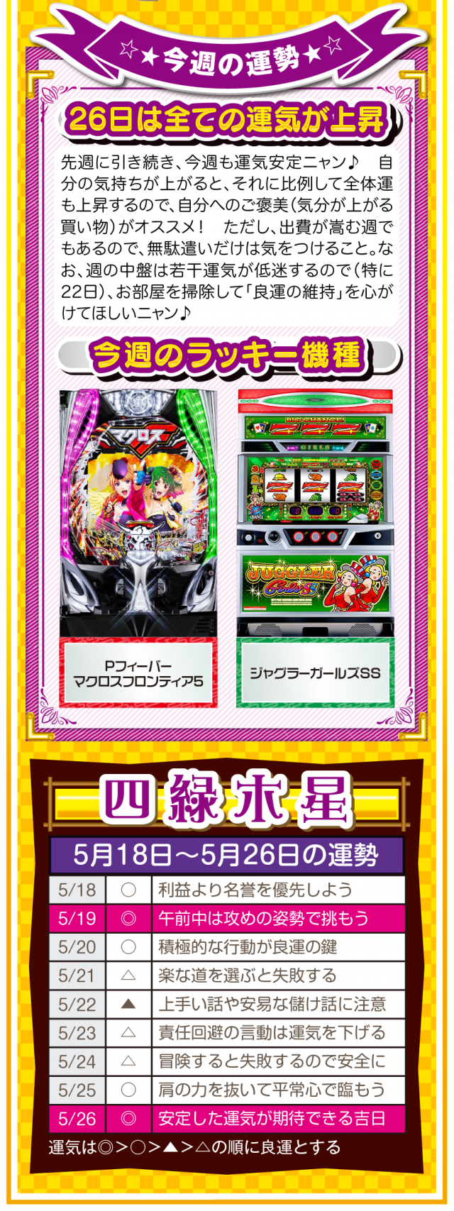 流れが悪いと思ったら、ひたすら動く。動けば運命も変わることを覚えておいてほしいニャン♪ というわけで早速、5月20日から26日の1週間を鑑定ニャ(恋愛を前倒しで考えたいフォー・チュンチュンが、オマケとして5月18日と19日の運勢も鑑定したニャン♡)!