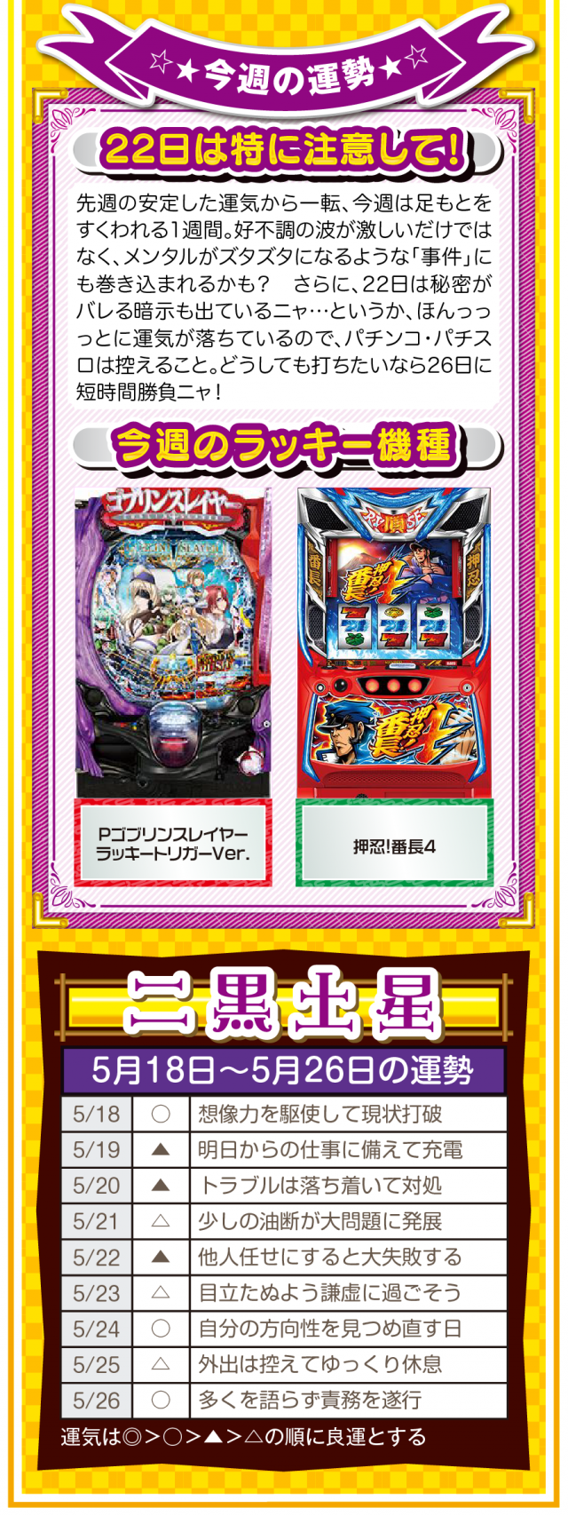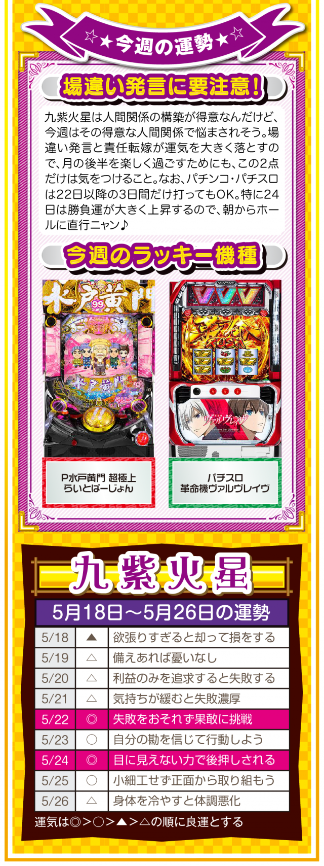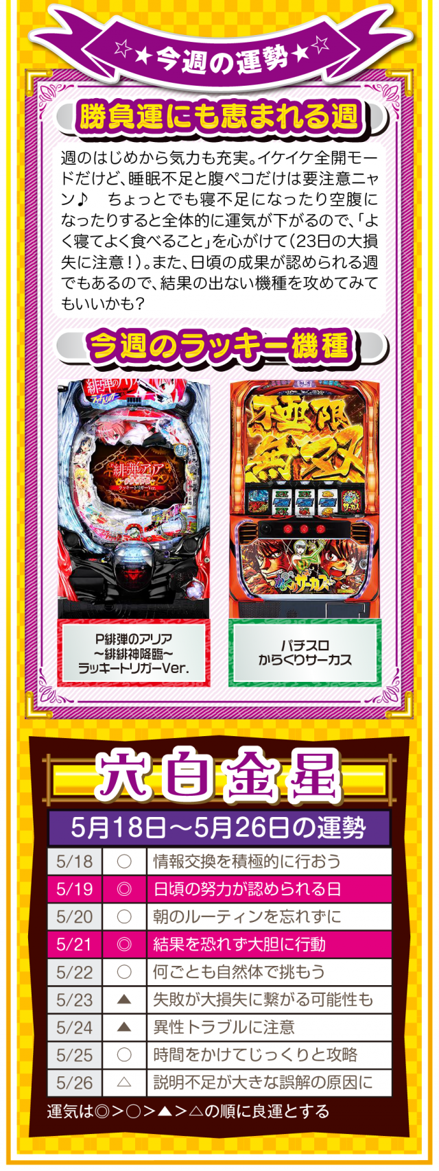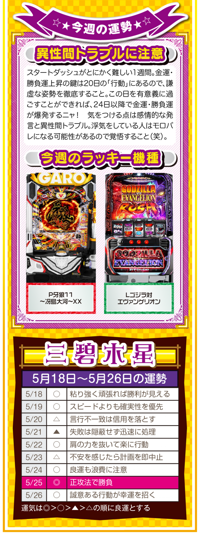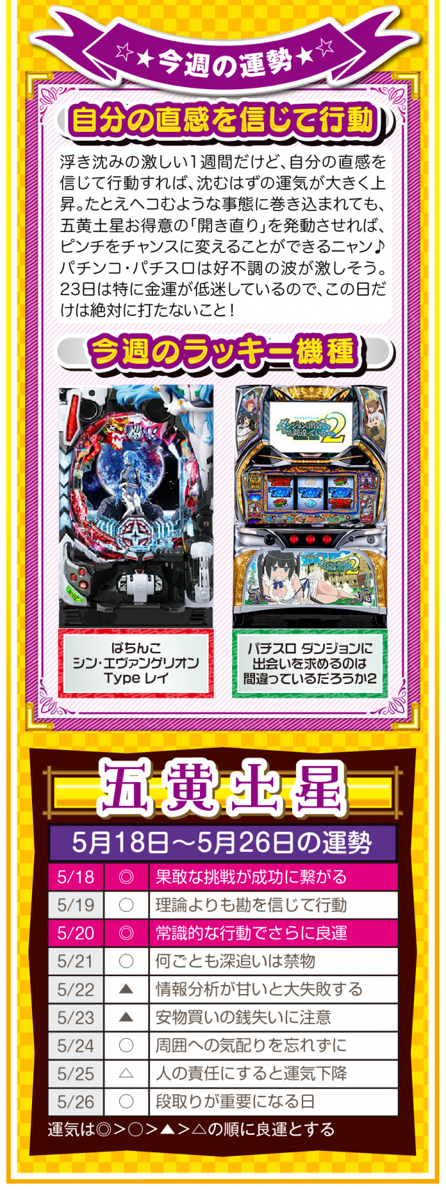 流れが悪いと思ったら、ひたすら動く。動けば運命も変わることを覚えておいてほしいニャン♪ というわけで早速、5月20日から26日の1週間を鑑定ニャ(恋愛を前倒しで考えたいフォー・チュンチュンが、オマケとして5月18日と19日の運勢も鑑定したニャン♡)!