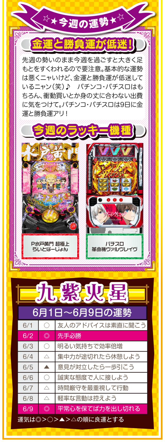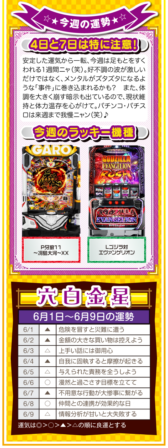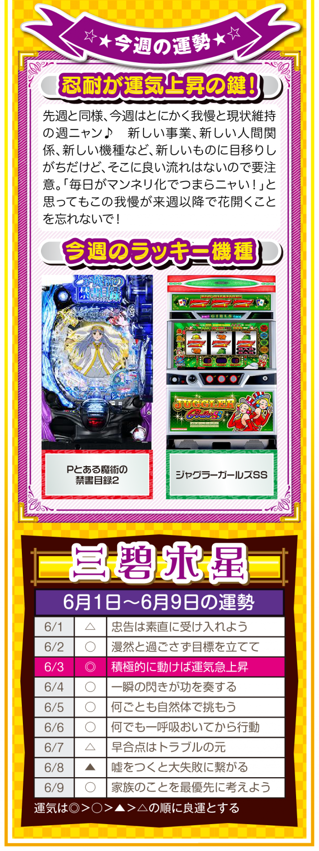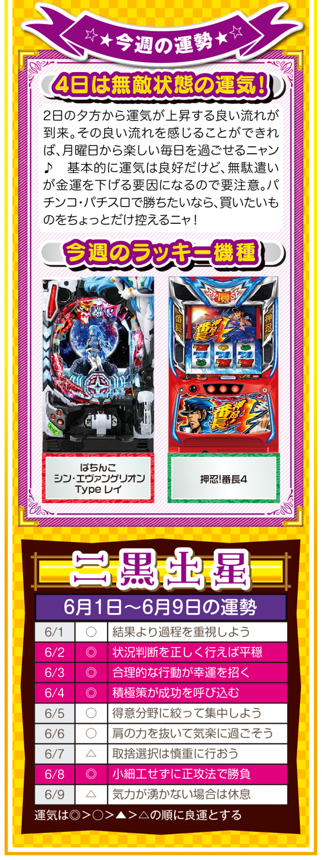自然に感謝して周囲に笑顔を届ければ、目覚めの良い朝を迎えられることを覚えておいてほしいニャン♪ というわけで早速、6月3日から9日の1週間を鑑定ニャ(ベイスターズの調子が悪くて笑顔になれないフォー・チュンチュンが、オマケとして1日と2日の運勢も鑑定したニャン♡)!