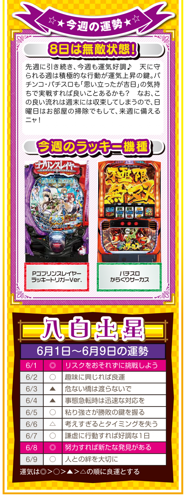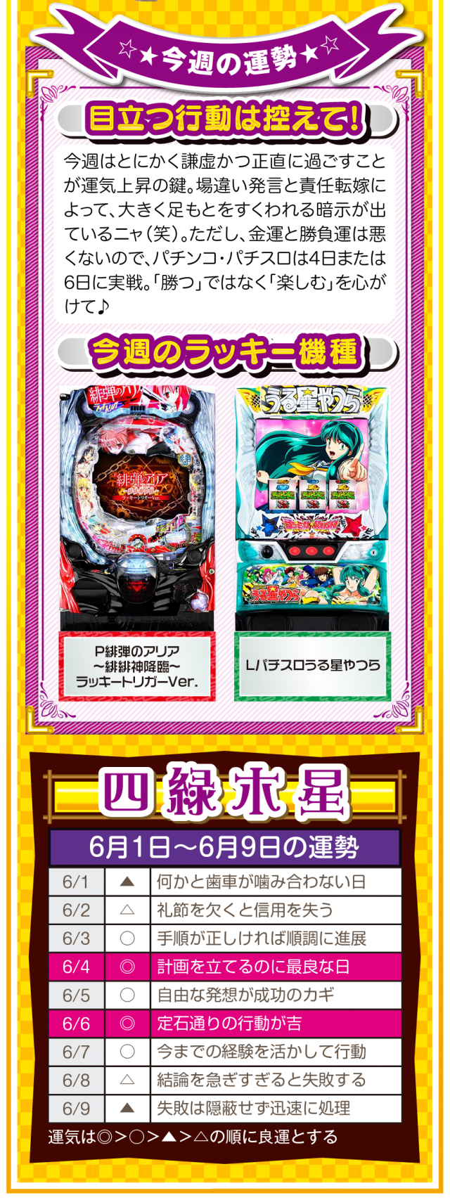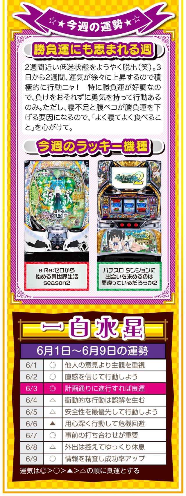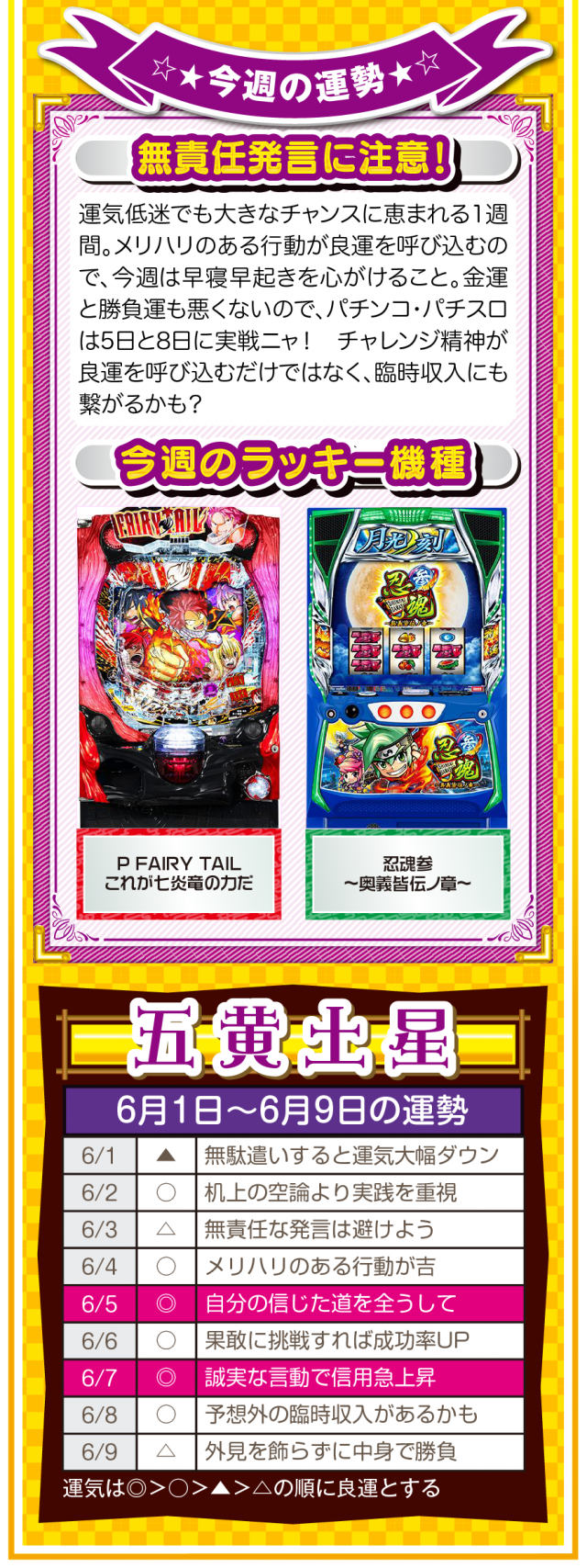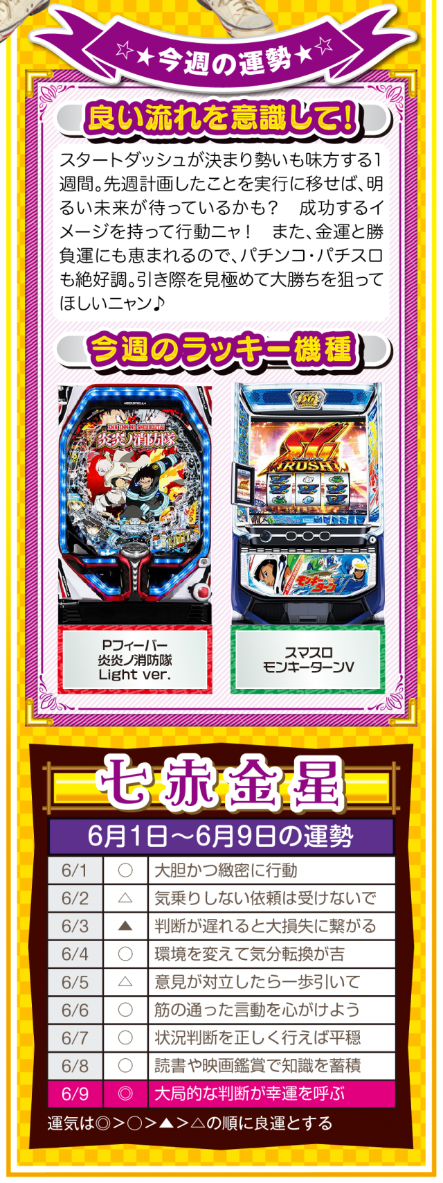 自然に感謝して周囲に笑顔を届ければ、目覚めの良い朝を迎えられることを覚えておいてほしいニャン♪ というわけで早速、6月3日から9日の1週間を鑑定ニャ(ベイスターズの調子が悪くて笑顔になれないフォー・チュンチュンが、オマケとして1日と2日の運勢も鑑定したニャン♡)!