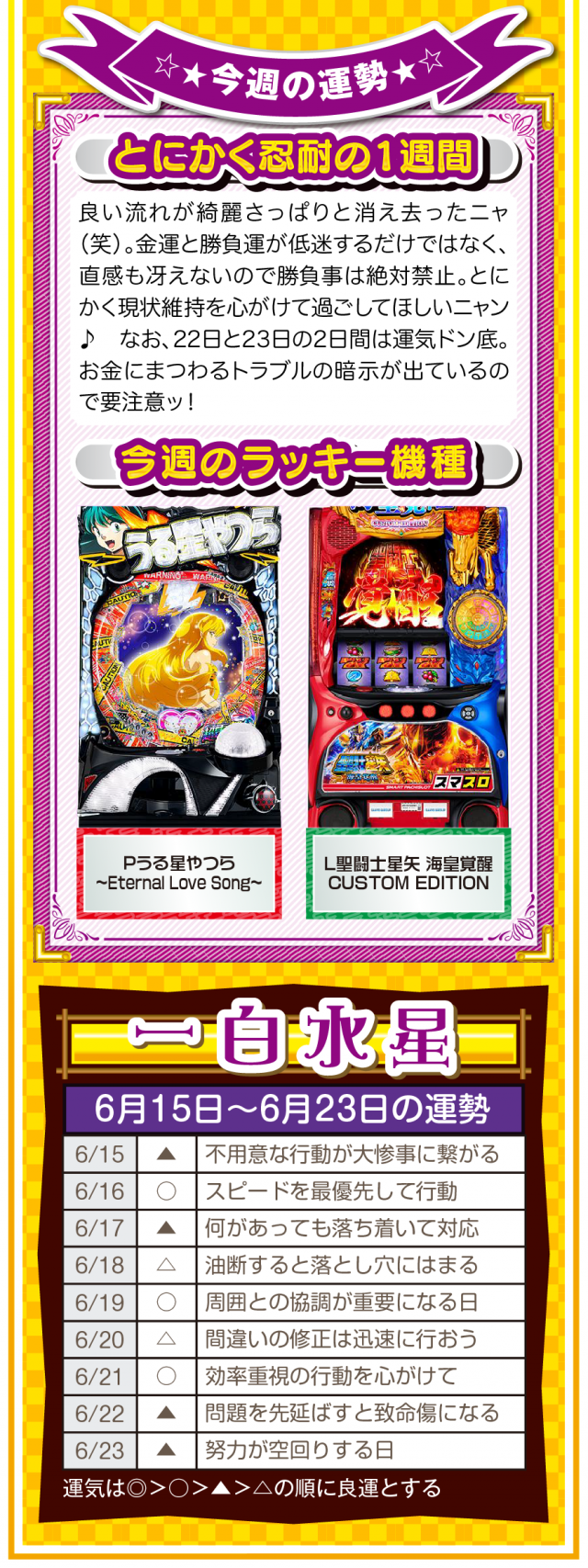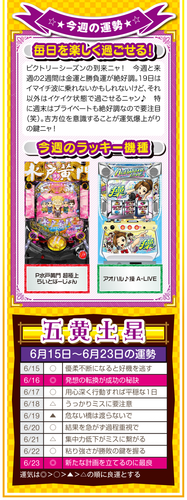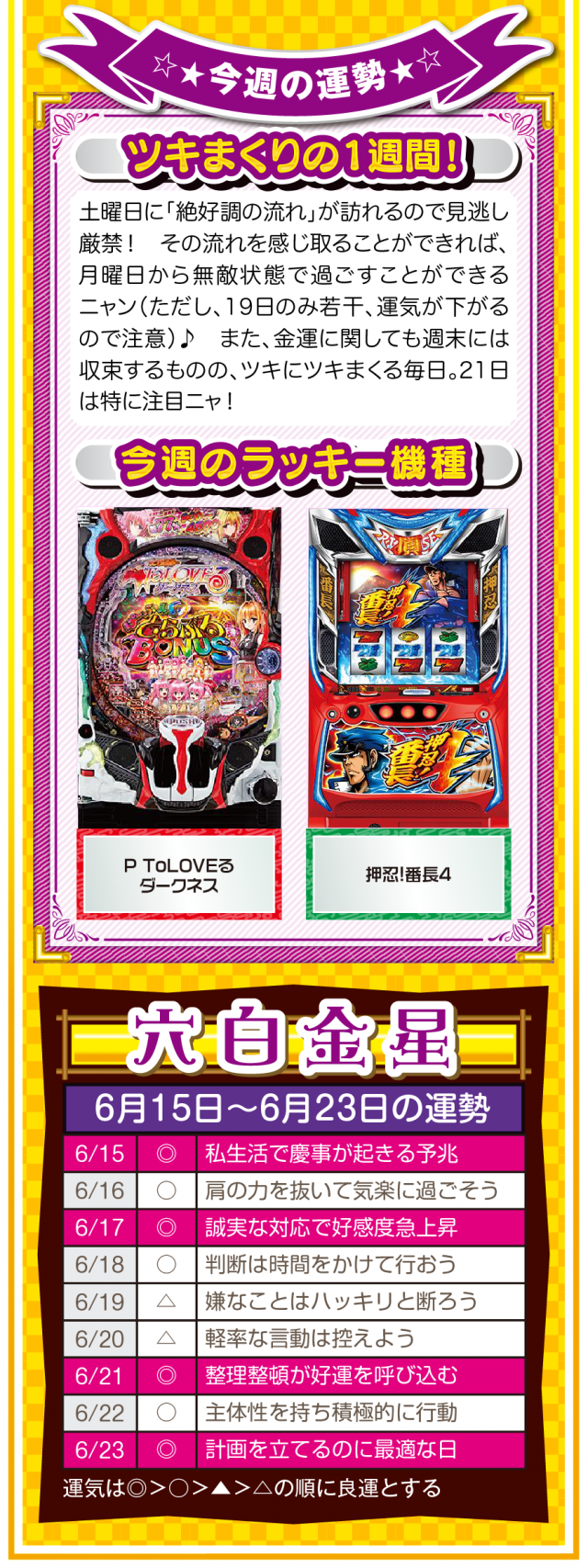 だから、話し上手の人が「ちょっと流れが悪いかも?」と思ったら聞き上手を意識すること。素敵な聞き役に徹すれば、仕事も恋愛も良い方向に導かれることを覚えておいてほしいニャン♪ というわけで早速、6月17日から23日の1週間を鑑定ニャ(恋愛相手には聞き役になれないフォー・チュンチュンが、オマケとして15日と16日の運勢も鑑定したニャン♡)!