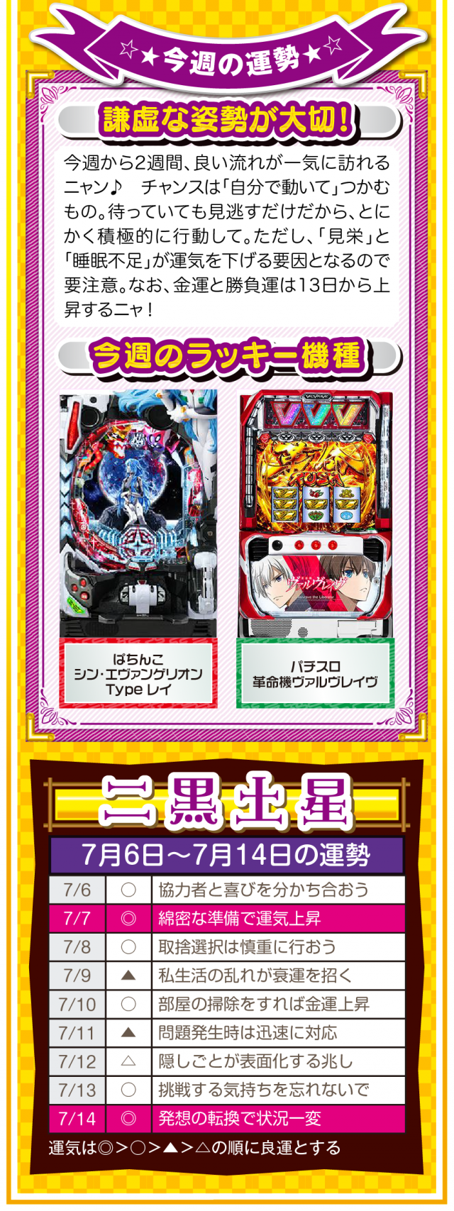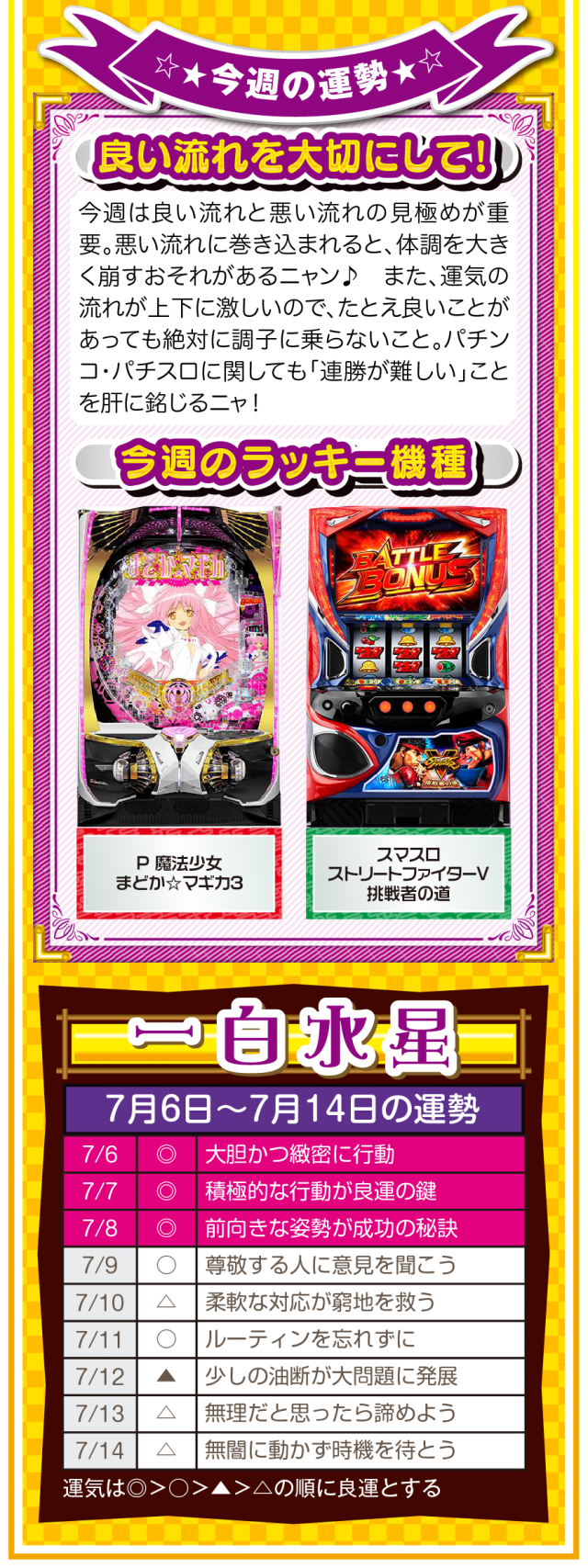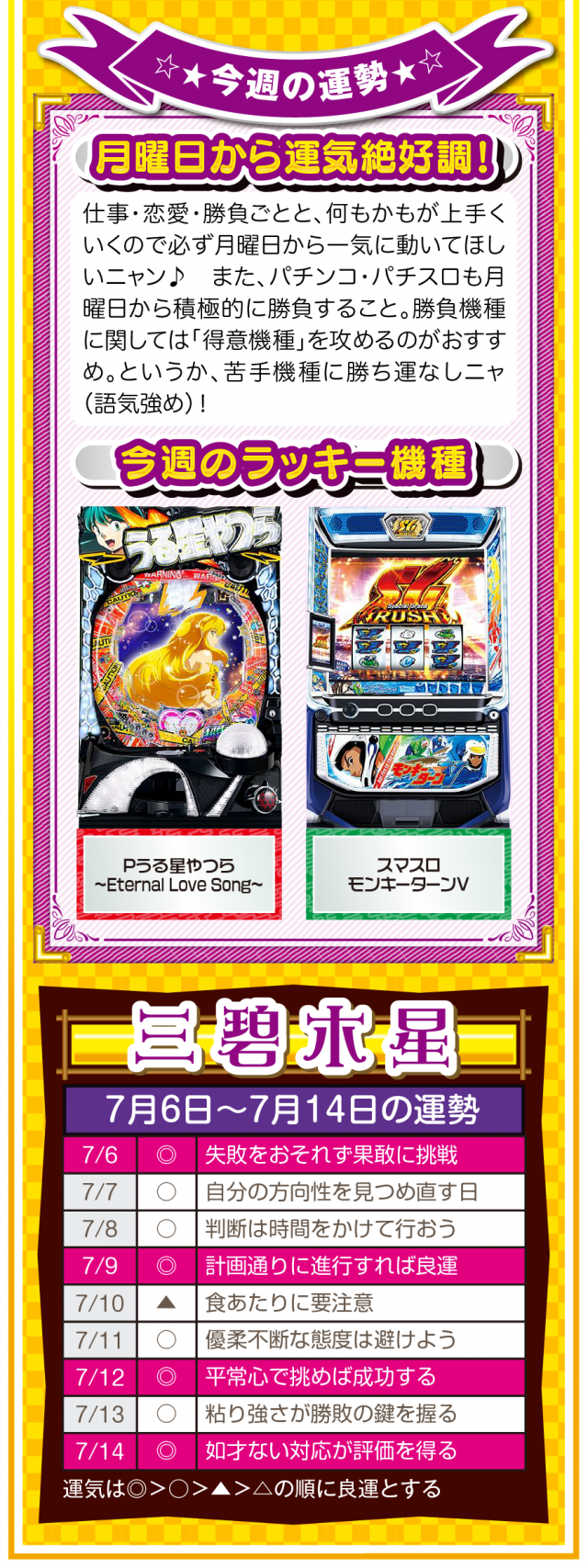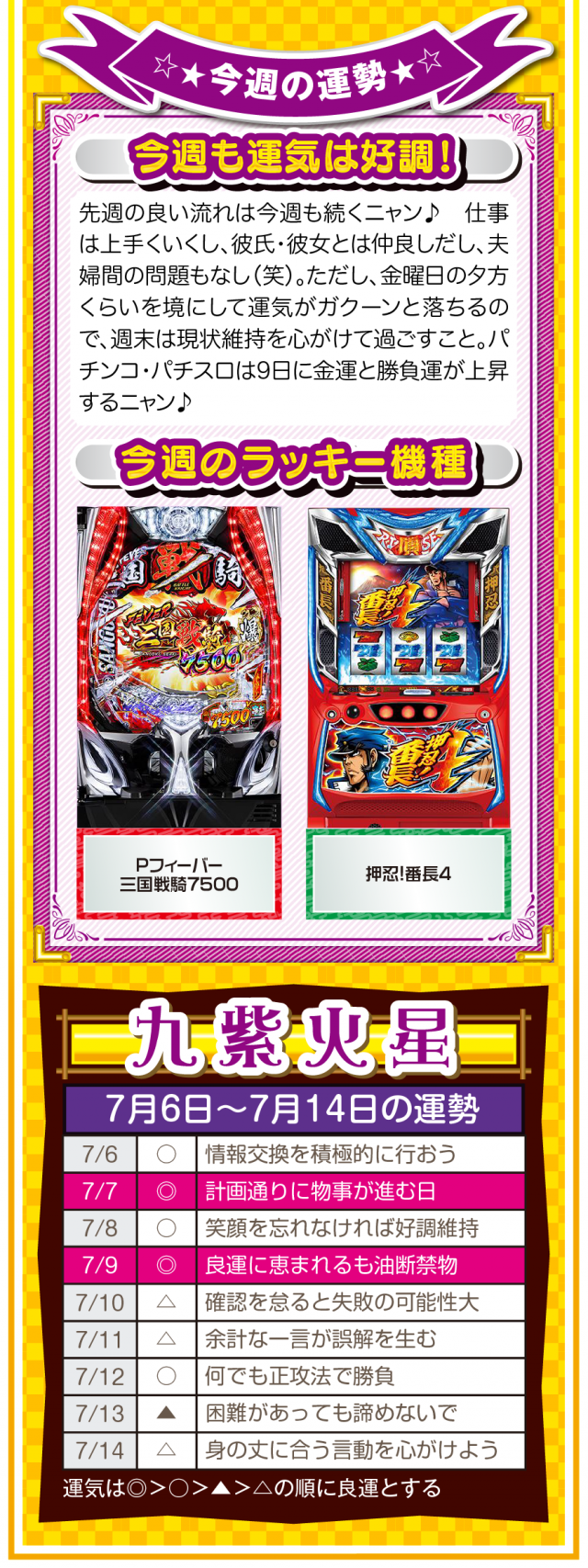 孤立と孤独から良運など生まれるわけもなく、開運に導かれることもない。そうならないためにも、自分の時間を他人のために使うこと。他人のことを考えて生きれば自然と視野が広がって、目の前のチャンスに触れる機会も多くなることを覚えておいてほしいニャン♪ というわけで早速、7月8日から7月14日の1週間を鑑定ニャ(誰に対しても我が儘全開のフォー・チュンチュンが、オマケとして6日と7日の運勢も鑑定したニャン♡)!
